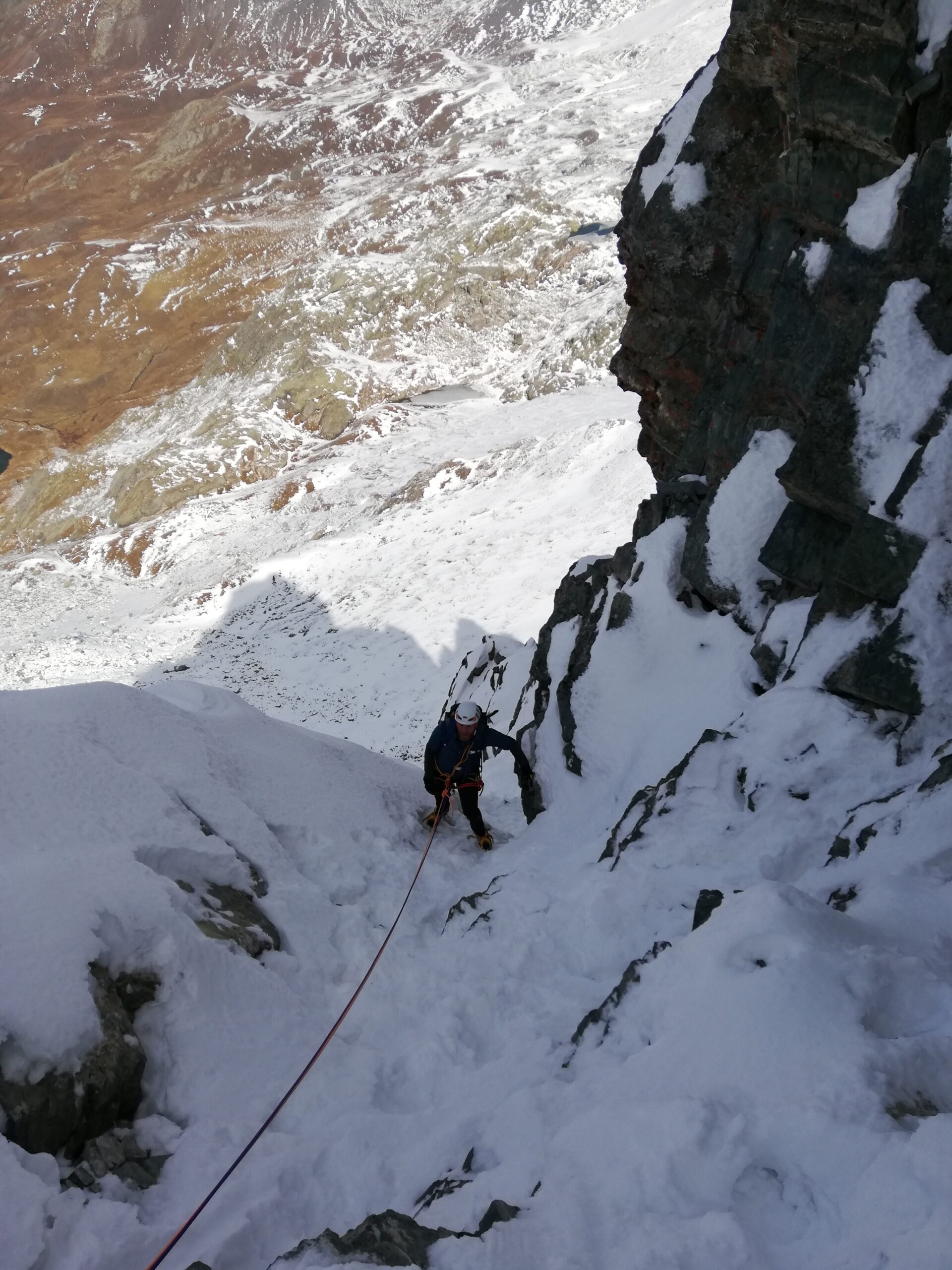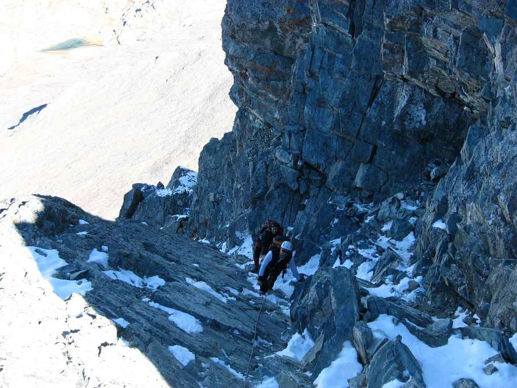 E’ più lunga e impegnativa della via normale, ma è preferibile qualora la normale fosse innevata o con ghiaccio, in quanto esposta a sud ovest e potenzialmente pulita. questa è leggermente innevata, poiché cambiando l’esposizione al sole ed al vuoto rimane fattibile in queste condizioni.