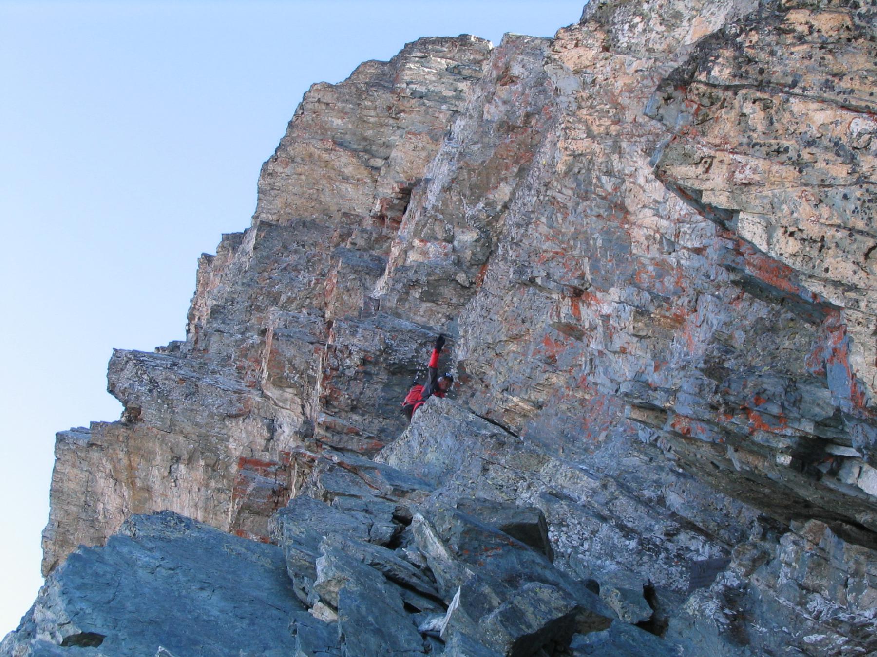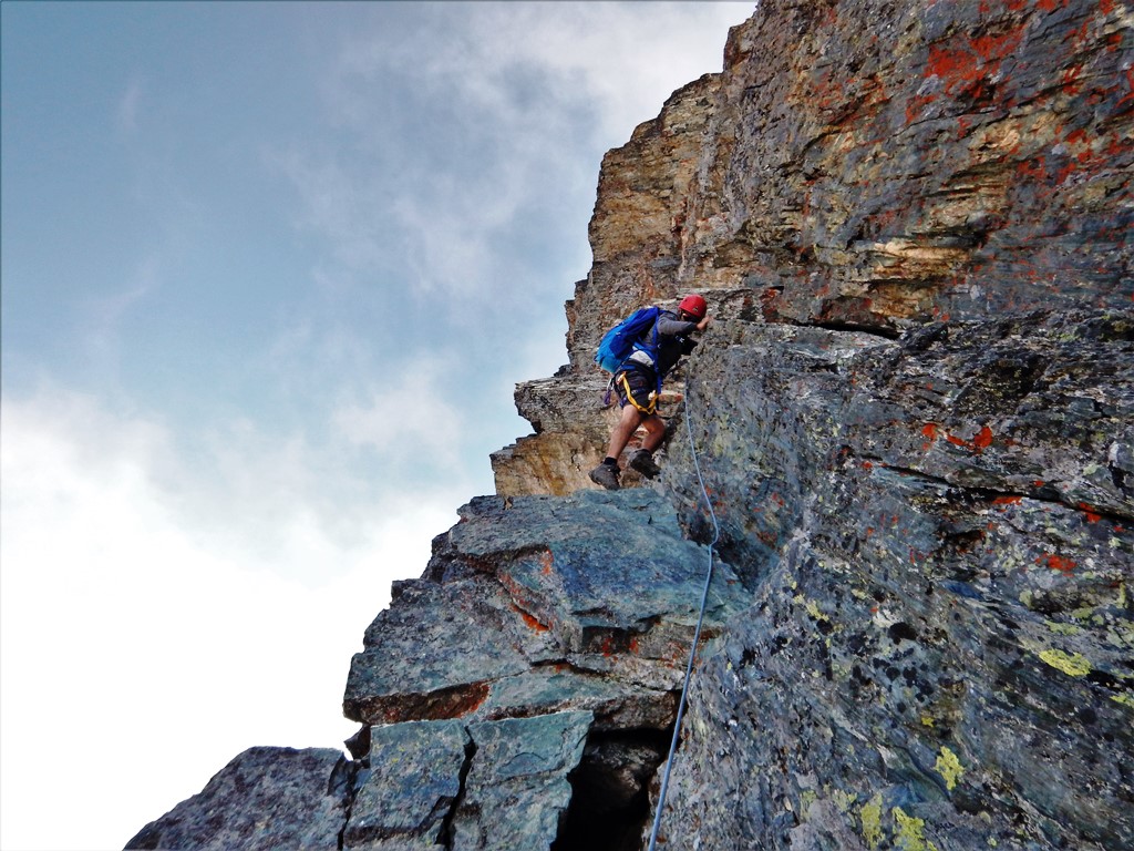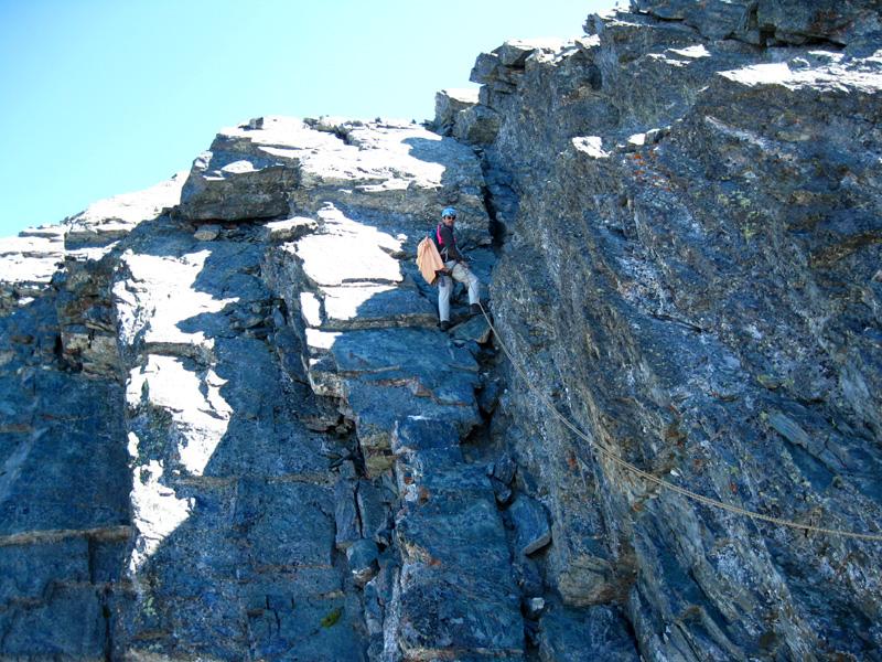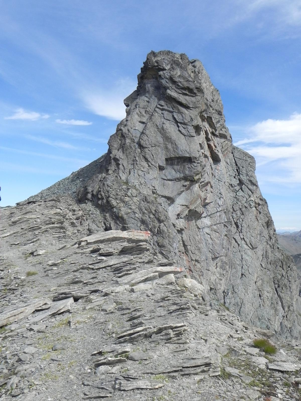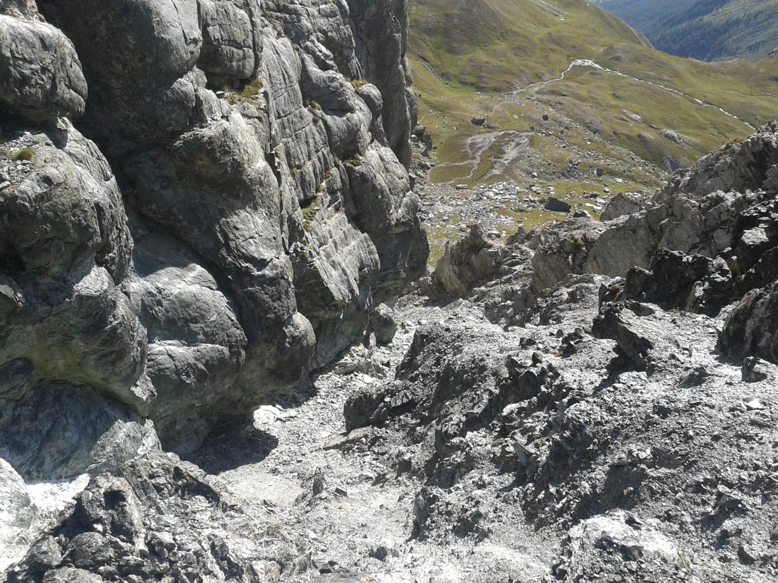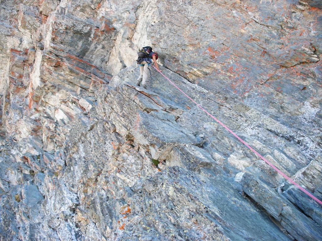 Si continua nella pietraia finchè si arriva ad una zona sotto la parete ovest, dove ha inizio una cengia diagonale. Sono presenti già da qui alcuni chiodi e moschettoni dove potersi assicurare. Terminata la breve cengia si incontra il passaggio chiave della salita (ma soprattutto della discesa), ovvero un muretto esposto (II+) da risalire che poi obbliga ad aggirare uno sperone su un terrazzino molto esposto, che consente di accedere ad un canalino sulla destra.