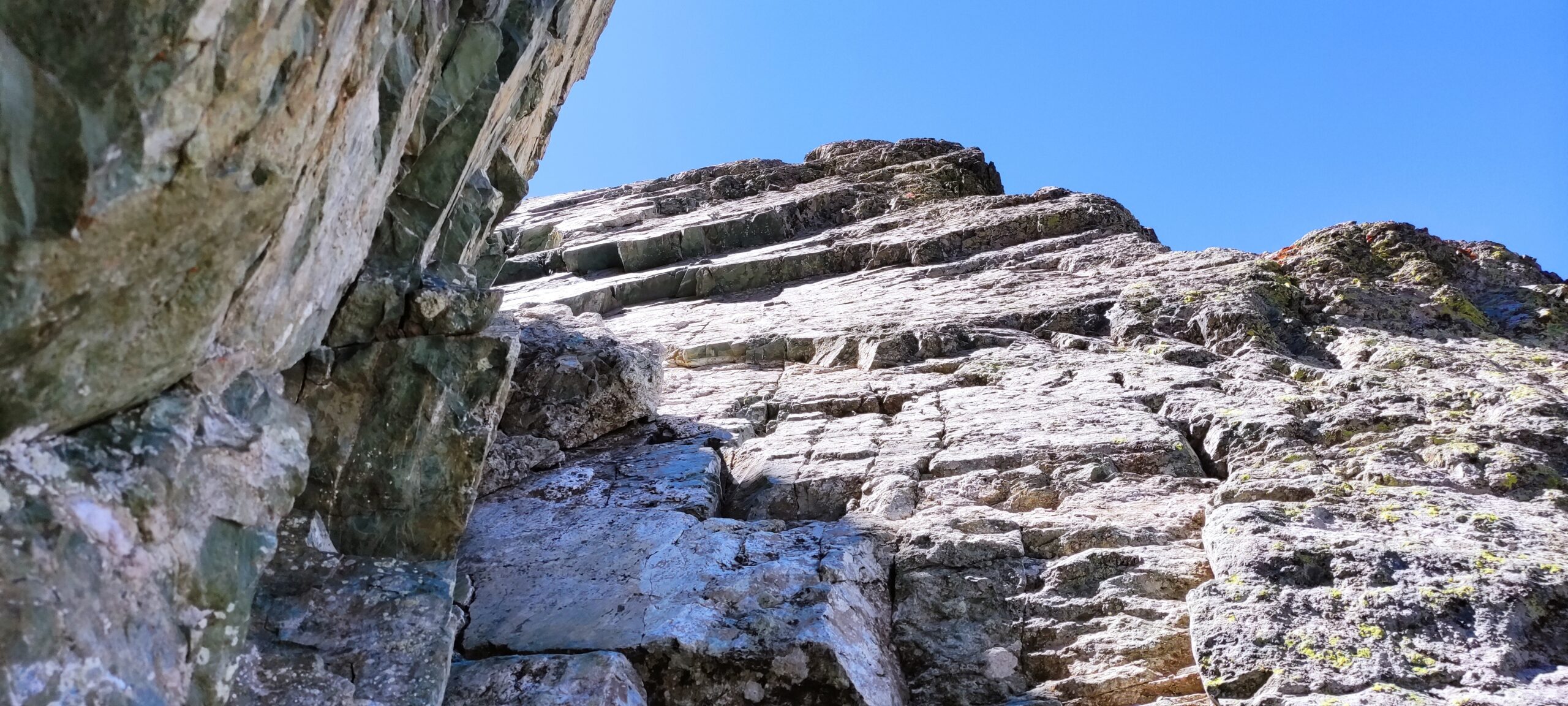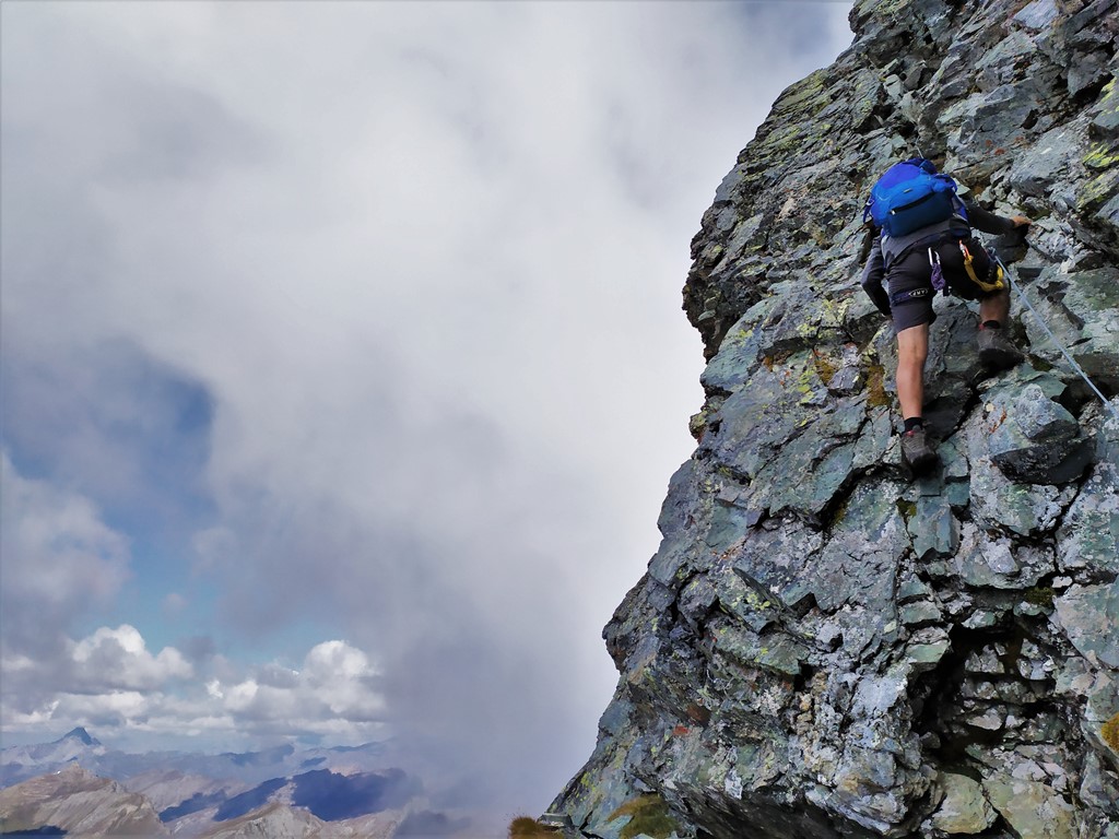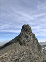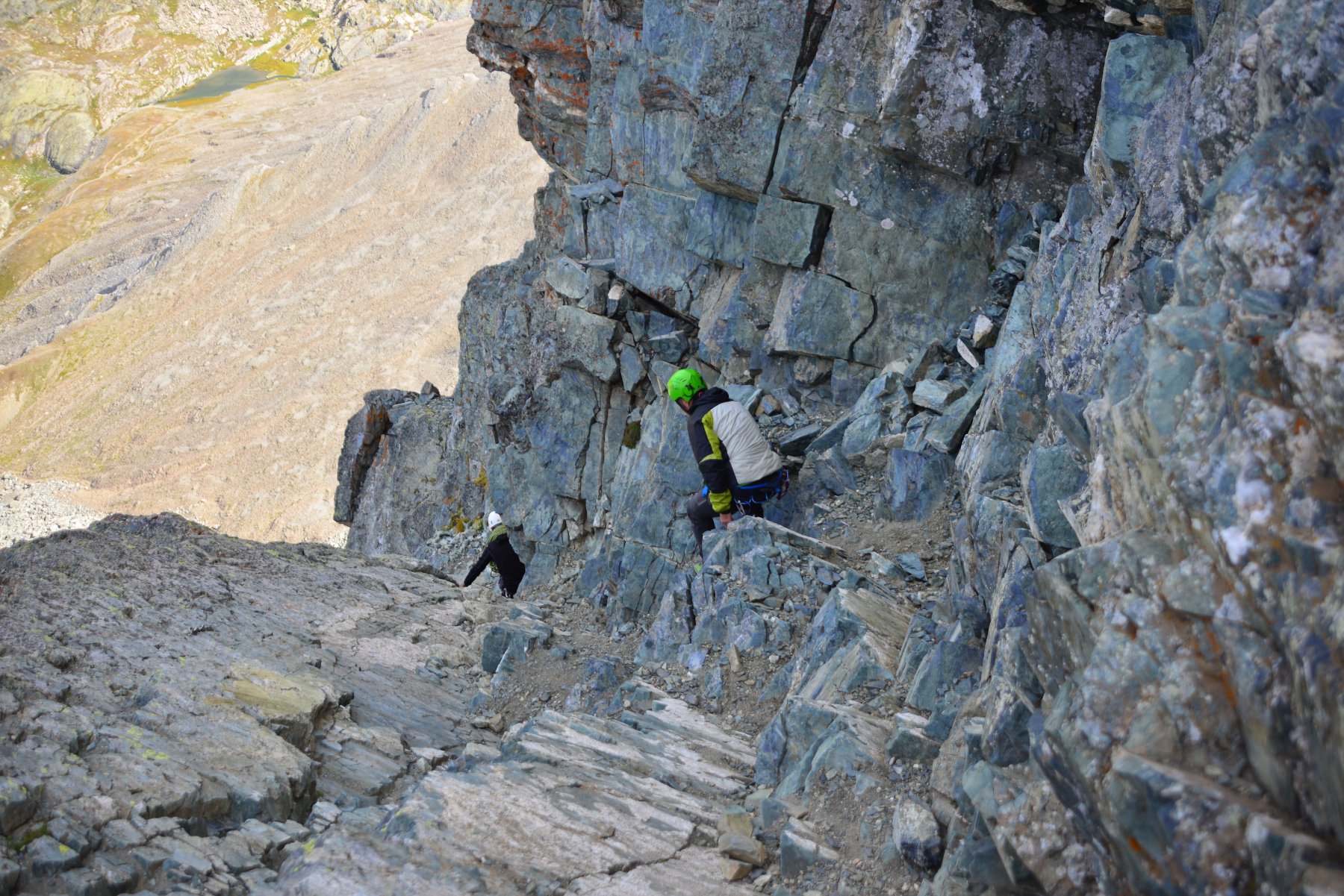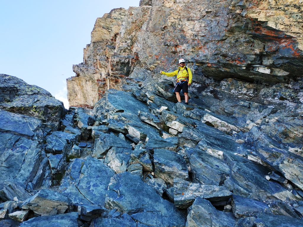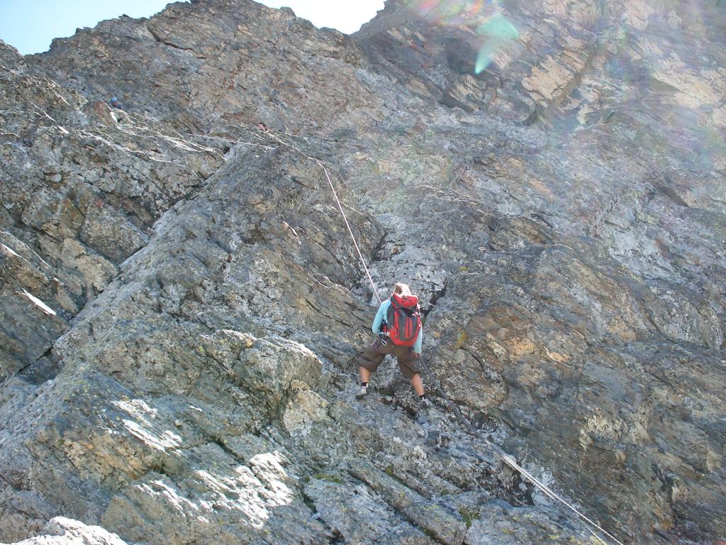 Si continua nella pietraia finchè si arriva ad una zona sotto la parete ovest, dove ha inizio una cengia diagonale. Sono presenti già da qui alcuni chiodi e moschettoni dove potersi assicurare. Terminata la breve cengia si incontra il passaggio chiave della salita (ma soprattutto della discesa), ovvero un muretto esposto (II+) da risalire che poi obbliga ad aggirare uno sperone su un terrazzino molto esposto, che consente di accedere ad un canalino sulla destra.