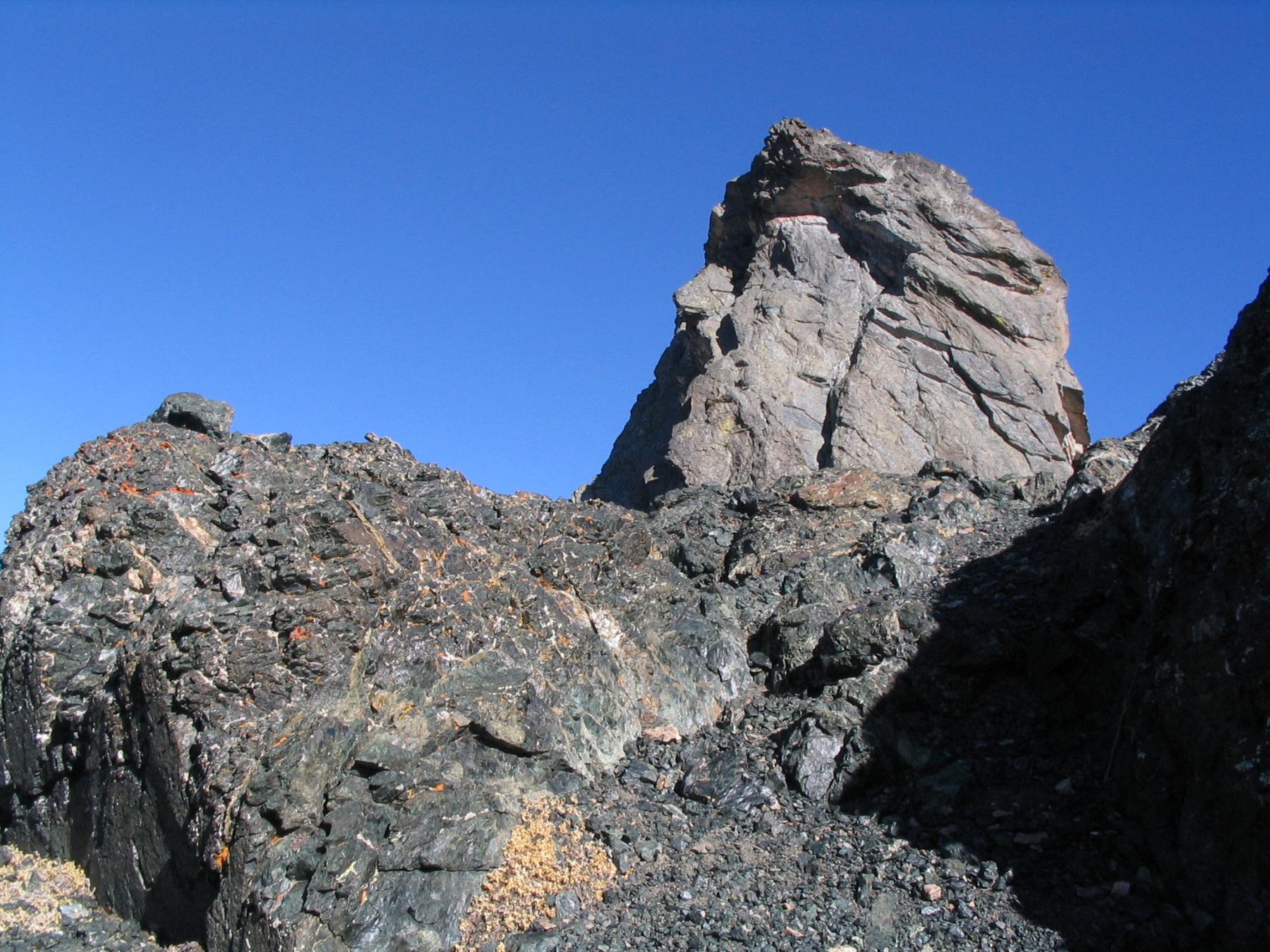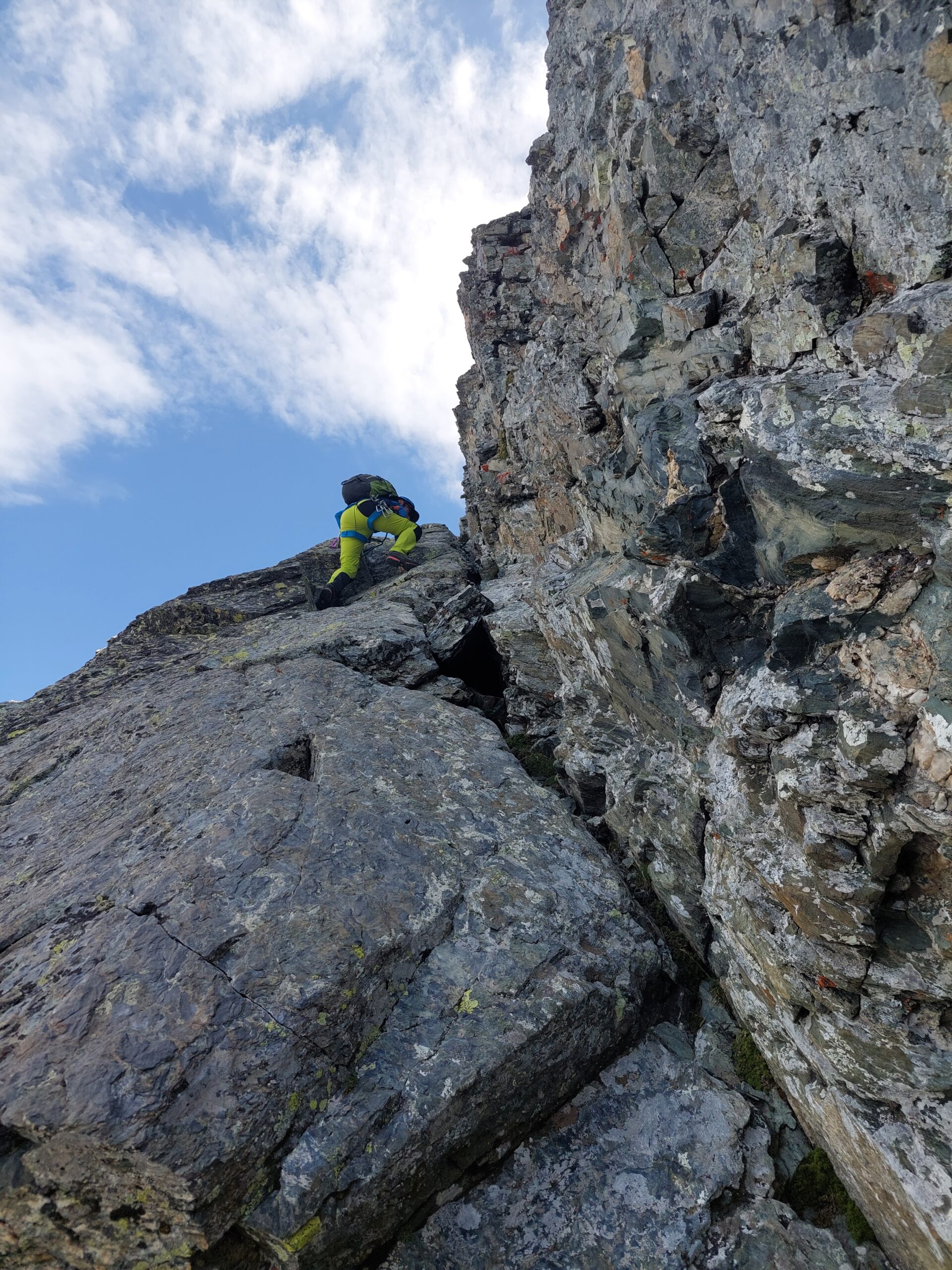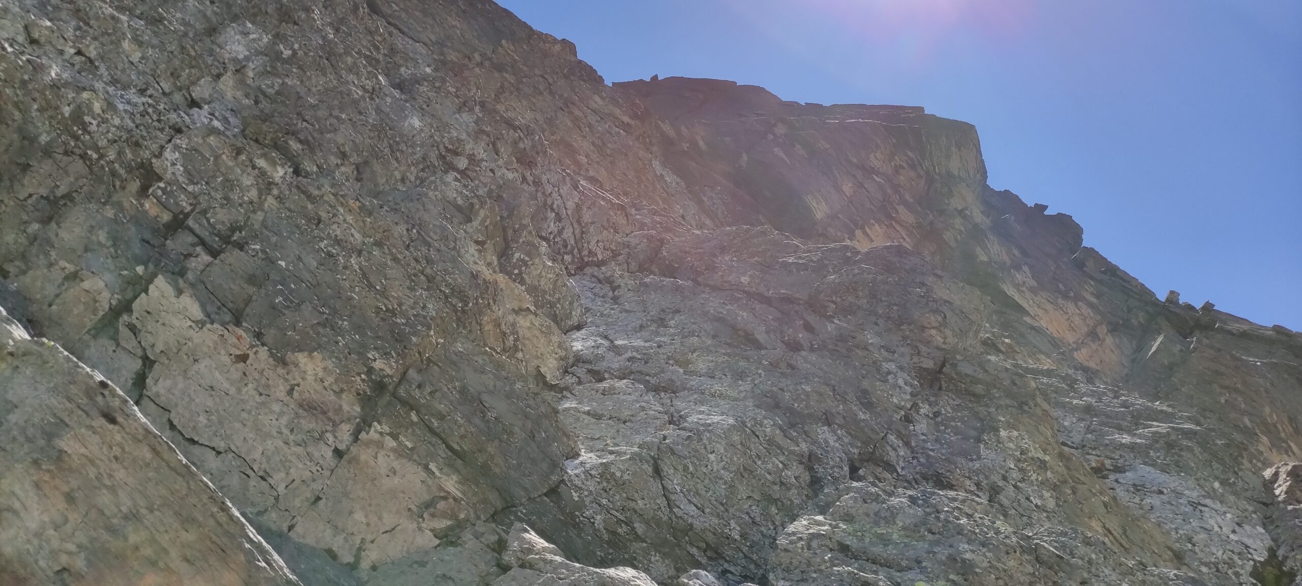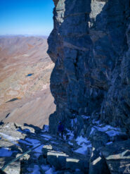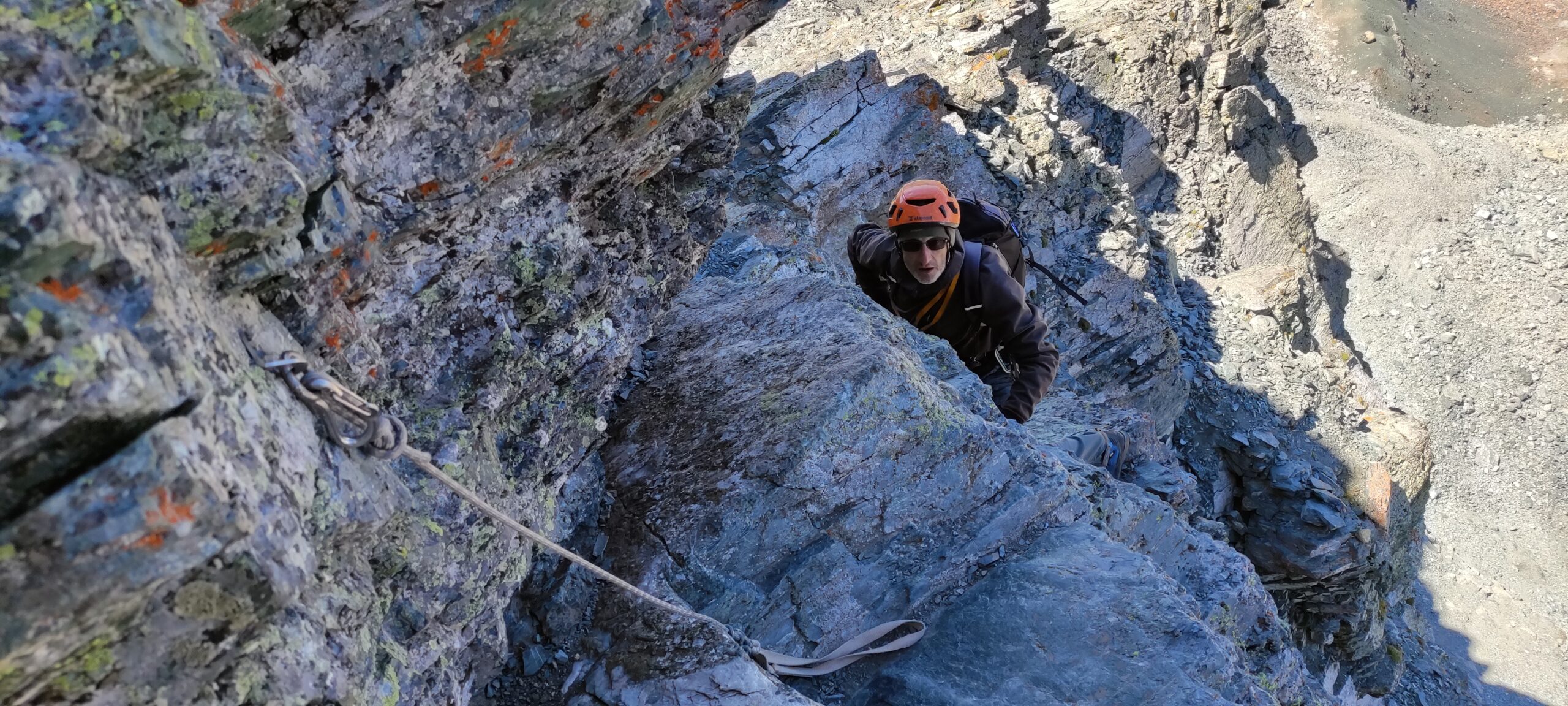 Si continua nella pietraia finchè si arriva ad una zona sotto la parete ovest, dove ha inizio una cengia diagonale. Sono presenti già da qui alcuni chiodi e moschettoni dove potersi assicurare. Terminata la breve cengia si incontra il passaggio chiave della salita (ma soprattutto della discesa), ovvero un muretto esposto (II+) da risalire che poi obbliga ad aggirare uno sperone su un terrazzino molto esposto, che consente di accedere ad un canalino sulla destra.
