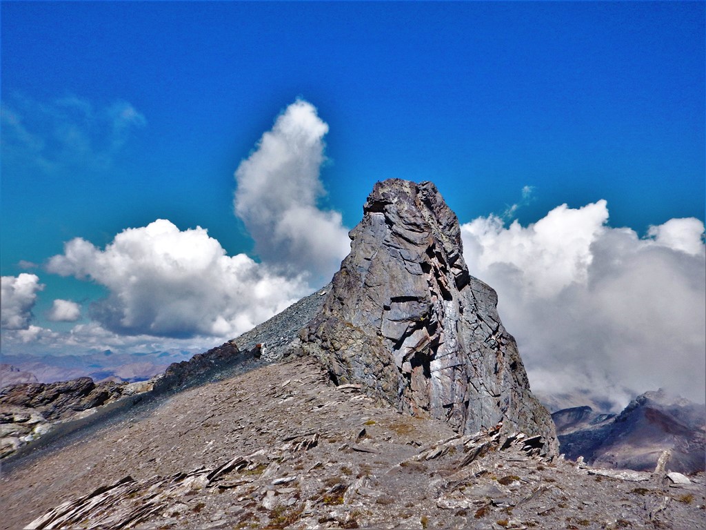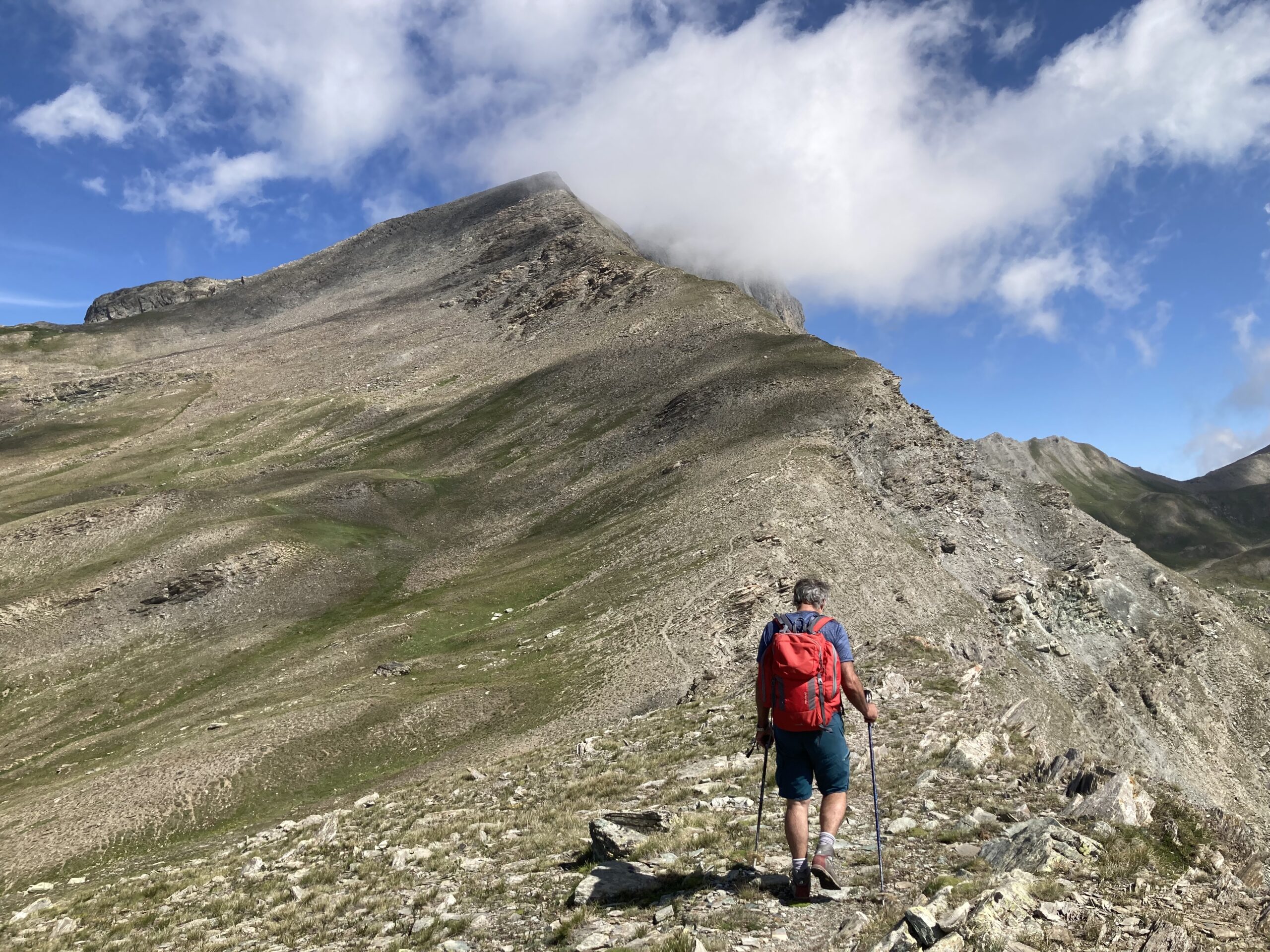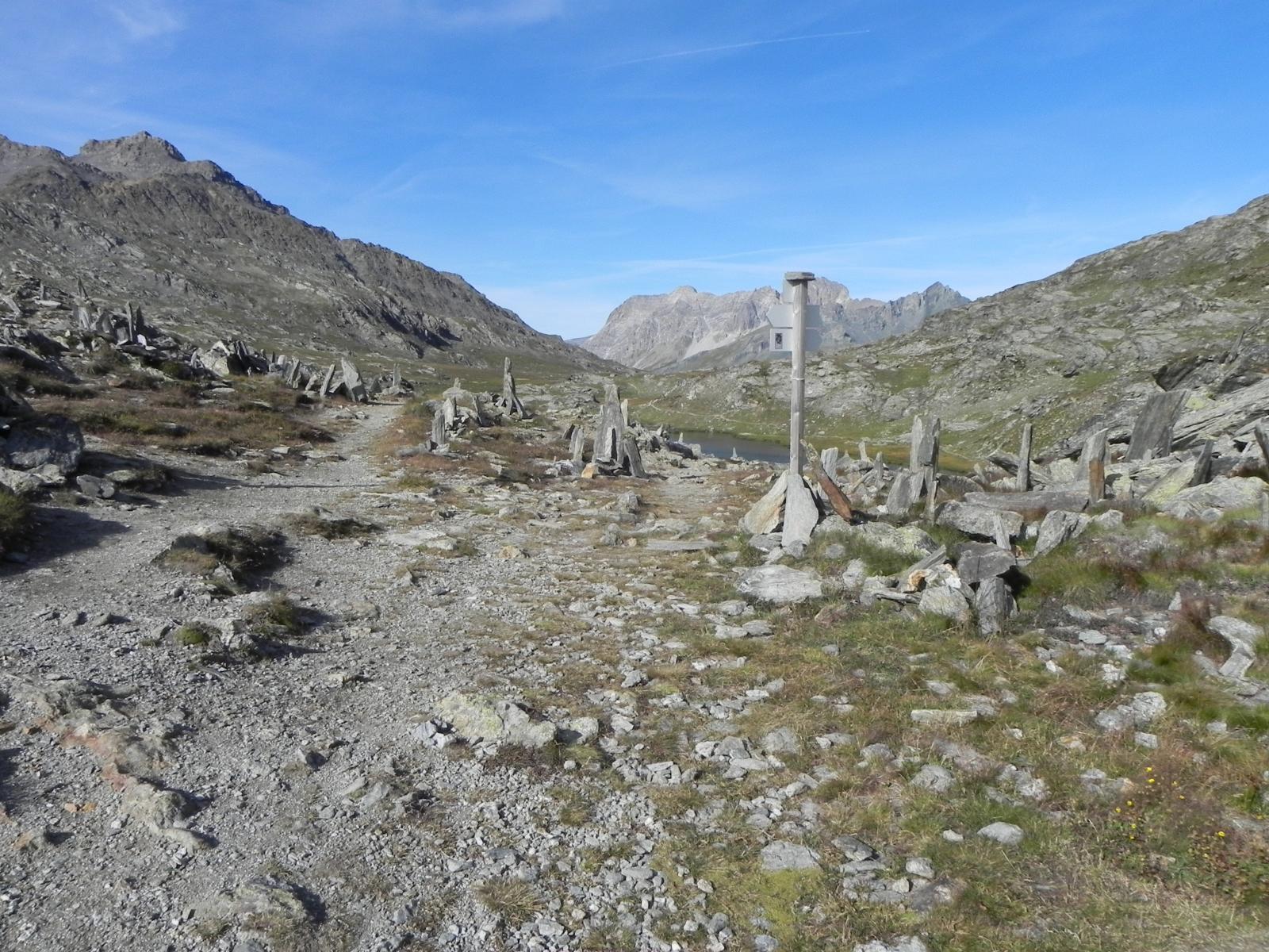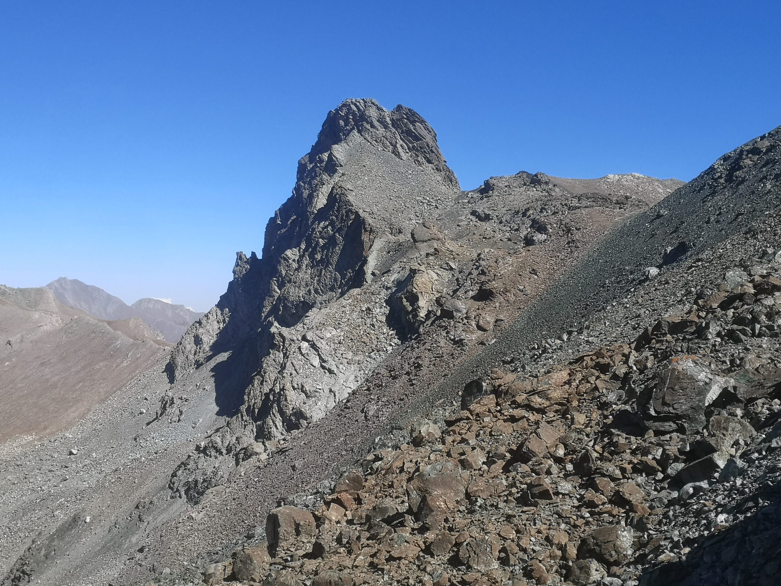 Raggiunto il culmine del crestone, in una zona di terra nera con alcuni roccioni, si scende leggermente alla depressione alla base del Roc della Niera, riprendendo poi la salita su marcata traccia che si snoda nella facile pietraia (percorso che si fa via via più ripido).