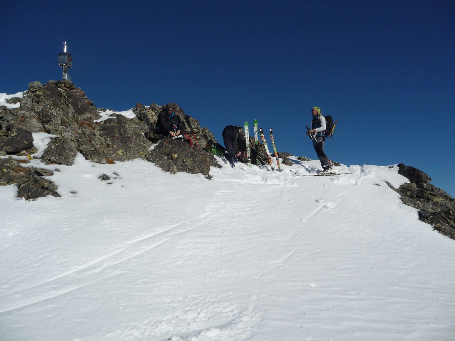 Si parte con cielo plumbeo e freddo pungente, parte centrale nell’ovatta con visibiltà ridotissima e nessuna traccia. A circa 2500 si sbuca al sole… Nella parte centrale il GPS aiuta ma la traccia rivista scendendo non è proprio perfetta :)… In vetta sci ai piedi e discesa prima parte su farina leggera, parte centrale un po’ lavorata dal vento ma sempre sciabile parte bassa con croste varie, valanghe ghiacciate ecc…