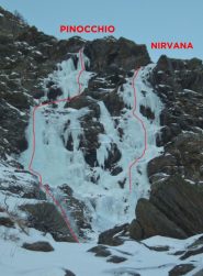 Lasciata l’auto davanti alla costruzione in cemento della centralina dell’acqua si prosegue per carrozzabile fino ad un bivio (grandi valanghe lungo il percorso); da qui si prende a dx e si risalgono i tornanti della strada oppure lungo i pendii svalangati in direzione Nord; si lascia sulla destra il canale di Pantegana; la colata è ben visibile e prende il sole al mattino fino verso le 12-13; sulla sx la variante Pinocchio