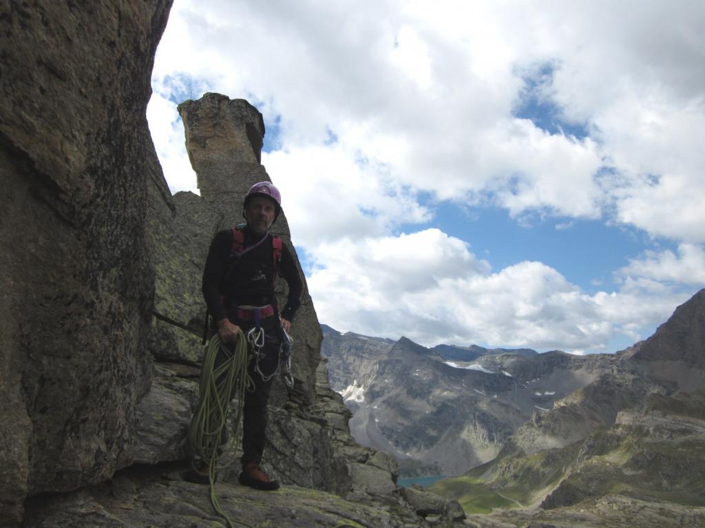 Io ero molto titubante poiché a causa dei miei problemi al polso sinistro arrampico non piú di una volta all’anno e ho deciso di effettuare tutta la traversata con il tutore al polso. Direi che é andata benissimo, nonostante il momento di pioggia e grandine quando eravamo nei pressi dei torrioni finali, siamo riusciti ad effettuare questa traversata. Ovviamente ho lasciato a Renato la Testa di Garibaldi, poiché io avrei dovuto sforzare troppo.