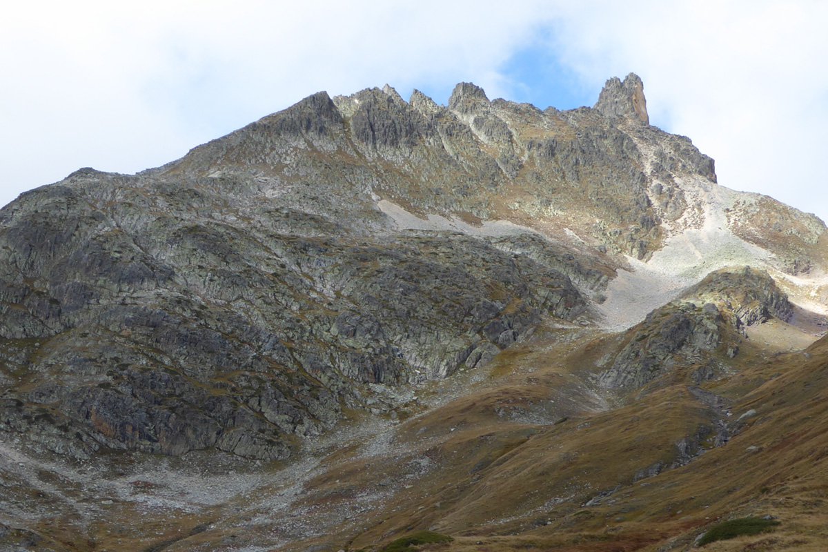 In discesa si torna sull’anticima e con una doppia di 15 m si scende il primo tratto più impegnativo, altrimenti si sfrutta l’itinerario della via normale: con cautela si scende verso est per una ventina di metri il poco invitante e molto esposto canalone detritico fra la cima e l’anticima, raggiunta una cengia (chiodo) si traversa verso la stretta breccia che si risale facilmente (altro chiodo), portandosi alla base del torrione terminale; qui si ritrova il sentierino con il quale in breve ci si riporta alla traccia che scende al Colle dell’Aiguille Noire. Per comodi prati si torna a valle dei laghi dove si intercetta il sentiero percorso all’andata.