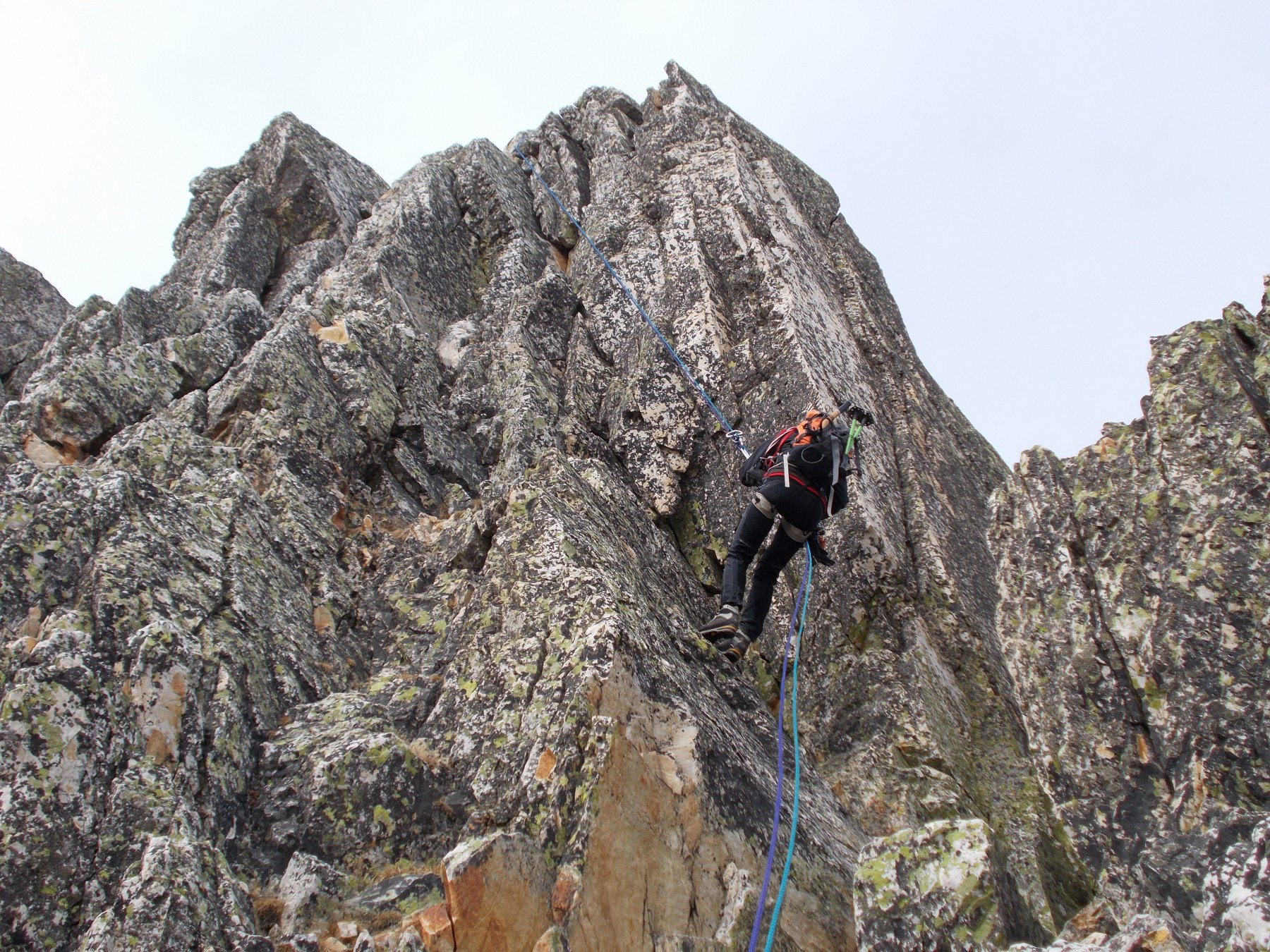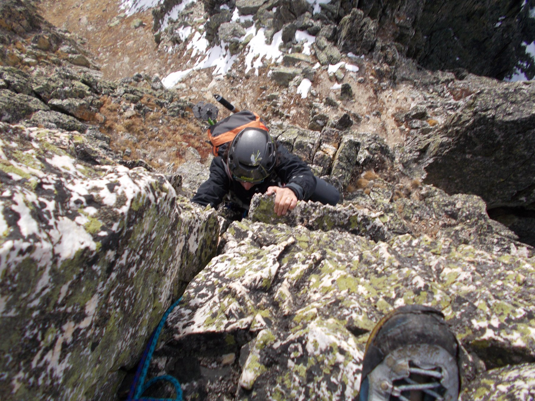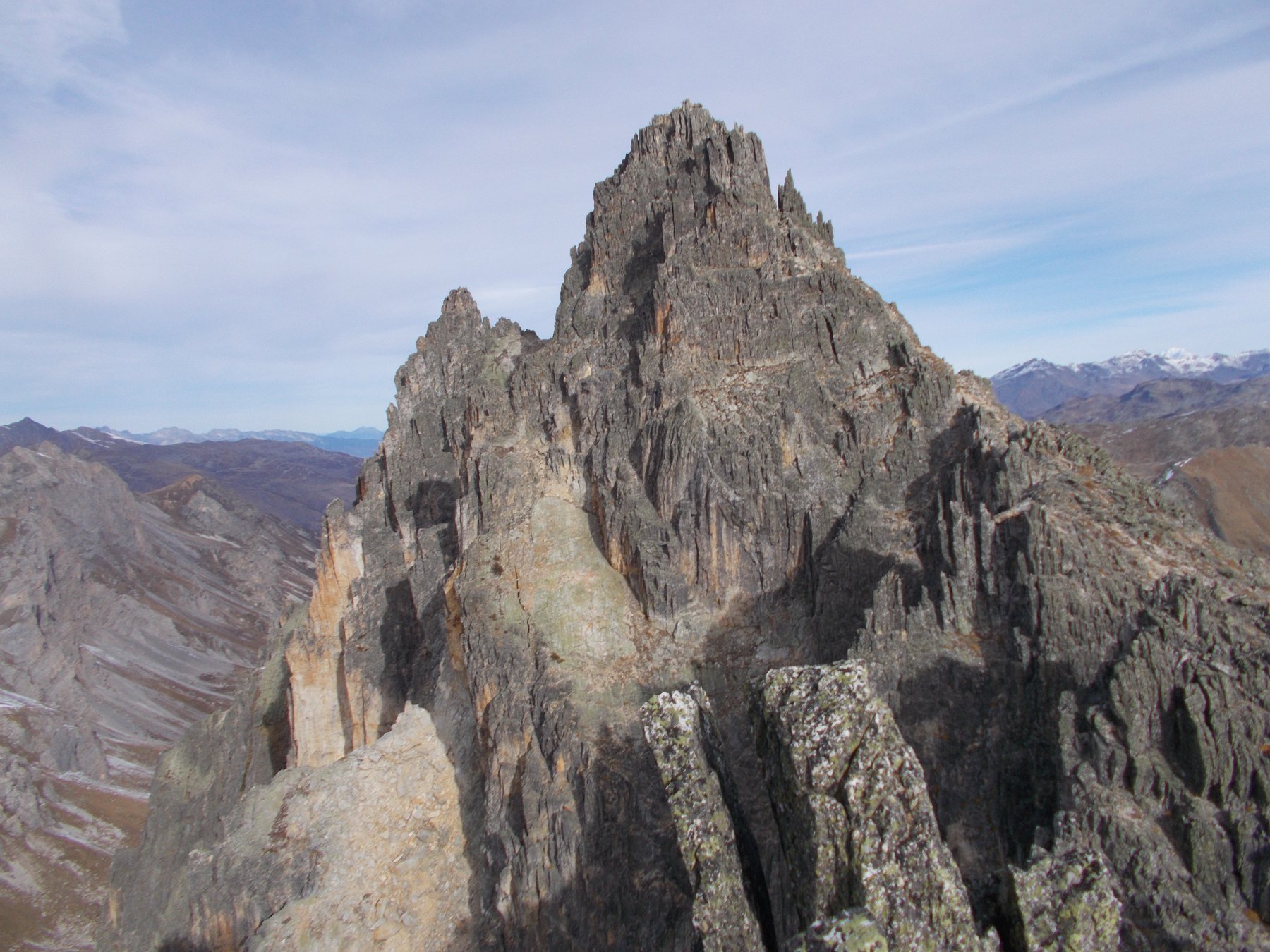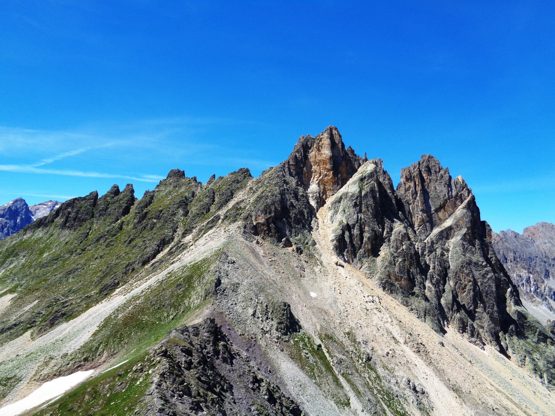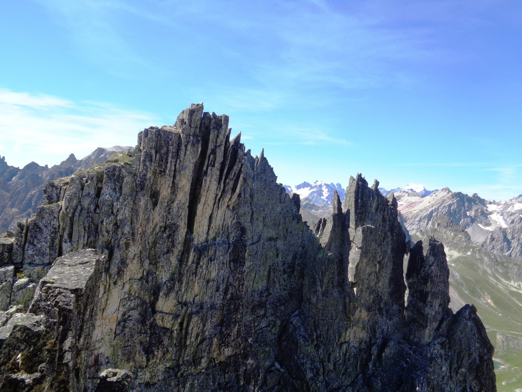Superato il 4° torrione, detto la Blanche, si incontra la traccia della via normale che in breve porta alla base del risalto finale. In prossimità di una stretta breccia, dove si passa la via normale, si piega a sx per tornare ad arrampicare in cresta fino alla vetta, su roccia buona, un po’ esposta ma molto appigliata (numerosi chiodi e una sosta sull’anticima). Dalla vetta grandioso panorama dagli Ecrins fino al lontano Bianco.