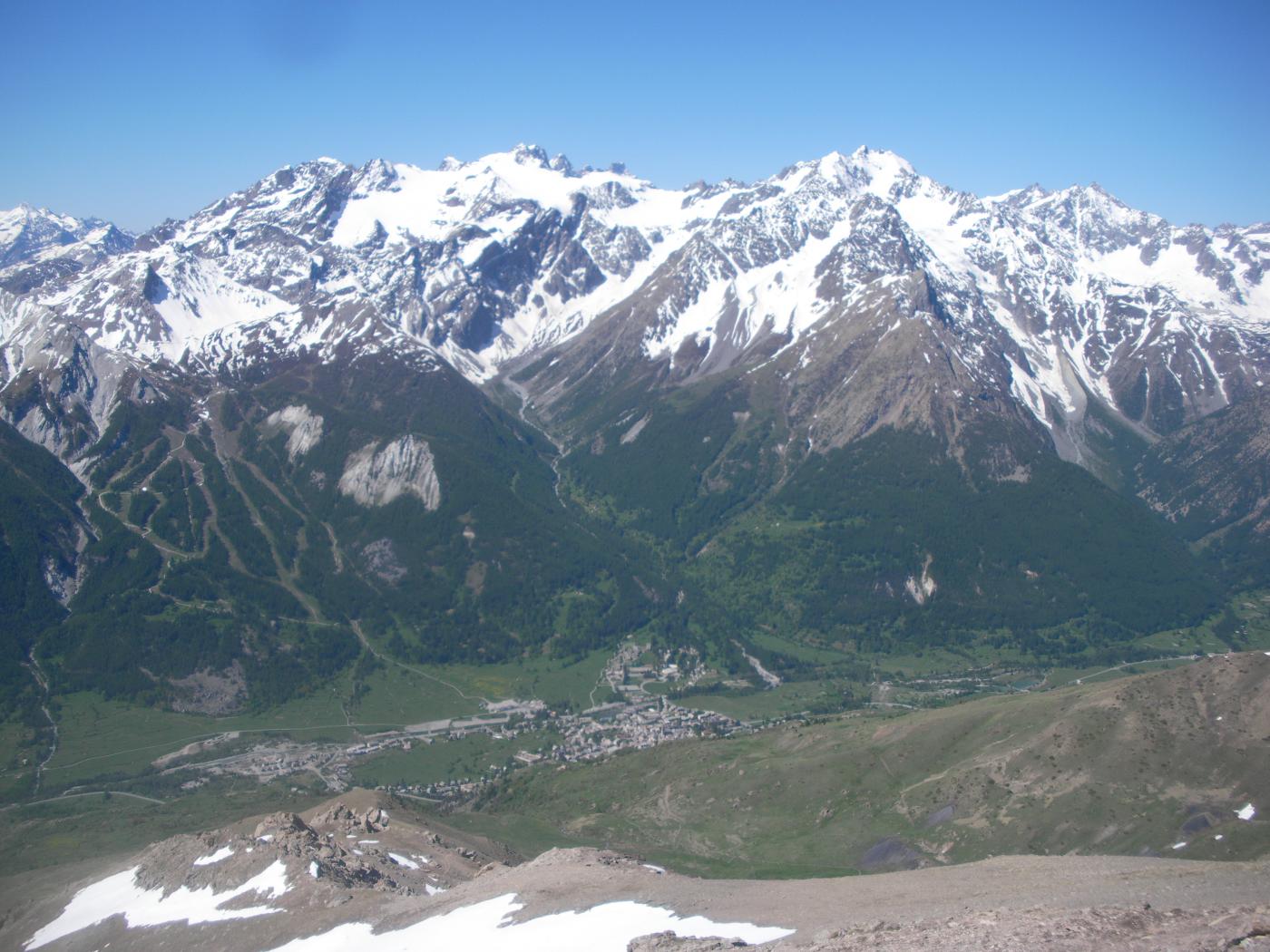 Dal parcheggio salire a Puy jumar (1800m) seguendo la segnaletica gialla all’inizio del sentiero. Procedere a sx per bel sentiero che al ponte prima di le Puy du Cros, conviene abbandonare per puntare dritto lungo ripide chine erbose lato dx del torrente salendo, che origina dal Vallone della Moulette, che si raggiunge poco dopo. Riprendere il sentiero gr57 per il col de Roche Noire. Abbandonarlo una qualvolta in vista del canale sulla dx un esteso conoide sassoso ne indica l’attacco. Superare il conoide e risalire il canale che dopo 100 m piega a sx (40°-45°) poi a dx a formare una goulotte (50°) tra due fasce rocciose. Sopra il pendio sempre sostenuto (45°) si allarga a ventaglio piegando nuovamente a sx, andando a restringersi di nuovo. Si è ora in vista della lunga rampa ascendente da sx verso dx che con pendenze sempre sostenute (tratti a 50° con punte a 55°), conduce in cresta a poca distanza dalla cima ovest 2898 m raggiungibile per un ultimo breve pendio detritico senza difficolta’. Procedere per cresta inizialmente facile, in direzione di alcuni dentini che si aggirano perdendo quota lato Monetier (sud),fino ad un punto (la base di un salto) dove una risalita di 100m ca permette di riguadagnare la cresta che senza alcuna difficoltà di rilievo porta in vetta alla punta massima (2922m). Se invece si vuole restare più sul filo e riguadagnare la cresta brevemente un passo di III° esposto consente di scendere in traverso (esposto) il breve salto roccioso che consente di seguire una linea più diretta alla punta da raggiungere. (ore 2 al canale dal parcheggio, 2.2.30 ore per il canale se in condizioni ,tempo che puo’ raddoppiare invece in caso il canale non fosse in condizioni, ore 0.30-0.45, passare da una cima all’altra mantenendo quanto possibile il filo di cresta, tot. dalle 7 alle 8 ore per il giro completo ad anello).