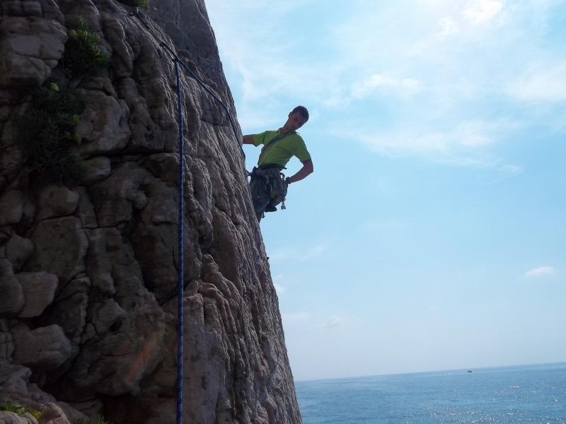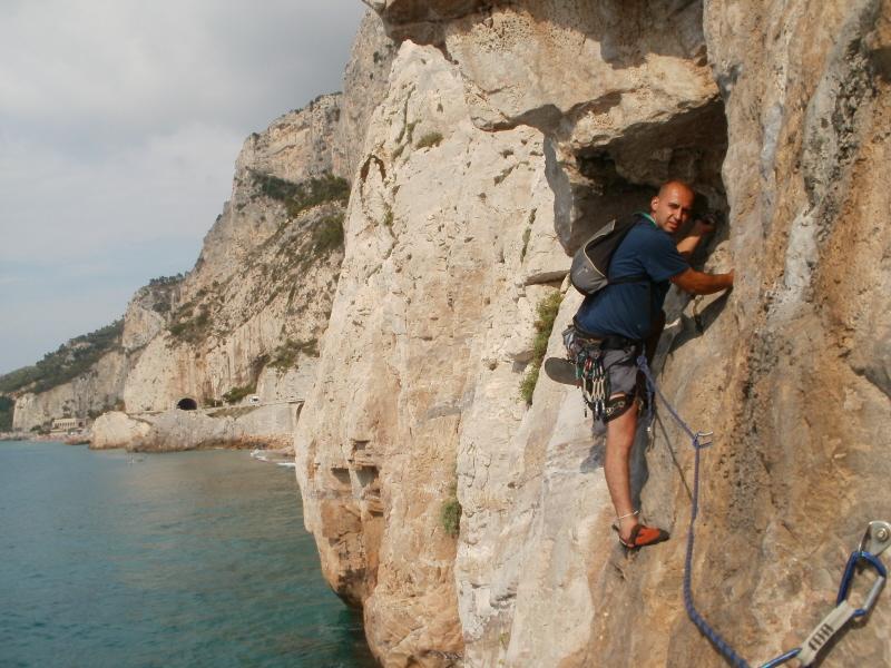 Ci siamo calati da una sosta delle vie del settore ‘I pilastri’, per raggiungere l’attacco. È una bellisima sensazione arrampicare a pochi metri dal mare su una roccia molto bella. Abbiamo percorso circa 4 tiri e poi siamo usciti direttamente sulla strada, ho integrato con friend e nut nel tiro di uscita. Ma ho scoperto dopo che se facevamo un tiro in più si poteva uscire molto più semplicemente. Ottima giornata, se la si fa al mattino conviene partire presto per non abbrustolirsi troppo….