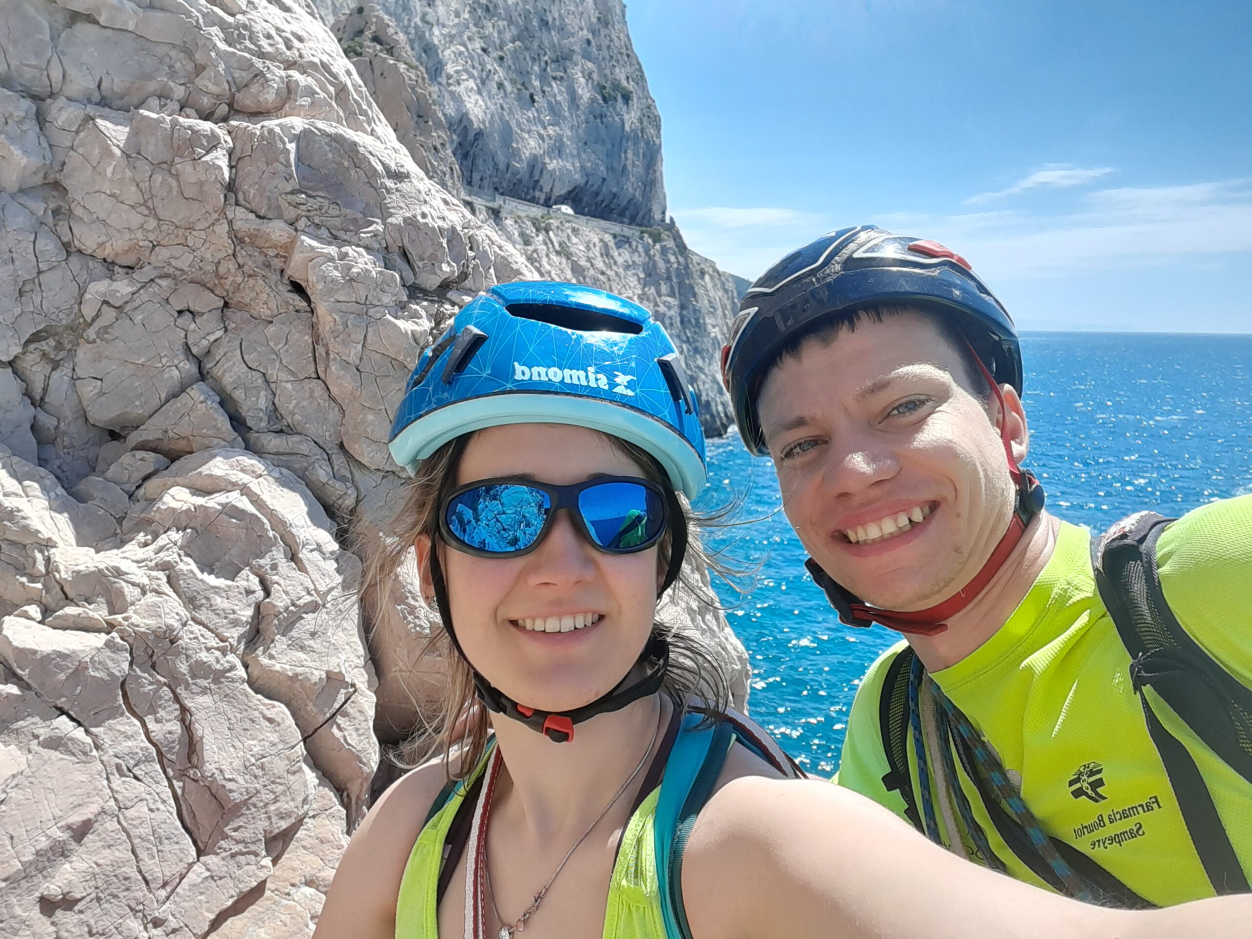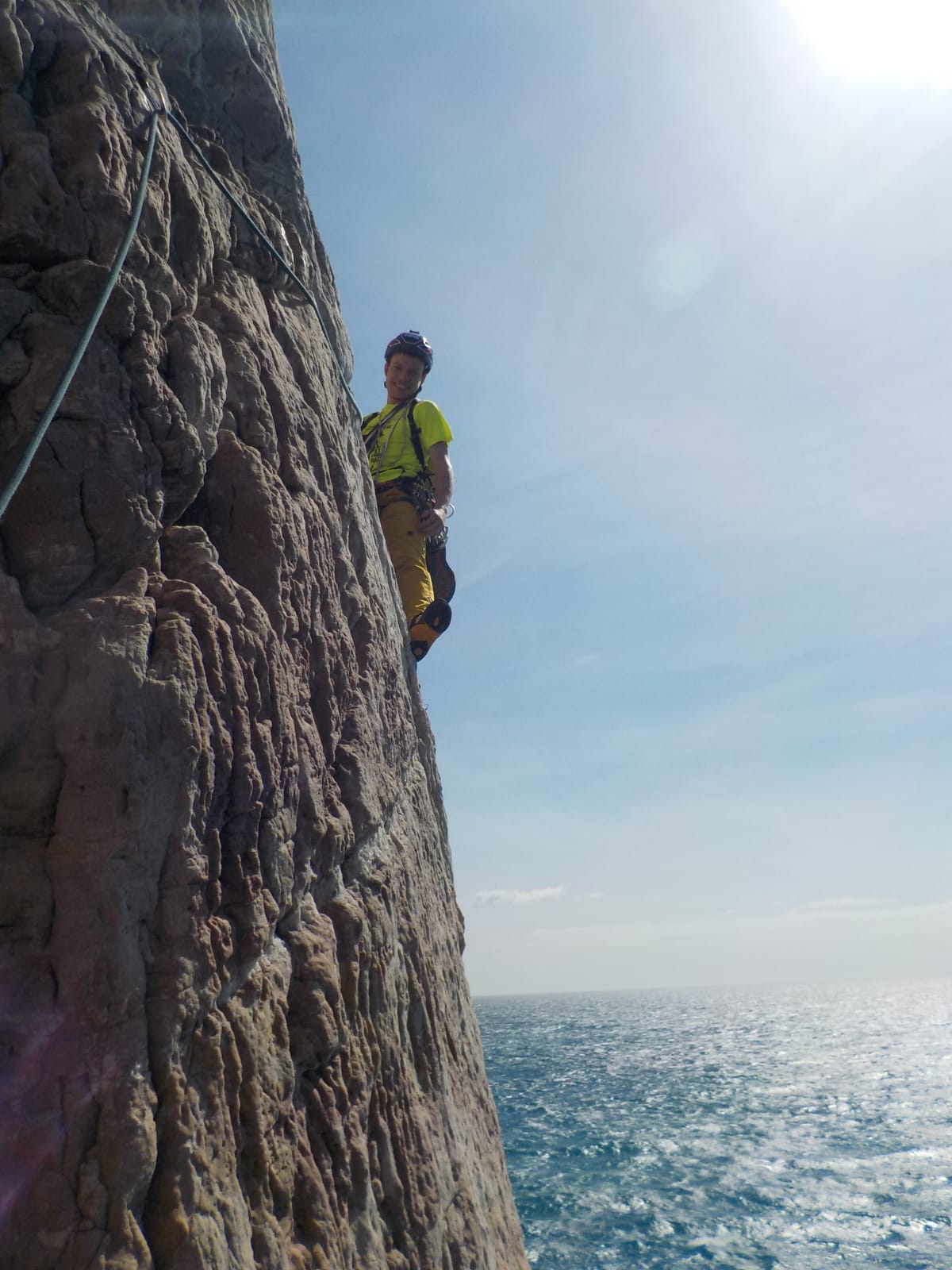 Bellissima cavalcata lungomare che sognavo da tempo. Oggi aderenza buona, l’unto si è sentito poco. I passaggi più duri sono circa 4/5 (ben protetti e volendo azzerabili) e si trovano tutti nella prima metà della via ( all’ inizio del primo tiro, alla fine del secondo, sulla placca giallastra unta…); in generale passata la prima metà si conclude quasi sicuramente (a mio avviso per divertirsi occorre padroneggiare il 5c). Spittatura ottima (ravvicinata dove serve più lontana nel facile) noi non abbiamo mai integrato nemmeno con i cordini, oltre agli spit, sono presenti qua e la vecchi chiodi e alcuni cordoni in buono stato. Soste con due spit da collegare, in totale ne ho contate 12, noi abbiamo effettuato 10 tiri ma si può fare anche in 8 ª patto di avere la corda da 60m. Non una gran arrampicata ma l’ambiente vale sicuramente il giro. Con Roby