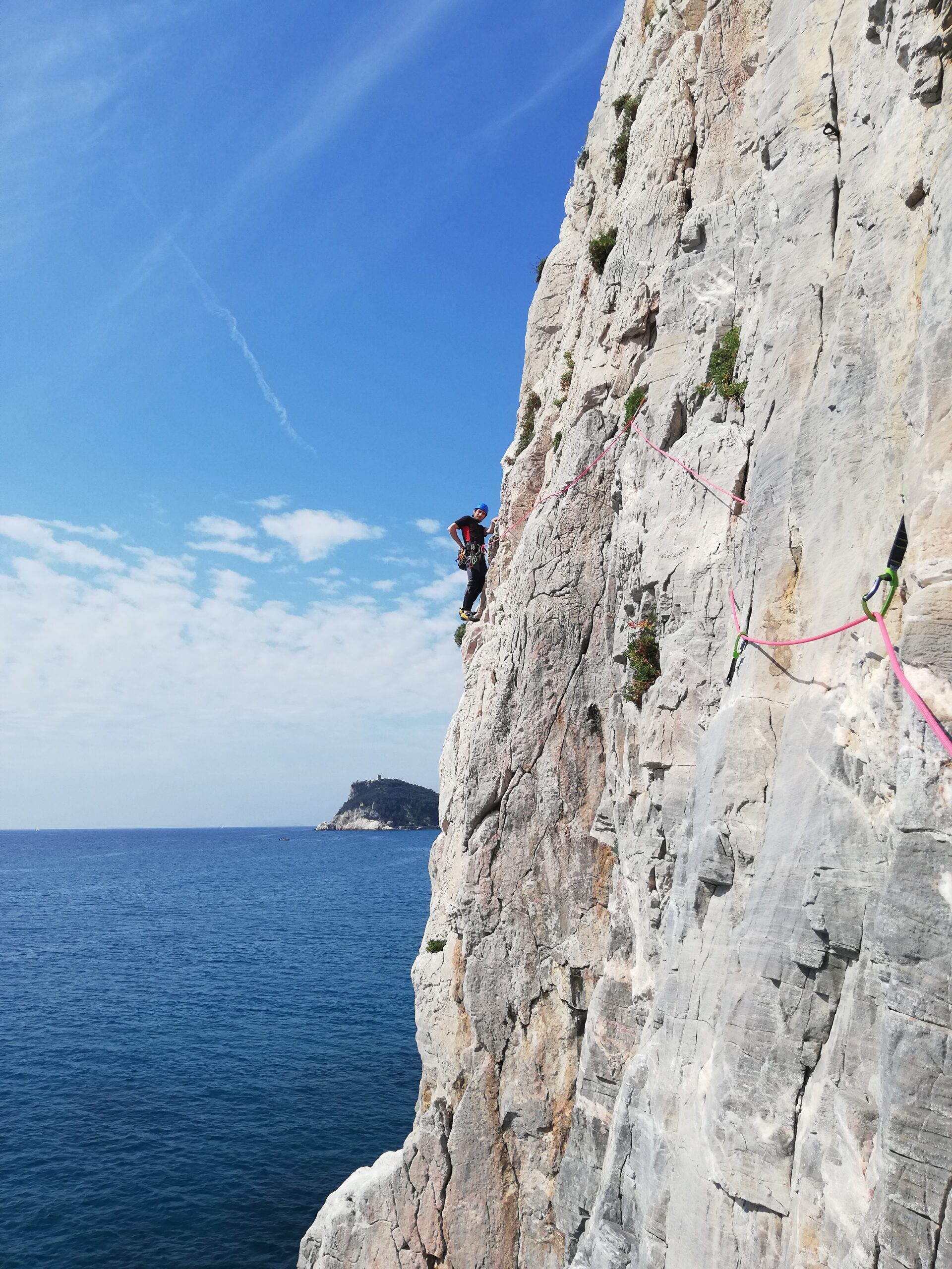 Finalmente il famoso traverso di Noli! personalmente mi è piaciuto molto, dopo un paio di tiri ci si abitua e ci si diverte… aoprattutto se come oggi non ci sono altre cordate vicine, solo il rilassante suono del mare… E vabbè qualche clacson 😁 con Marco