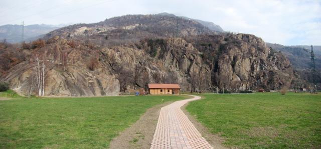 Percorsi alcune centinaia di metri di strada (tendo la sx ad un piccolo incrocio) si trova, dopo altri cento metri, sulla sx l’inizio della mulattiera che scende decisamente ad un gruppetto di case dove di fronte ad una ormai devastata chiesetta con svolta a sx scende decisamente la mulattiera E1 che senza indugi (passando dalla borgata Bioley – attenzione ai cani .. ringhiano ma non mordono (!)) ci porta ad attraversare la strada una prima volta e poi alla frazione Casale si attraversa nuovamente; seguire sempre le indicazioni r/b sino a raggiunge la chiesa di Settimo Vittone posta su una piazzetta a lato di un tornate della strada che da Settimo sale a Trovinasse e/o Nomaglio. Qui con una piccola deviazione (cartelli indicatori) si può vedere il battistero di S. Lorenzo (ingresso a pagamento) e ritornati al tornate (ora sulla dx) si svolta di lato al cancello dove inizia il sentiero che con le indicazione della via Francigena (F bianca con omino bianco e cartelli in legno arancioni) passando ora tra le vigne e i “tupiun” si percorre un sentiero a volte stretto sino a raggiunge il bivio sulla mulattiera di salita. Svoltando a sx si ritorna a Montestrutto e al parcheggio. Vale la penna, se non lo si è fatto durante la salita, di deviare sul sentirino che porta all’uliveto di S. Francesco e scendere attraverso un breve tratto di sentiero attrezzato (siamo al centro delle falesie di arrampicata di Montestrutto) alla sottostante area e all’annesso ristoro nei pressi del parcheggio e punto si partenza dell’escursione. (totale 12km quota max1050m disl800m 4-5h con calma). Vedi traccia.