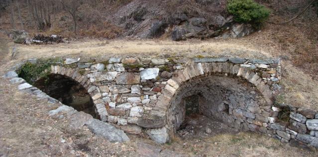A quota 480m raggiungiamo l’eco museo dove oltre alle interessanti varietà di castagni presenti si trova il “Mulino” ad acqua datato 1700 circa (interessatissimo dal punto di vista didattico visitabile previo contatto con comune di Nomaglio) (quota 555m) e nei pressi sono ancora ben conservate le vasche per la riserva di acqua. Siamo tra le case di Nomaglio e trascurando il sentiero F4 che a dx scende a San Germano (altro possibile percorso per formare un anello più breve) si arriva ad un lavatoio 575m dove vi sono le indicazioni (che trascuriamo) per svoltare a sx per Novachei e Montestrutto (s.881 itinerario del primo anello) si seguono le indicazioni di svolta a dx dove si trova “il Burnel” una interessante fontana in monoblocco. Si procede a fianco della fontana a salire con indicazioni “palestra di roccia Casley” e raggiunto l’angolo 595m del “masso inciso” pietra con incisioni si devia dal sentiero per prendere un piccolo sentierino (sulla dx) di poche decine di metri che sale deciso tra un muro di contenimento e delle case a raggiungere la strada che si percorre a dx per un centinaio di metri sino in prossimità di evidenti “bomboloni” 660m dove sulla sx inizia la bella mulattiera F1 che sale in direzione nord sino ad un tornate a dx e di li a poco si trova il bivio 785m tra il sentiero F2 (direzione Rossana, che si trascura) e F1 (direzione Terrafredda) dove si svolta a sx a salire sino a raggiungere l’interessante sito della “fornace” 899m (oltretutto punto molto panoramico pianura sottostante) prosegue ora per sentiero e si raggiunge il pianoro di Terrafredda dove superata un prima casa 1020m si trova un bivio (con palina che indica a sx il sentiero F1a che porta direttamente a Cuni ma è preferibile per non privarsi di panorami e altre punti interessanti proseguire in salita per il sentiero F1 sino a raggiungere un ampia radura con strutture ben recuperate e seguendo gli evidenti bollini r/b si raggiunge la strada soprastante (località Bioley 1050m) che si percorre a sx e si trova un caratteristico lavatoio originario in pietra con a fianco uno in muratura. Qui il panorama spazia anche sulle montagne del lato opposto della valle (la Cavallaria, il Gregorio e le montagne della conca di Scalaro).