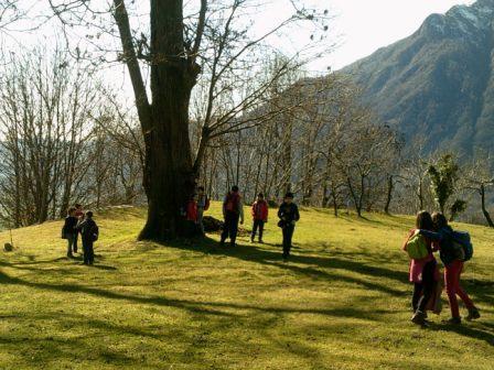 Ci siamo trovati a Ivrea davanti alla stazione, siamo partiti con l’autobus della Sadem alle h. 10,35 e siamo arrivati a Montestrutto alle h. 10,52. Da Montestrutto (m. 260), seguendo il sentiero n. 881 e dopo esserci fermati ad ammirare il panorama alla casa della Posta, prestando attenzione per non calpestare le primule e i numerosi colchici sbocciati lungo la mulattiera, siamo giunti all’Ecomuseo della Castagna di Nomaglio (m. 480), accanto al quale si trova una bella area attrezzata con panche e tavolini: affamati, abbiamo dato l’assalto ai panini, alle barrette di cioccolato e a tutto ciò che di commestibile le mamme avevano messo negli zaini… A Nomaglio abbiamo sostato alla fontana del Burnel e alla pietra con le incisioni preistoriche, poi, considerato che era ancora presto, abbiamo proseguito la salita lungo il sentiero fino all’alpe Cotrosa (m. 640): il tiepido sole quasi primaverile, la poetica radura tra i castagni, perfettamente pulita, il panorama, nitido per il vento della mattinata, il corniolo con i suoi piccoli fiori gialli, il cielo azzurro invitavano al riposo e suggerivano sogni di vacanze in tenda per rilassarsi, leggere, camminare… Per scendere abbiamo seguito il sentiero E 7, con ampie vedute sulle vigne e sulla pianura; dopo aver attraversato la borgata di Ivozio, ci siamo fermati a giocare nei prati della palestra di arrampicata La Turna. Attorno alle h. 18 siamo risaliti sul pullman, che, in circa un quarto d’ora, ci ha riportati a Ivrea, stanchi, ma contenti.
