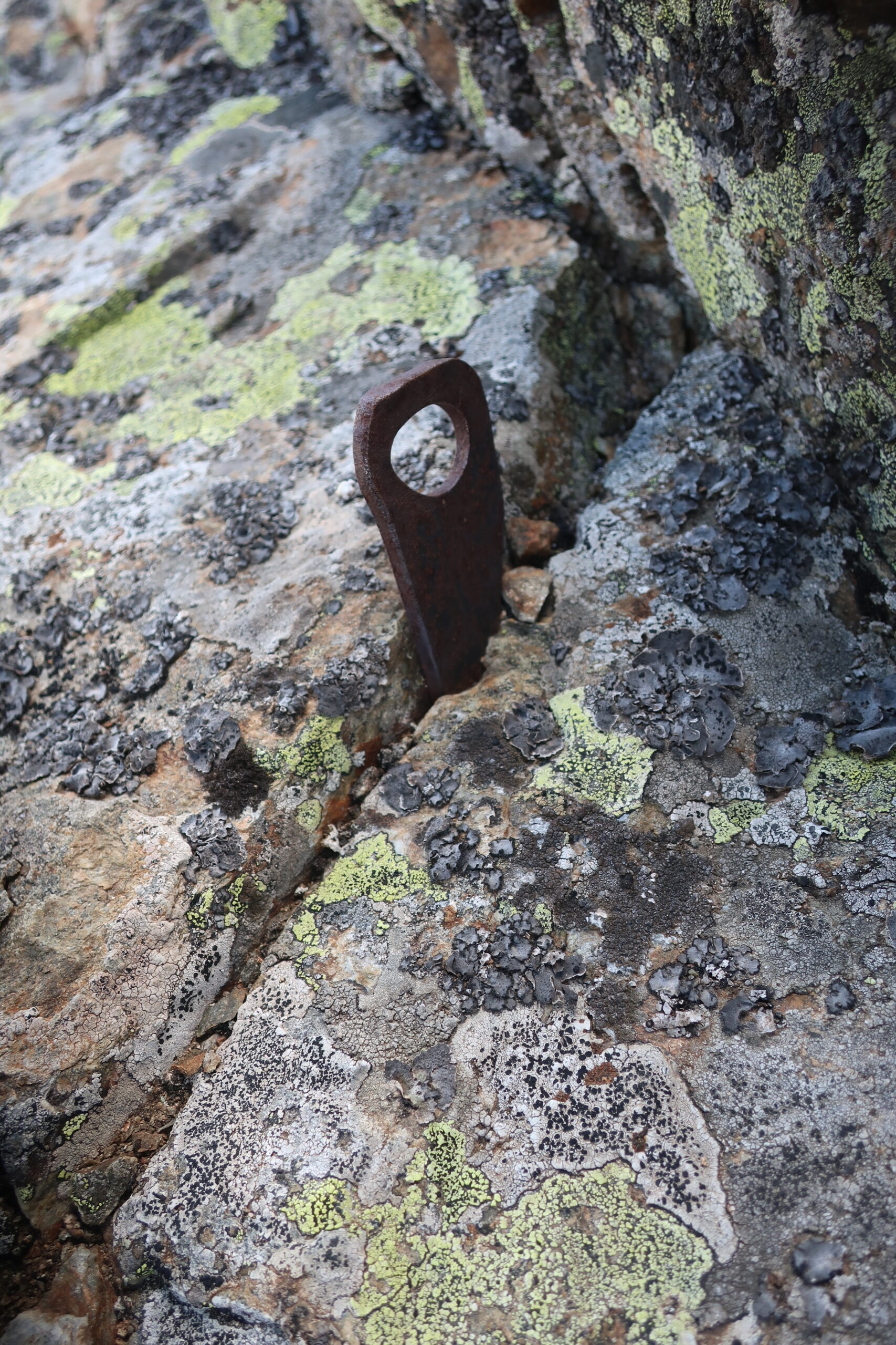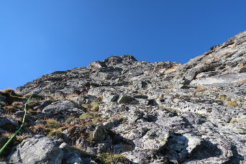 è la parte tecnicamente più dura, ma è molto discontinua, offrendo singoli passi… intensi (IV+/V), alternati a tratti con terra e erba. La roccia purtroppo non è quasi mai buona (molti licheni neri) e le prese vanno testate tutte. Abbiamo scalato il primo gendarme e disarrampicato all’intaglio successivo
