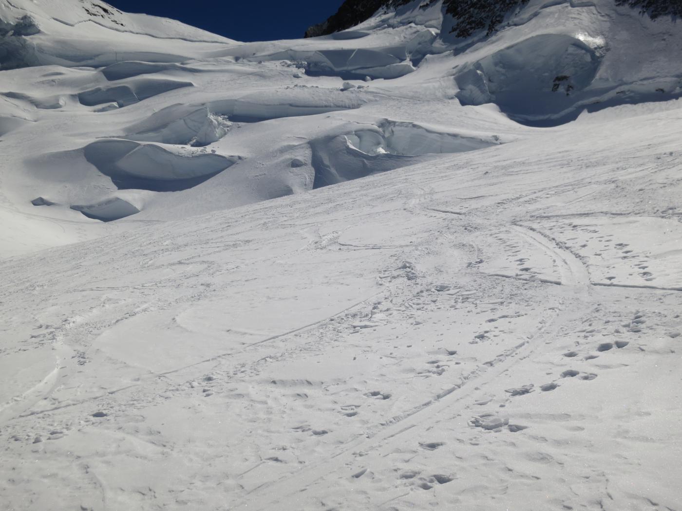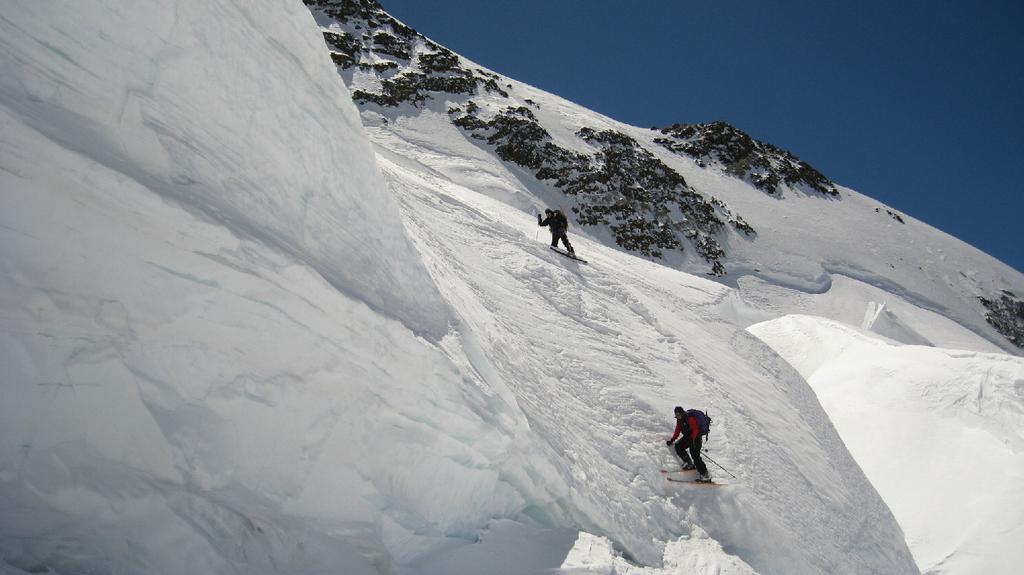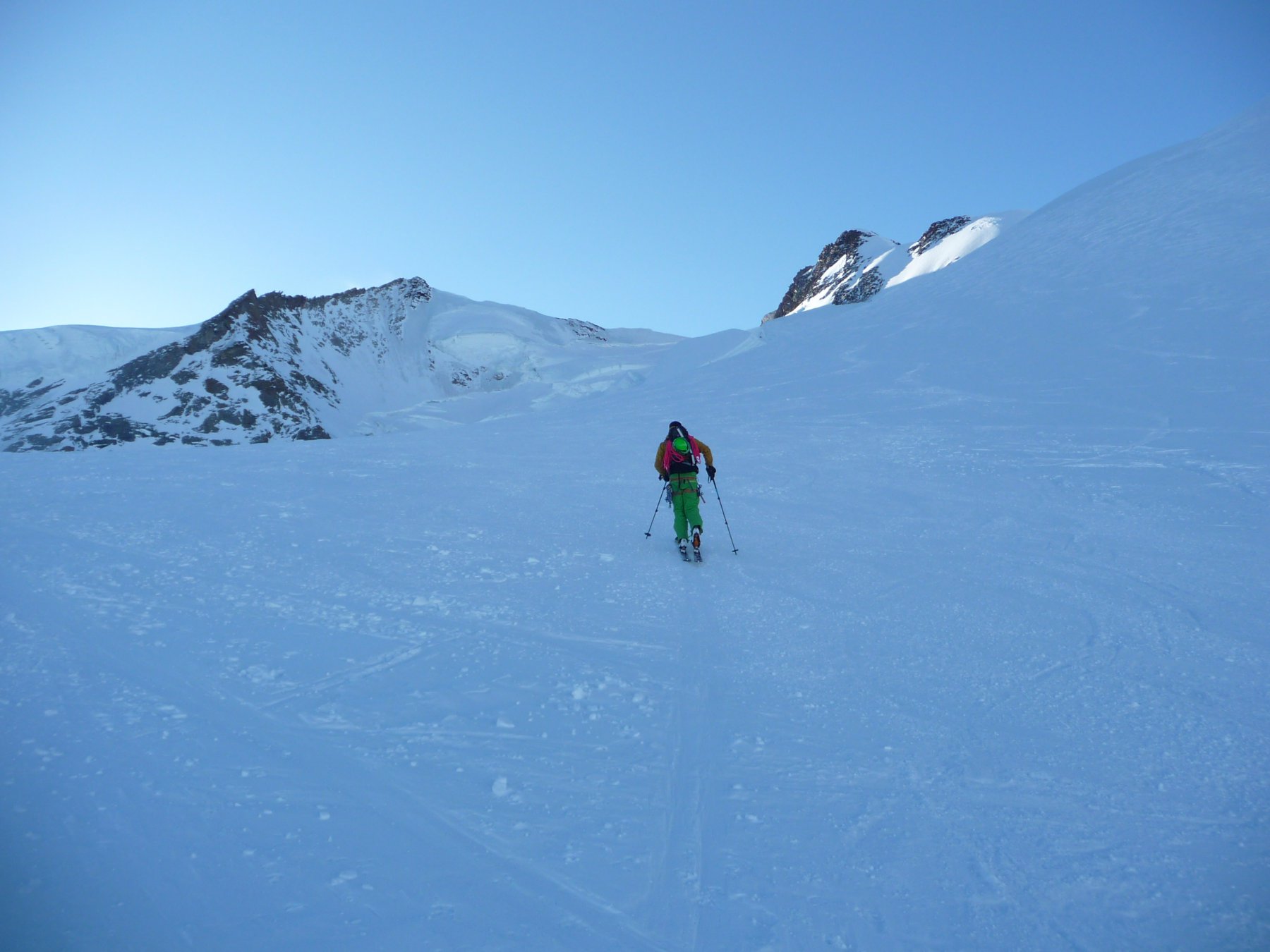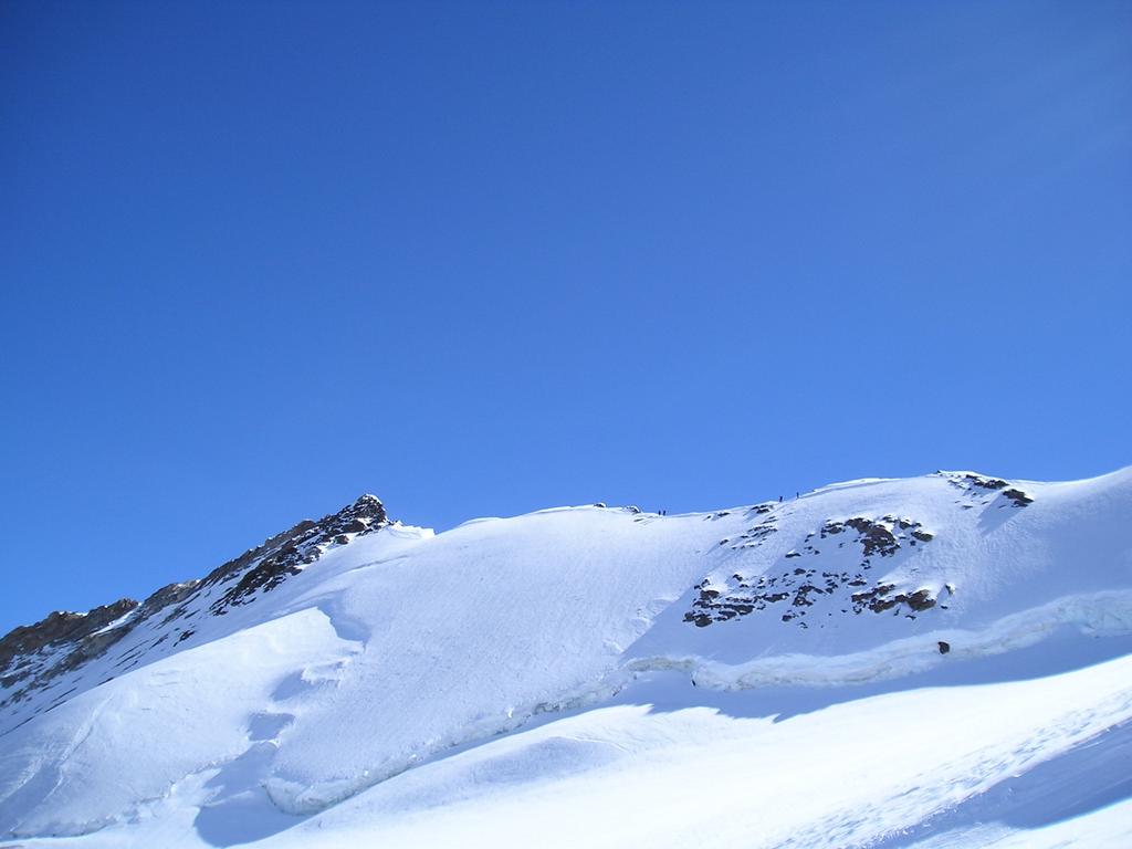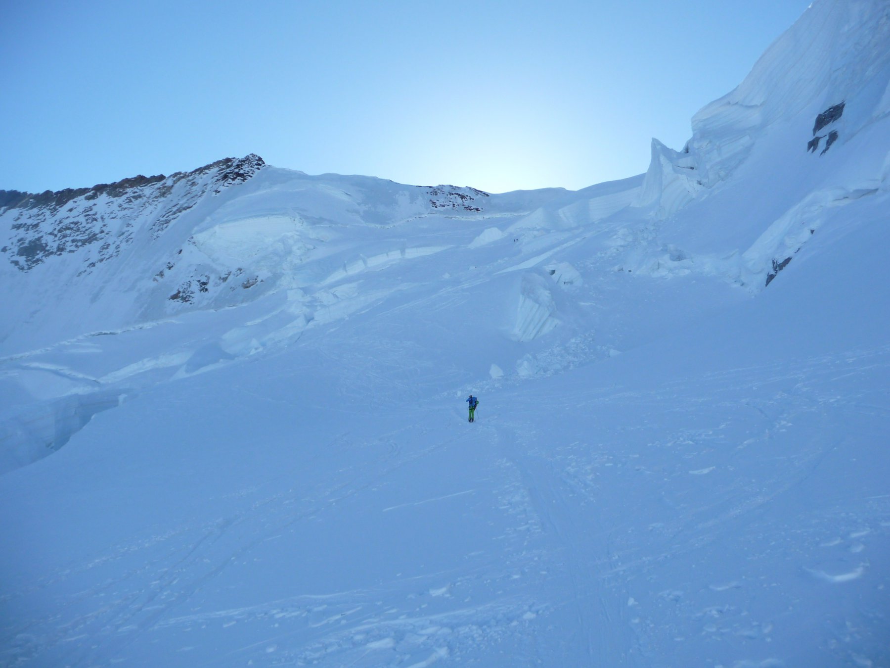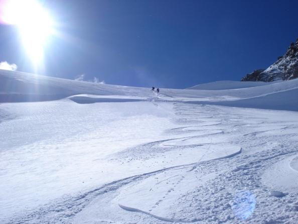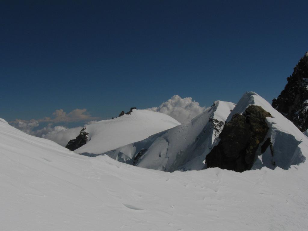 Risalire i dolci pendii tenendosi sulla destra per evitare una zona crepacciata e giungere al plateau a circa 4100m.Risalire il pendio del Silbbersattel(4515) aggirando dei grossi crepacci.
