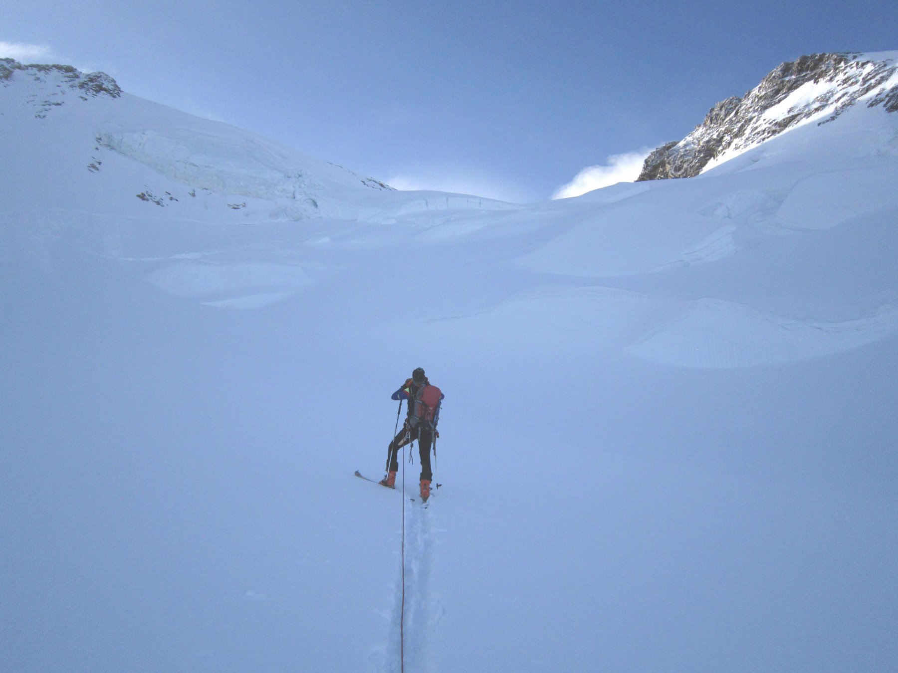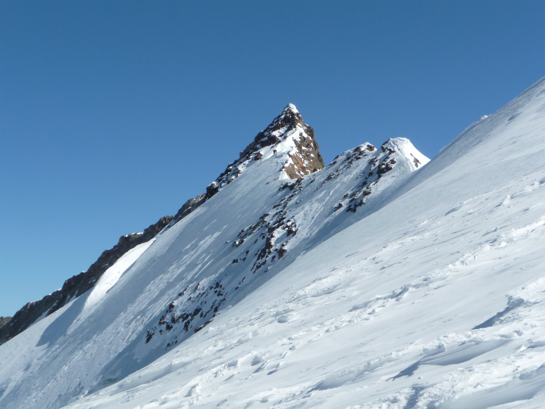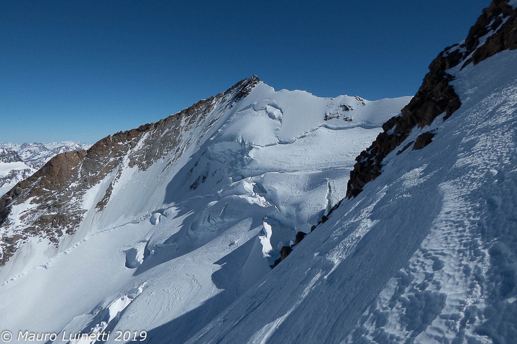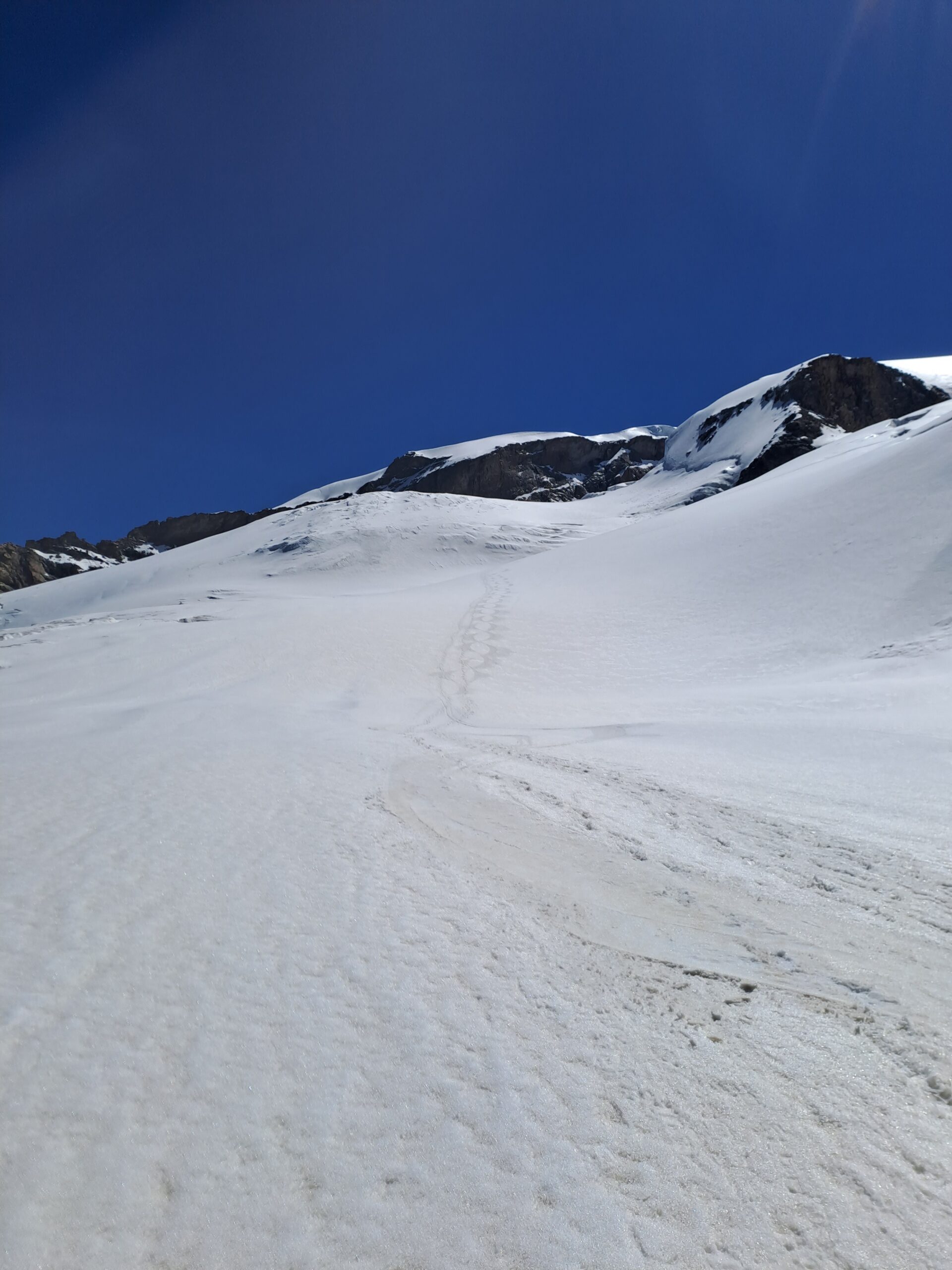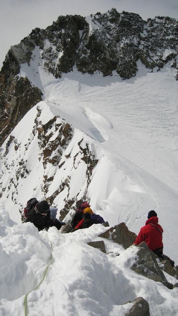 Risalire i dolci pendii tenendosi sulla destra per evitare una zona crepacciata e giungere al plateau a circa 4100m.Risalire il pendio del Silbbersattel(4515) aggirando dei grossi crepacci.