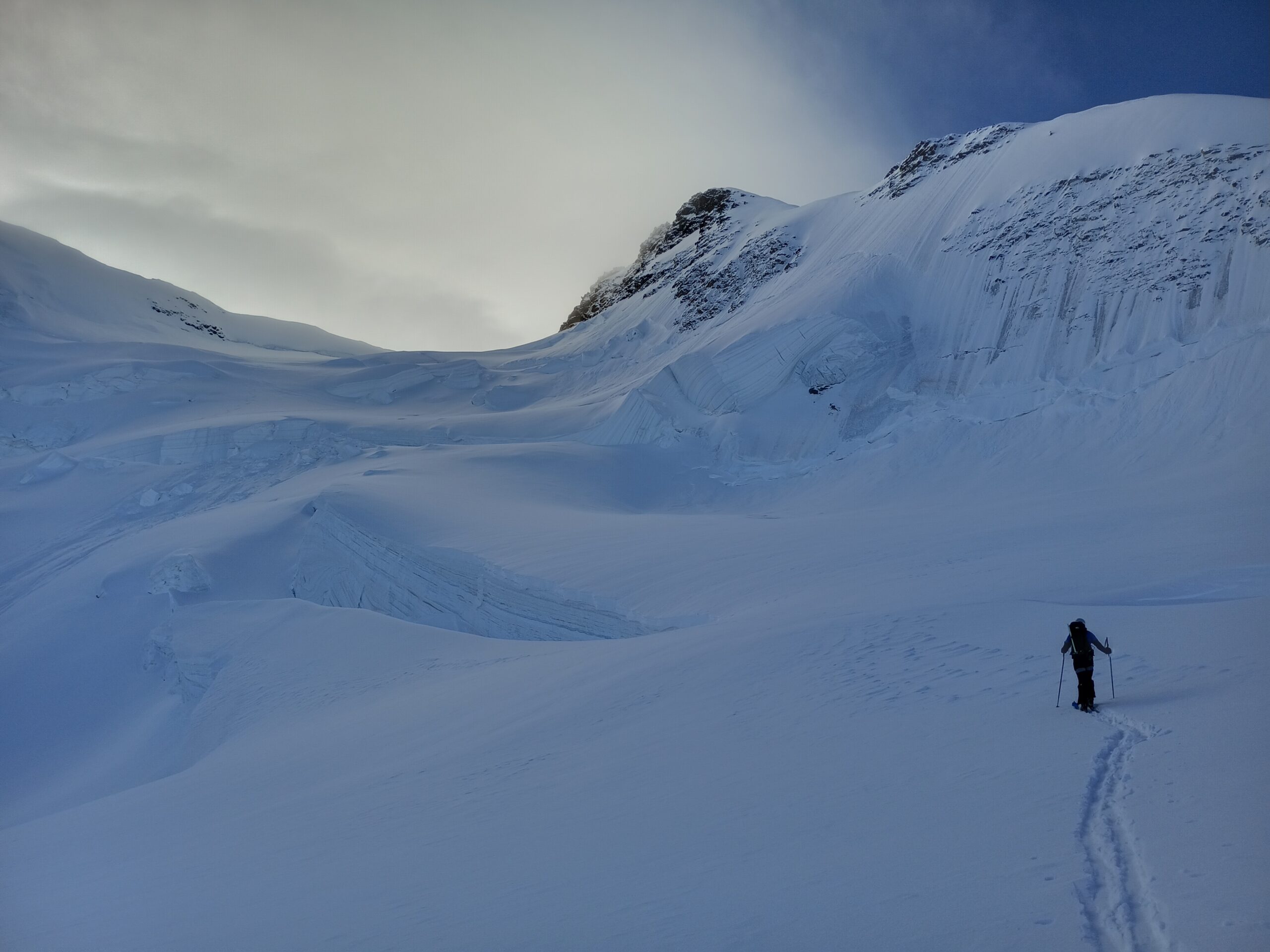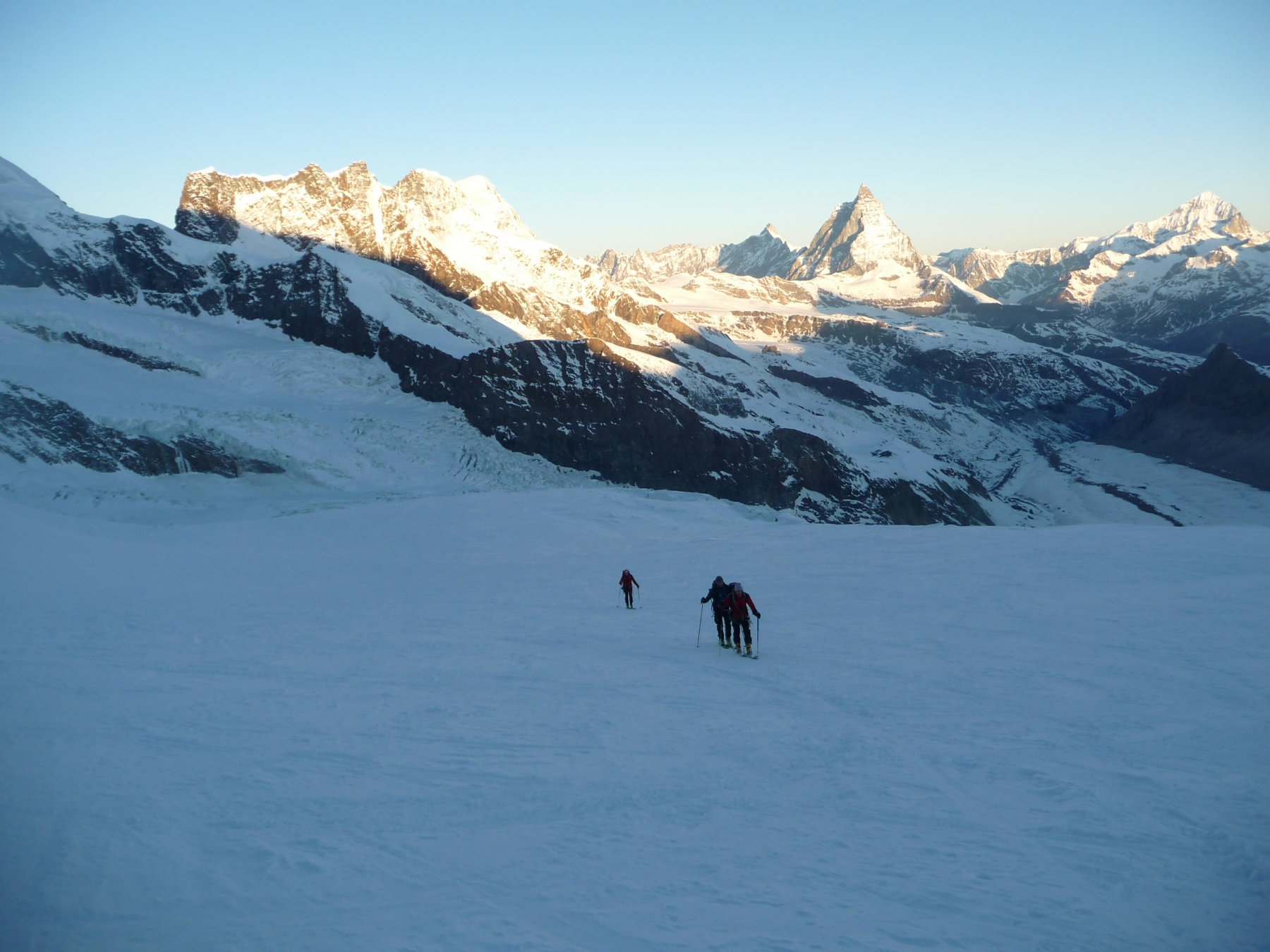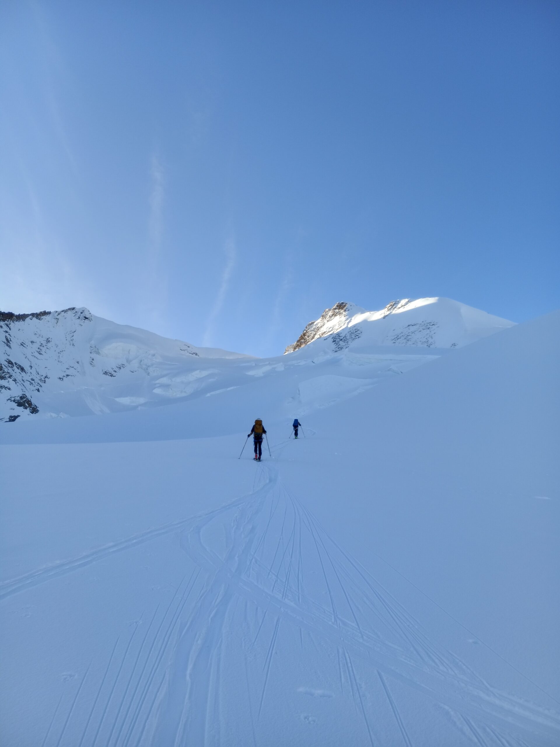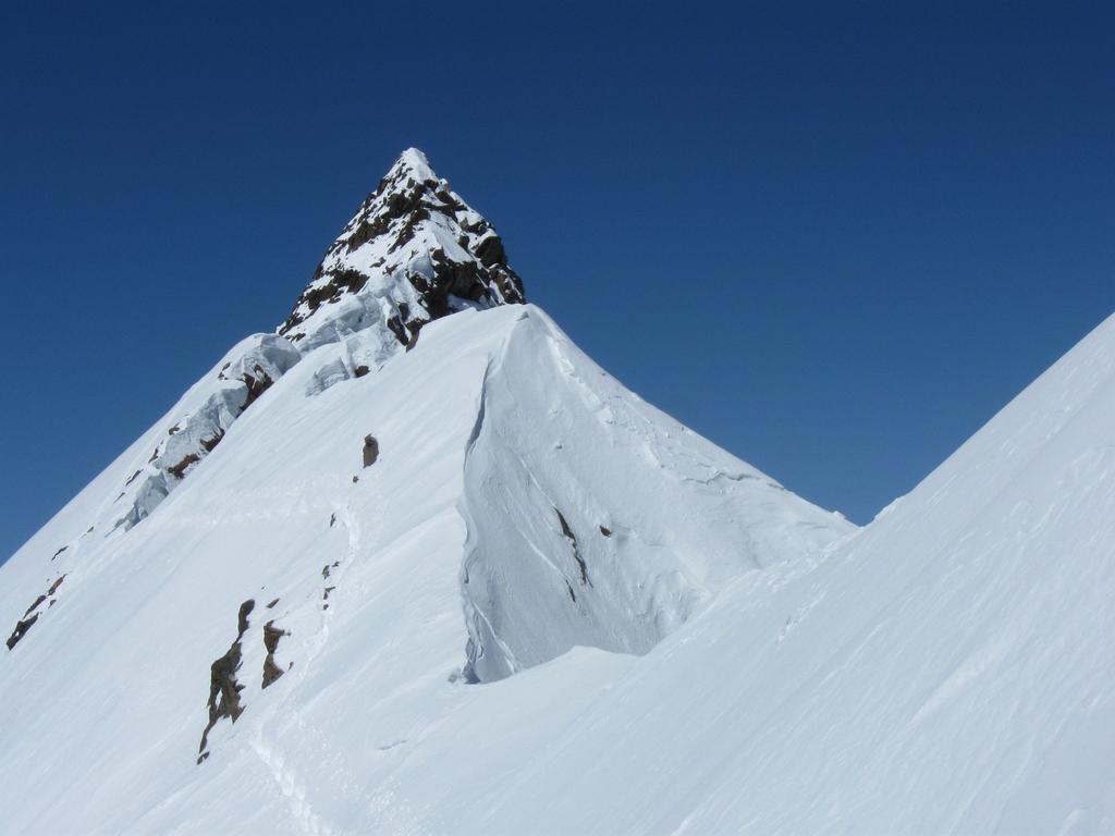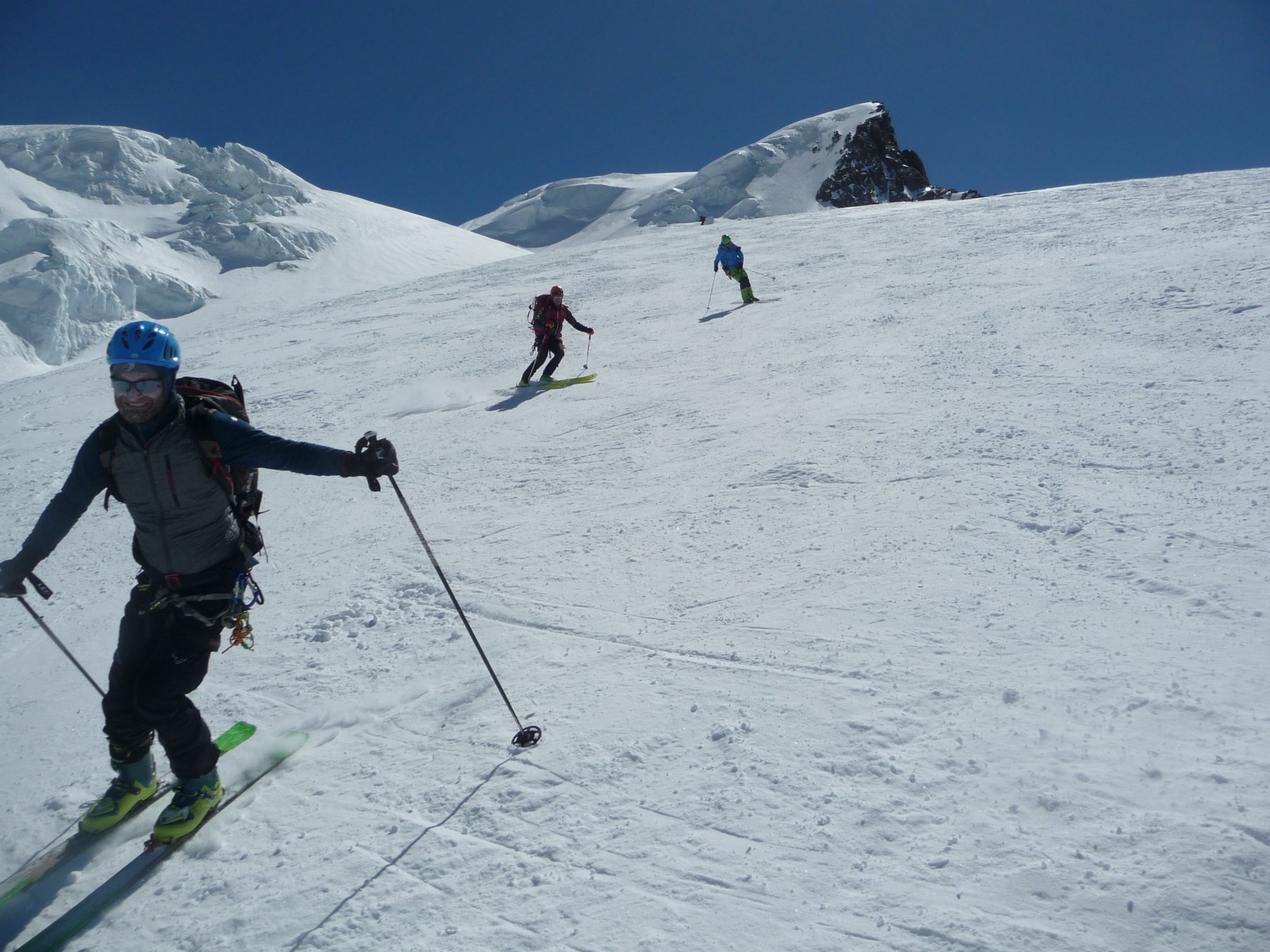 Risalire i dolci pendii tenendosi sulla destra per evitare una zona crepacciata e giungere al plateau a circa 4100m.Risalire il pendio del Silbbersattel(4515) aggirando dei grossi crepacci.