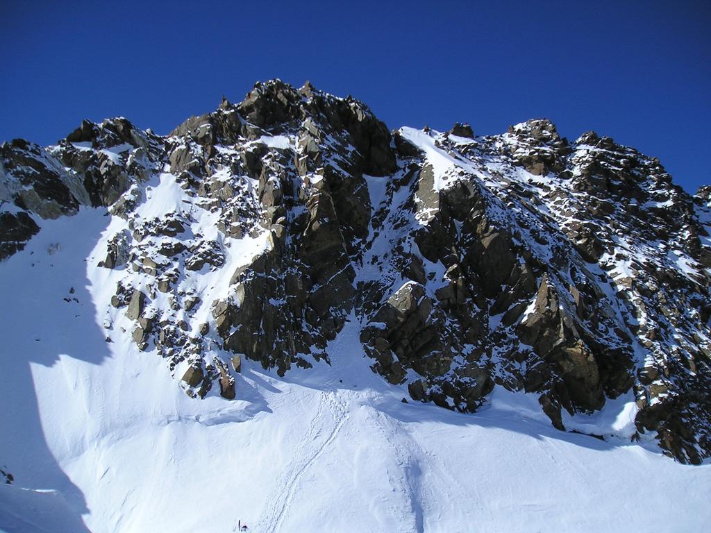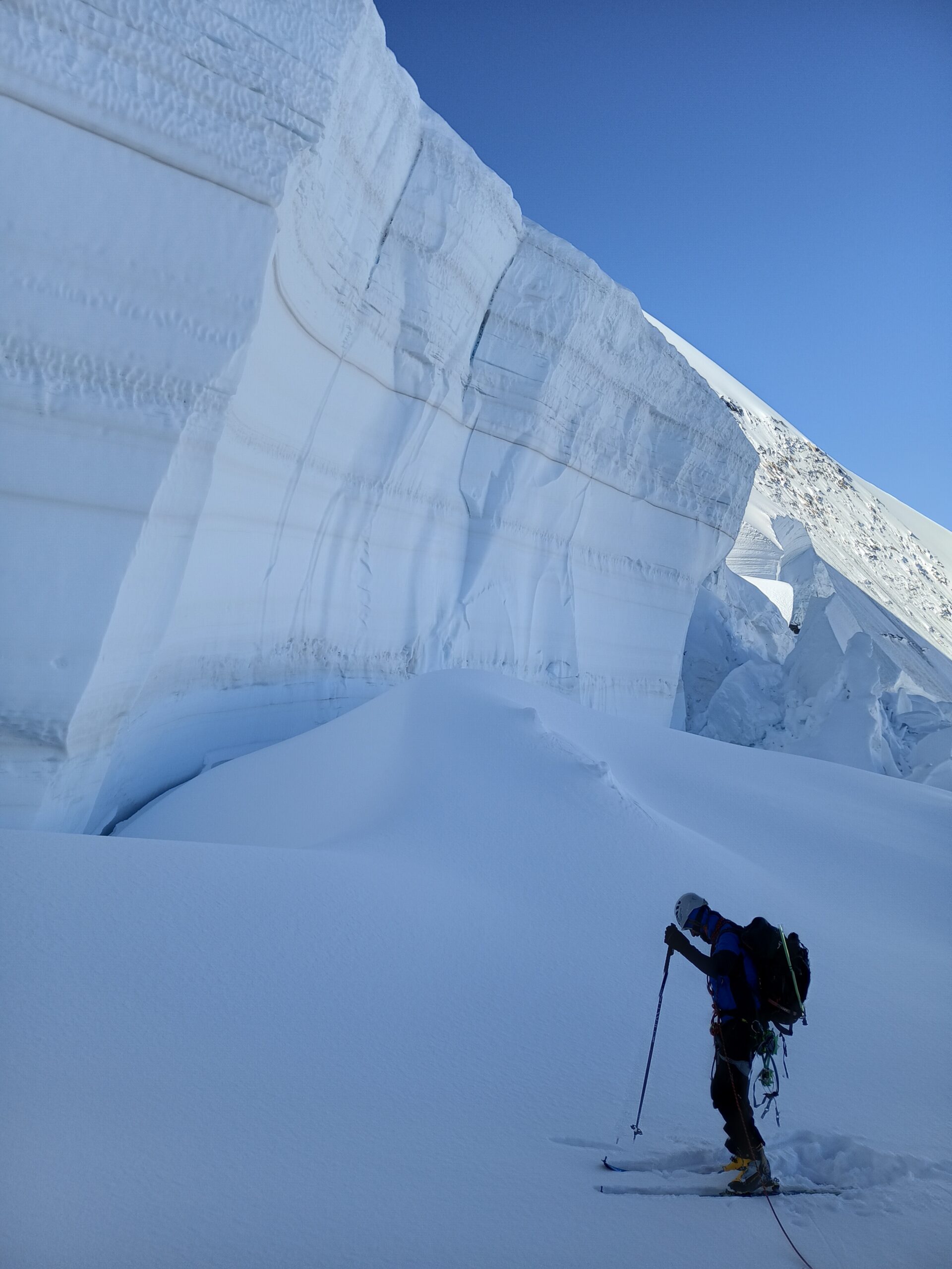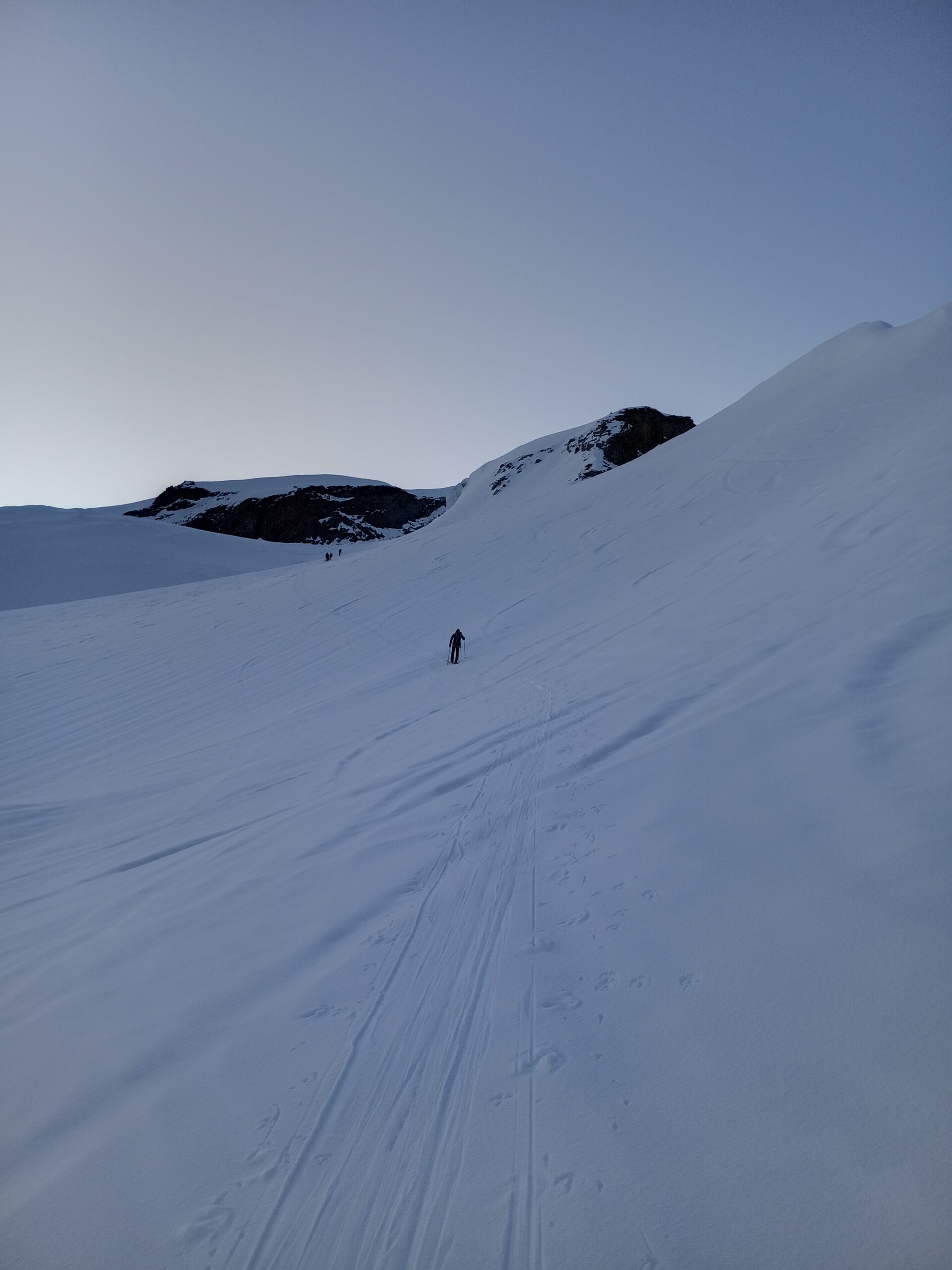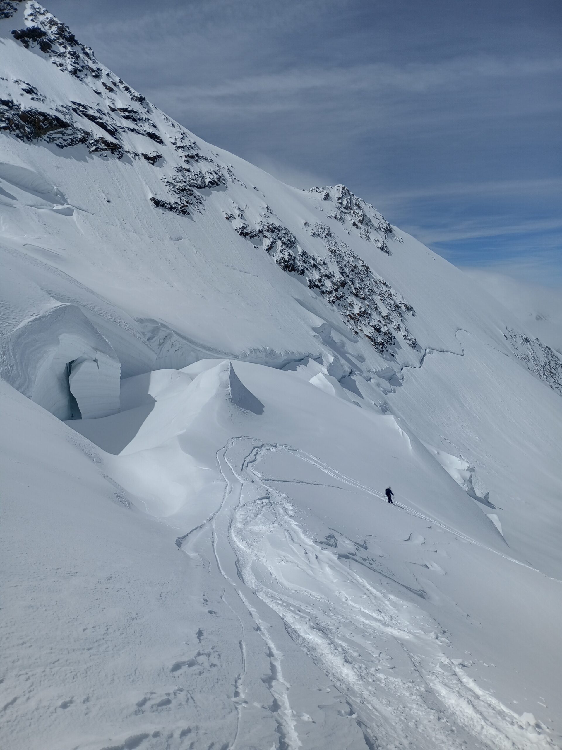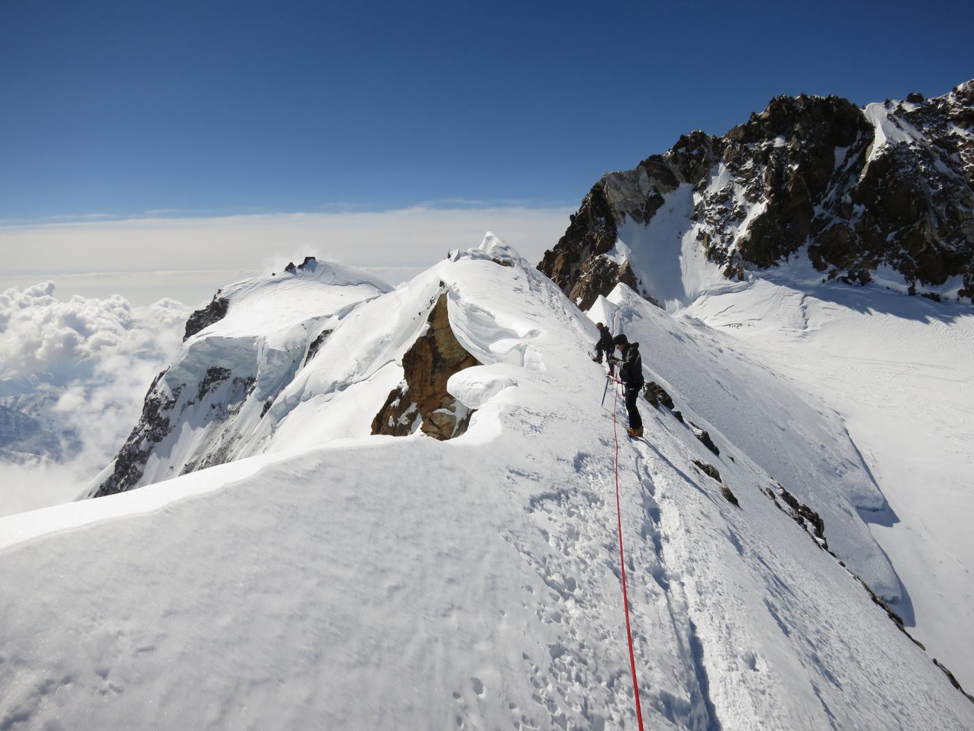 Risalire i dolci pendii tenendosi sulla destra per evitare una zona crepacciata e giungere al plateau a circa 4100m.Risalire il pendio del Silbbersattel(4515) aggirando dei grossi crepacci.