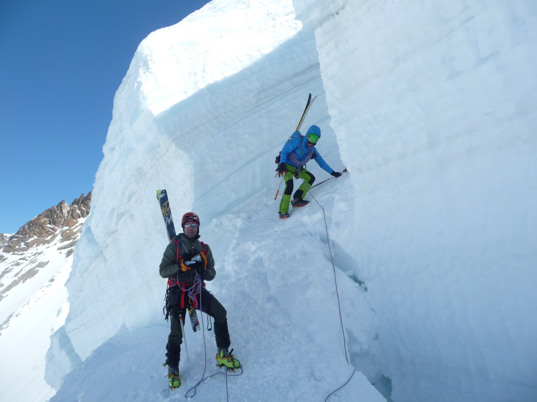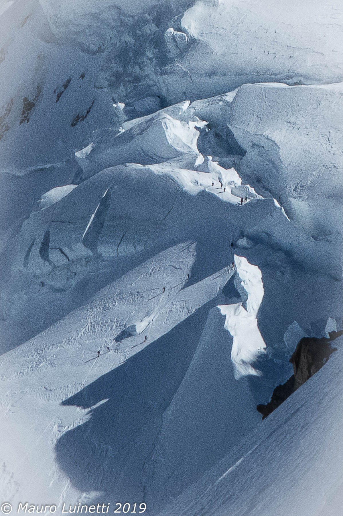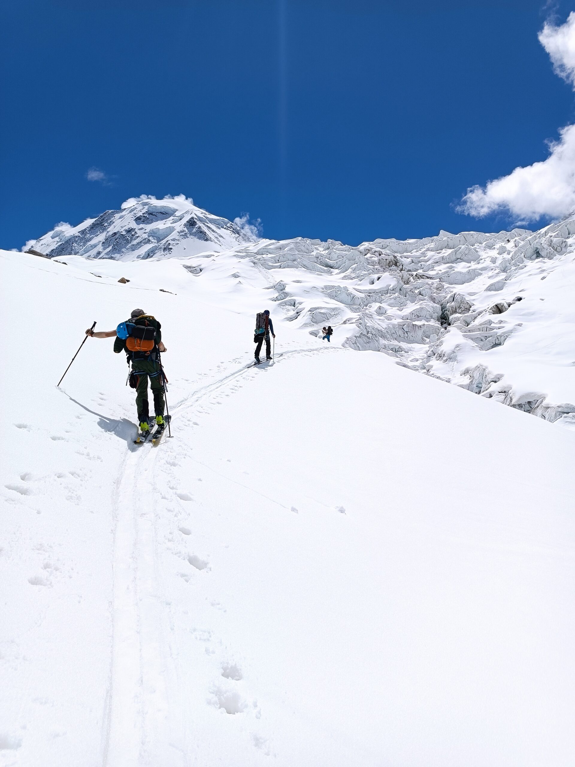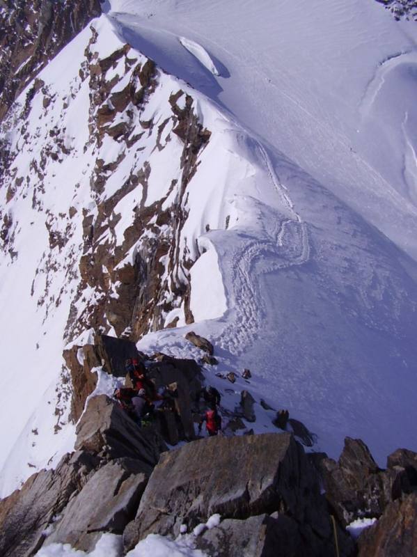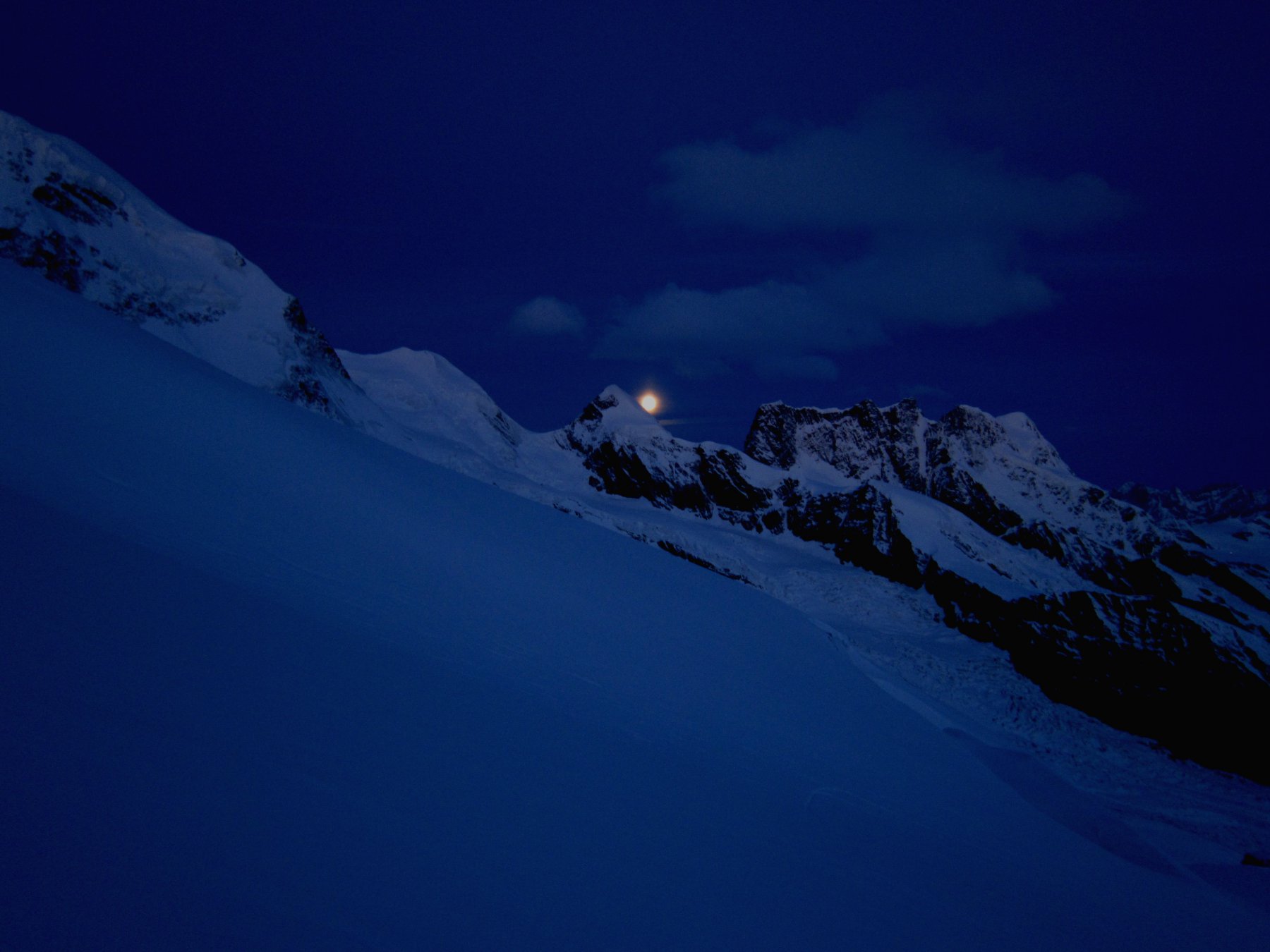 Risalire i dolci pendii tenendosi sulla destra per evitare una zona crepacciata e giungere al plateau a circa 4100m.Risalire il pendio del Silbbersattel(4515) aggirando dei grossi crepacci.