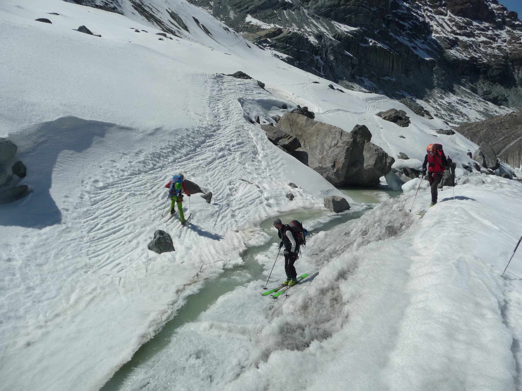 Salire parallelamente alla morena fino ad un ripido pendio da cui si esce a sinistra.