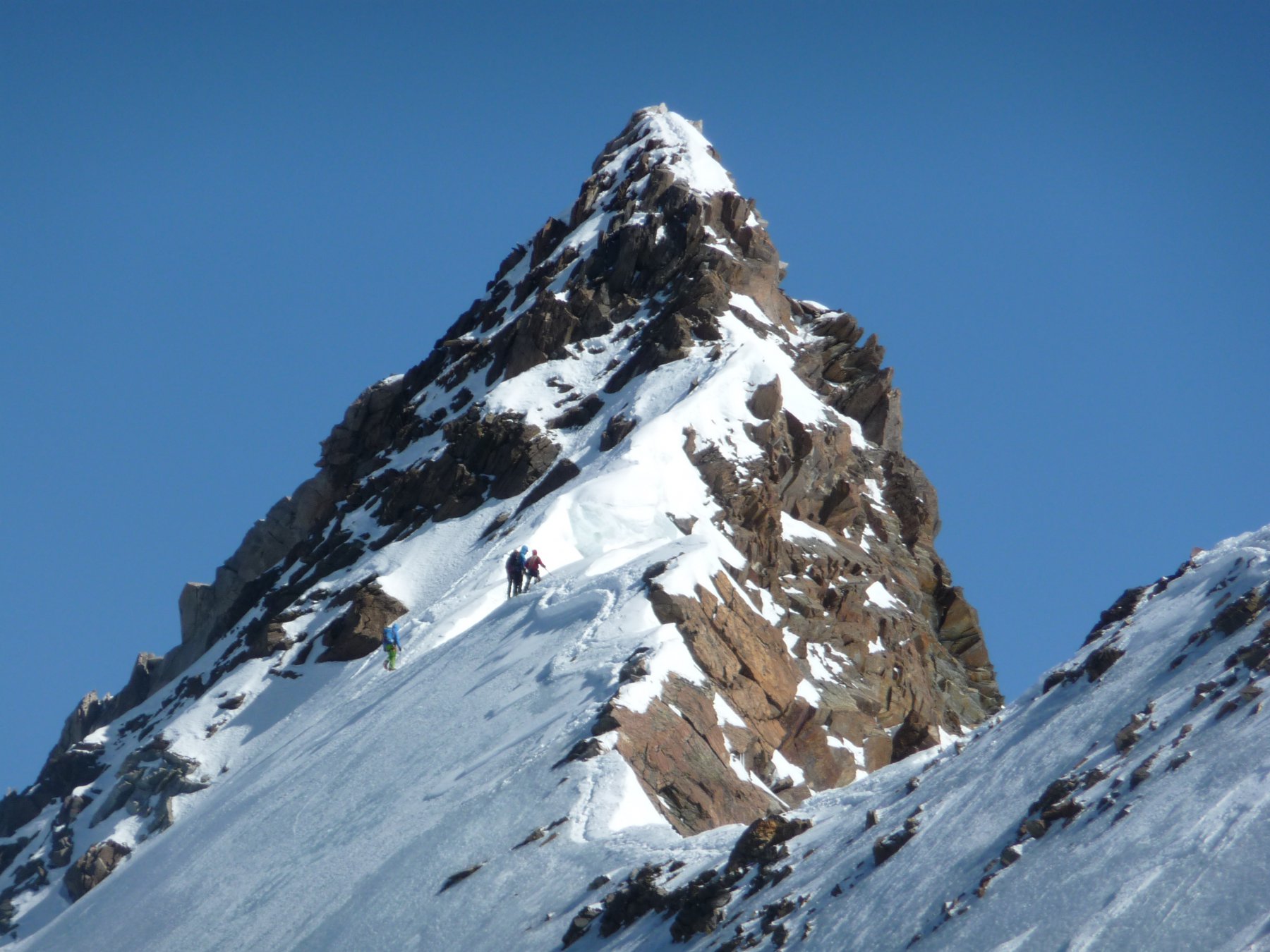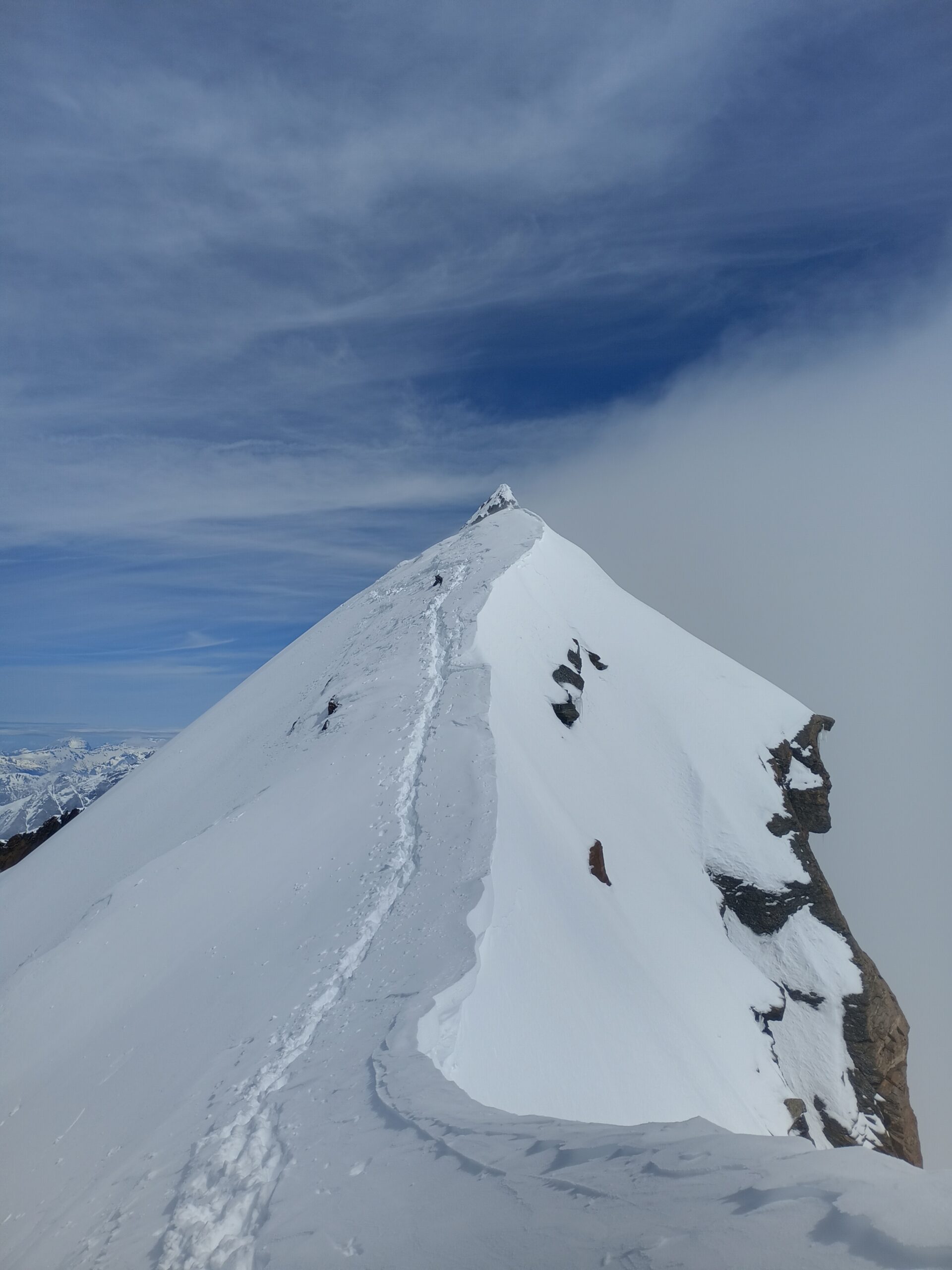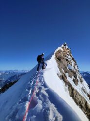 Lasciati gli sci al colle seguire la cresta principalmente nevosa e risalire l’ultimo tratto non banale di roccia/misto.