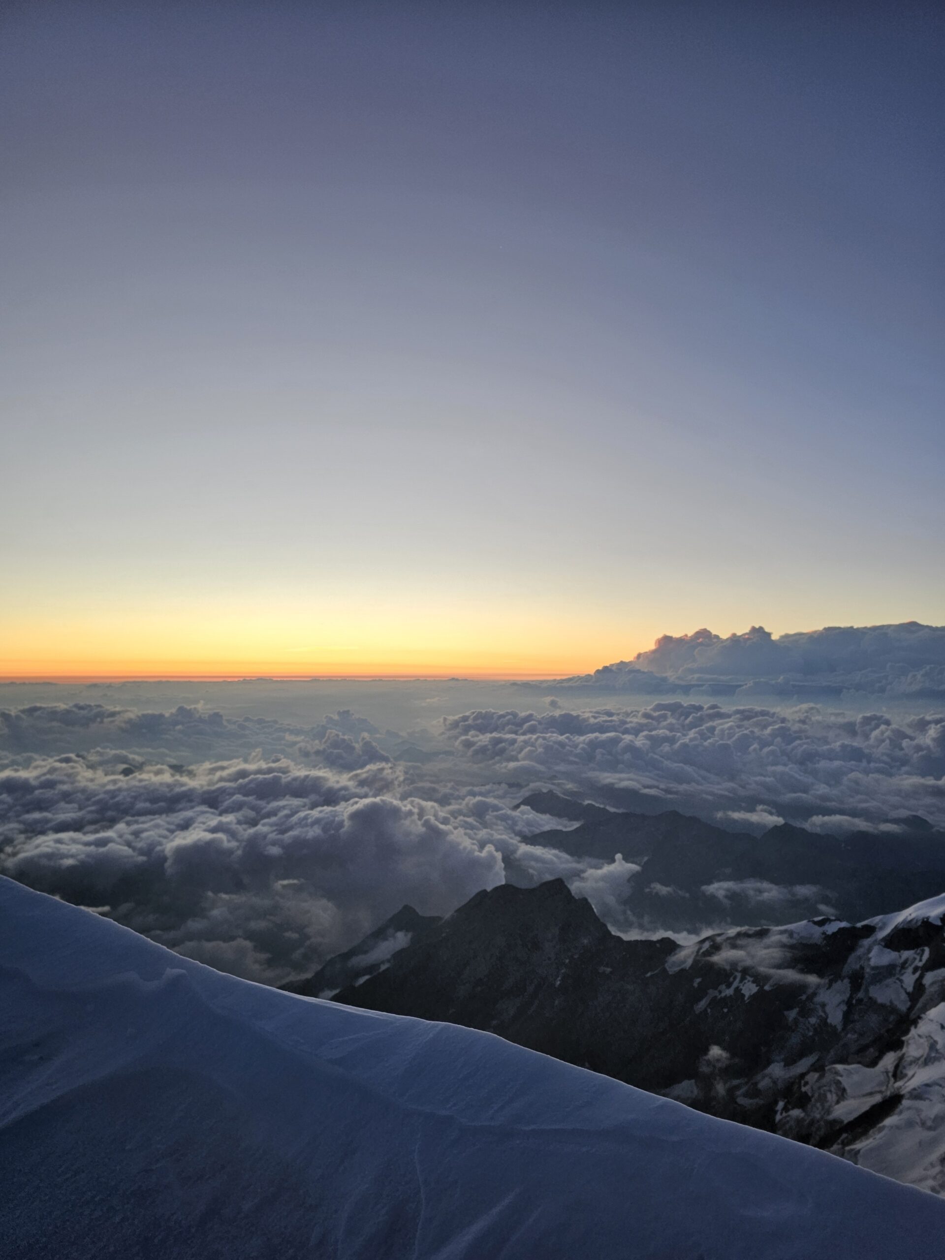 Cresta finale trovata a tratti ghiacciata e con alcune cornici, nel complesso comunque non preoccupanti. In salita abbiamo usato tre viti per superare un punto più affilato, in discesa è stato sufficiente restare nella nostra traccia ben battuta.