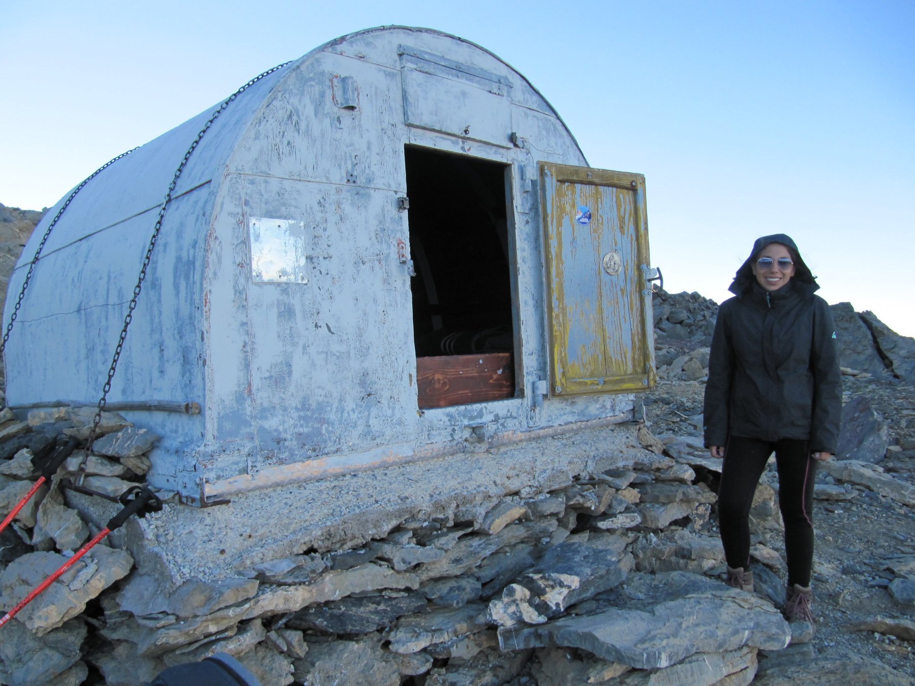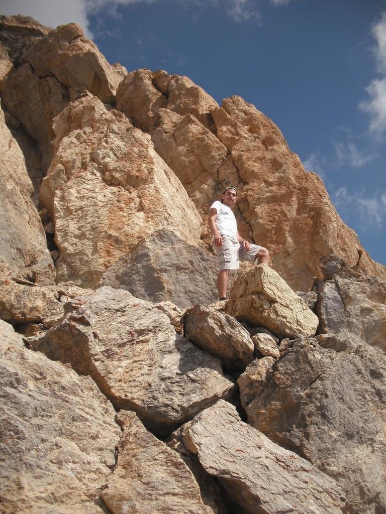 prima di arrivare al colle e sotto la cima rocciosa del Massour, si abbandona il sentiero (presente una palina con indicazioni bivacco Montaldo), puntando al gigantesco conoide di detriti mobili posto subito prima di una caratteristica verticale parete rossastra.