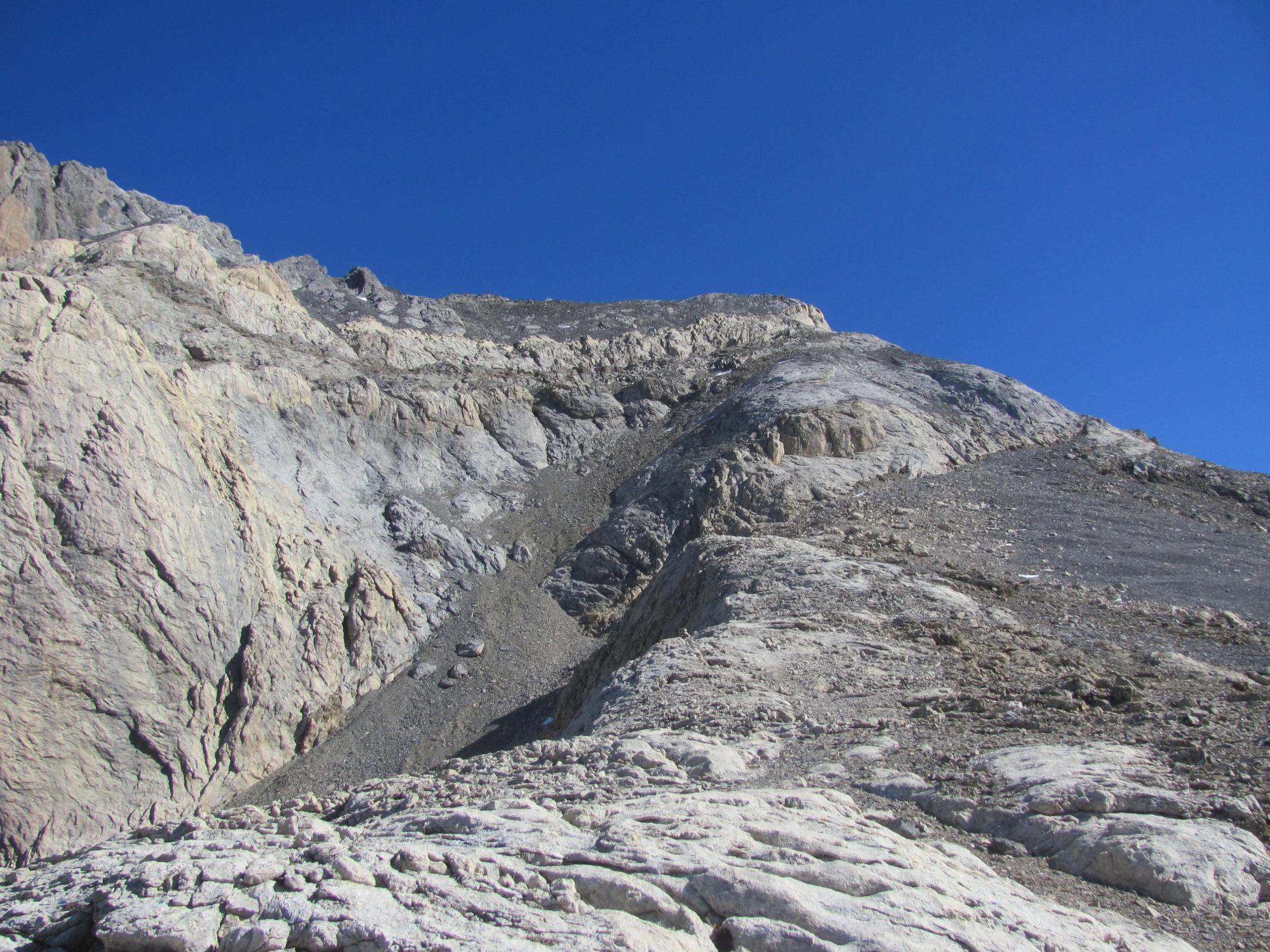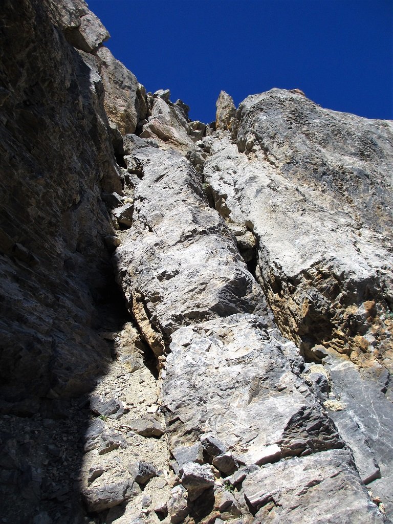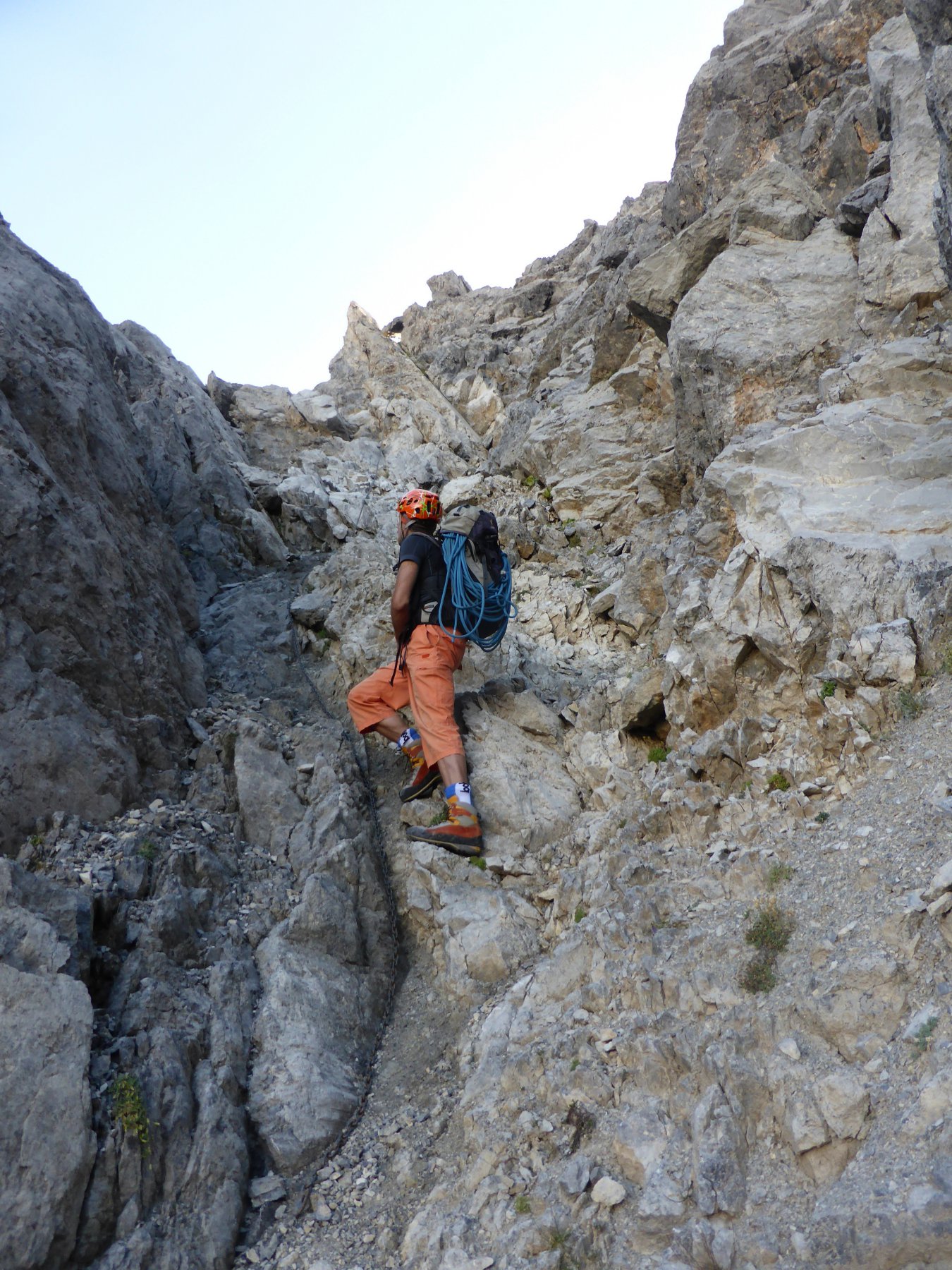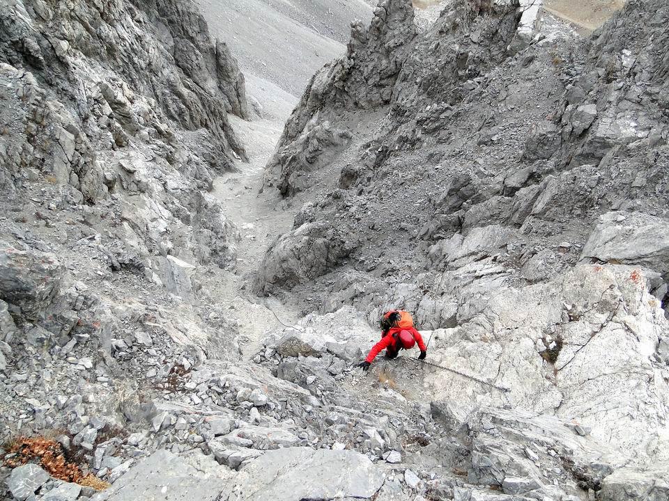 Si segue al meglio il conoide fino all’imbocco di un canale nascosto che sale verso sinistra, si risale il canale per faticosi detriti fino alla strozzatura finale attrezzata di catene fisse e spit.