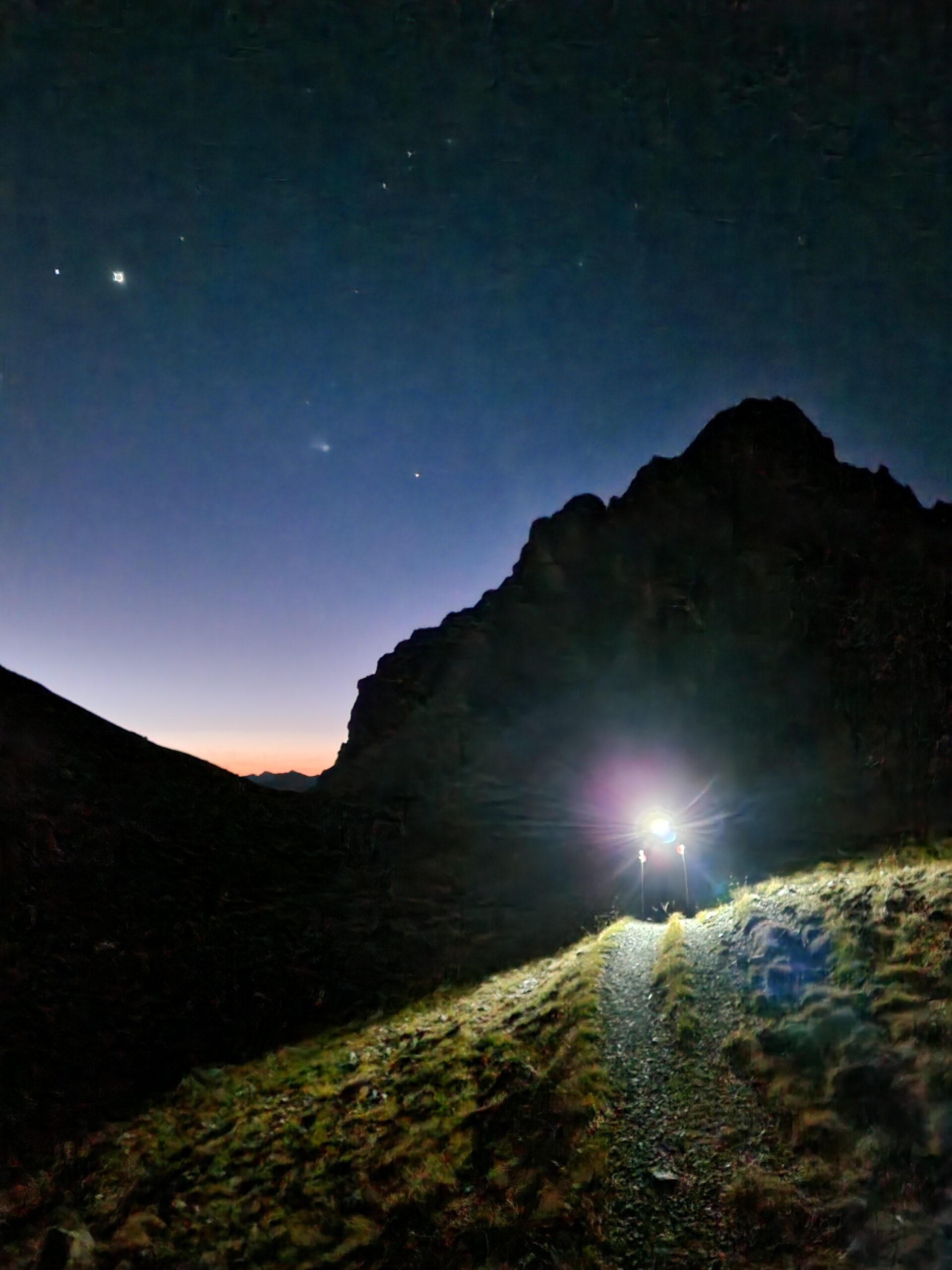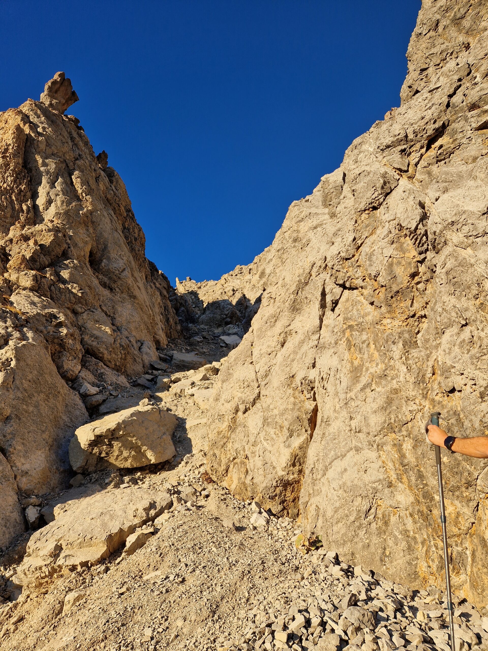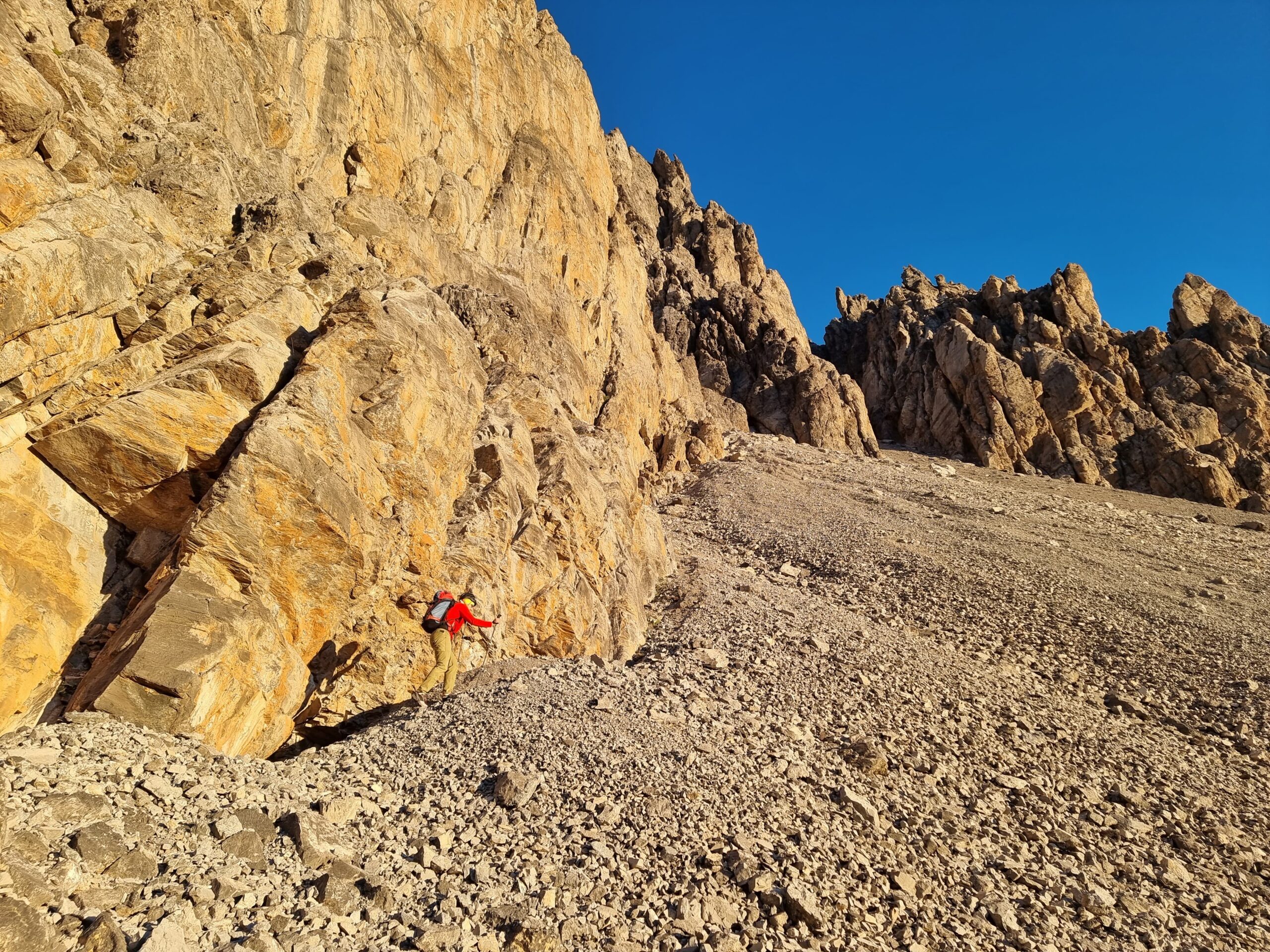 Si segue al meglio il conoide fino all’imbocco di un canale nascosto che sale verso sinistra, si risale il canale per faticosi detriti fino alla strozzatura finale attrezzata di catene fisse e spit.