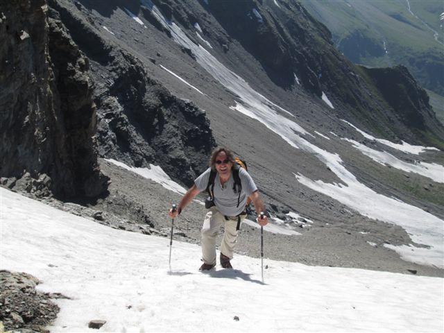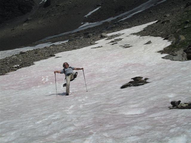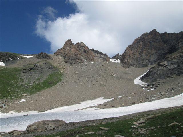 Canalino finale di 10 m. sotto il colle ancora innevato ma percorribile senza ramponi o comunque evitabile su roccette alla sua sx (in discesa lo abbiamo aggirato alla sua dx ma lo sconsiglio per terreno molto franoso ed instabile).