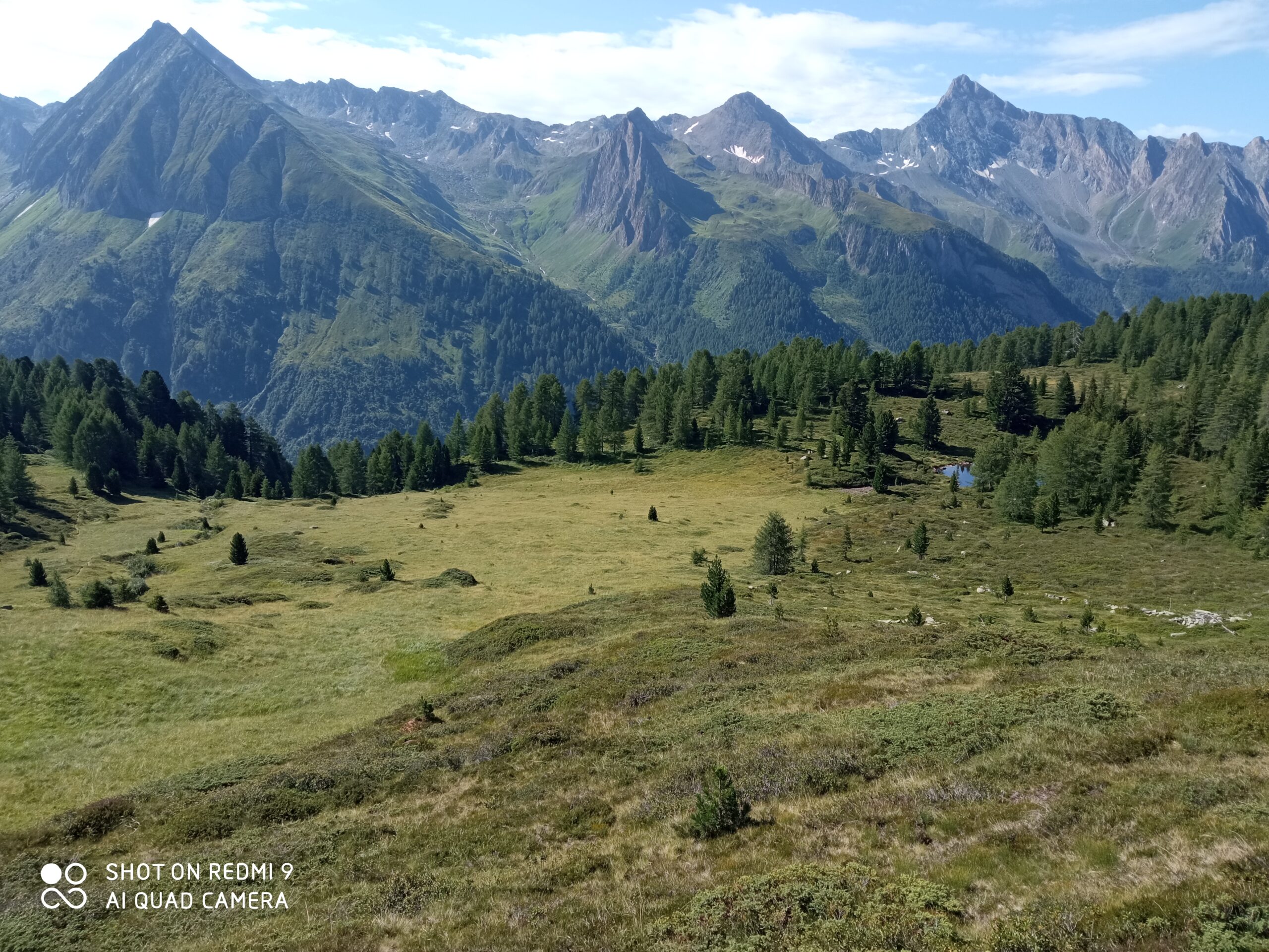 Dal parcheggio si procede per pochi passi fino al tornante dove i cartelli indicano il sentiero 4 per i rifugi Europa e Passo di Vizze e per la Malga Griepl. Si sale attraversando un’ampia mugheta su sentiero ben tracciato e segnato b/r fino a un bivio, anch’esso con cartelli. Si segue a sinistra (direzione ovest) l’indicazione del sentiero 4a per il rifugio Europa e la malga Griepl mentre il 4 prosegue a destra verso il rifugio Passo di Vizze e sarà la traccia di discesa per chiudere l’anello. Il 4a passa brevemente per un bosco e sbuca all’ingresso della radura dei ruderi in legno della malga Griepl. Si prosegue e, attraversata la radura, si volge verso nord guadagnando facilmente quota su prati più ripidi sempre su ottima traccia fino a incrociare il sentiero 3 che proviene dal Passo di Vizze e porta al Rifugio Europa. Da questo punto la croce del Nusserkopf è ben visibile al di sopra della pietraia del breve versante ovest che lo compone. Si svolta in direzione del Passo di Vizze su traccia in falsopiano fino a quando il sentiero, contornando il perimetro della cuspide del Nusserkopf, curva a gomito verso sinistra. In quel punto ci sono 3 ometti, il primo, che ho composto un attimo prima della curva, indica il tracciolino da prendere per salire più comodamente la breve prominenza della vetta. Si sale seguendo la traccia sempre visibile tranne in un punto dove si passa sulla sinistra una breve pietraia (composto 3 ometti), dopodiché si arriva sotto la croce. Giusto tre semplici passetti su roccetta per toccare la croce.