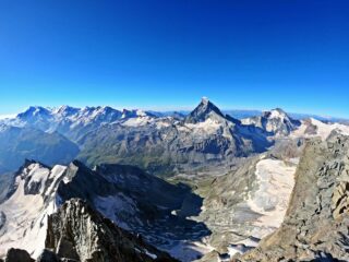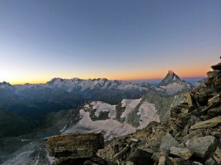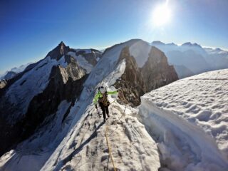 Al mattino colazione alle 3.30, poi si parte alla sinistra del rifugio quasi subito su ghiacciaio, trovato in buone condizioni con pochi crepacci evidenti. L’attacco della Wellenkuppe è abbastanza tracciato, nella parte iniziale meglio stare più a sinistra e poi deviare verso destra dopo una cinquantina di metri, volendo dove c’è una corda fissa ma il percorso non è obbligato, poi si prosegue dove sembra più logico seguendo anche qualche ometto, su buona roccia. Parte nevosa tracciata e più ghiacciata nella discesa. Gran gendarme facilmente superabile grazie ai canaponi. Poi nuovamente la cresta nevosa ora è un po’ ghiacciata e la traccia stretta tra le cornici da una parte e il pendio della Nord dall’altra, richiede un po’ attenzione. Cresta finale sempre su ottima roccia, ha 10 m un po’ più ostici su placche più lisce dove non si riesce a proteggere molto, per il resto non ci sono passaggi particolarmente difficili. Dalla cima panorama spaziale, con di fronte la magnifica Nord del Cervino. In discesa abbiamo disarrampicato con qualche tratto in conserva protetta, abbiamo fatto solo 2 doppie (sul passaggio duro della cresta finale e una più breve scendendo dalla Wellenkuppe) ma eventualmente si trovano tantissime soste per calarsi.