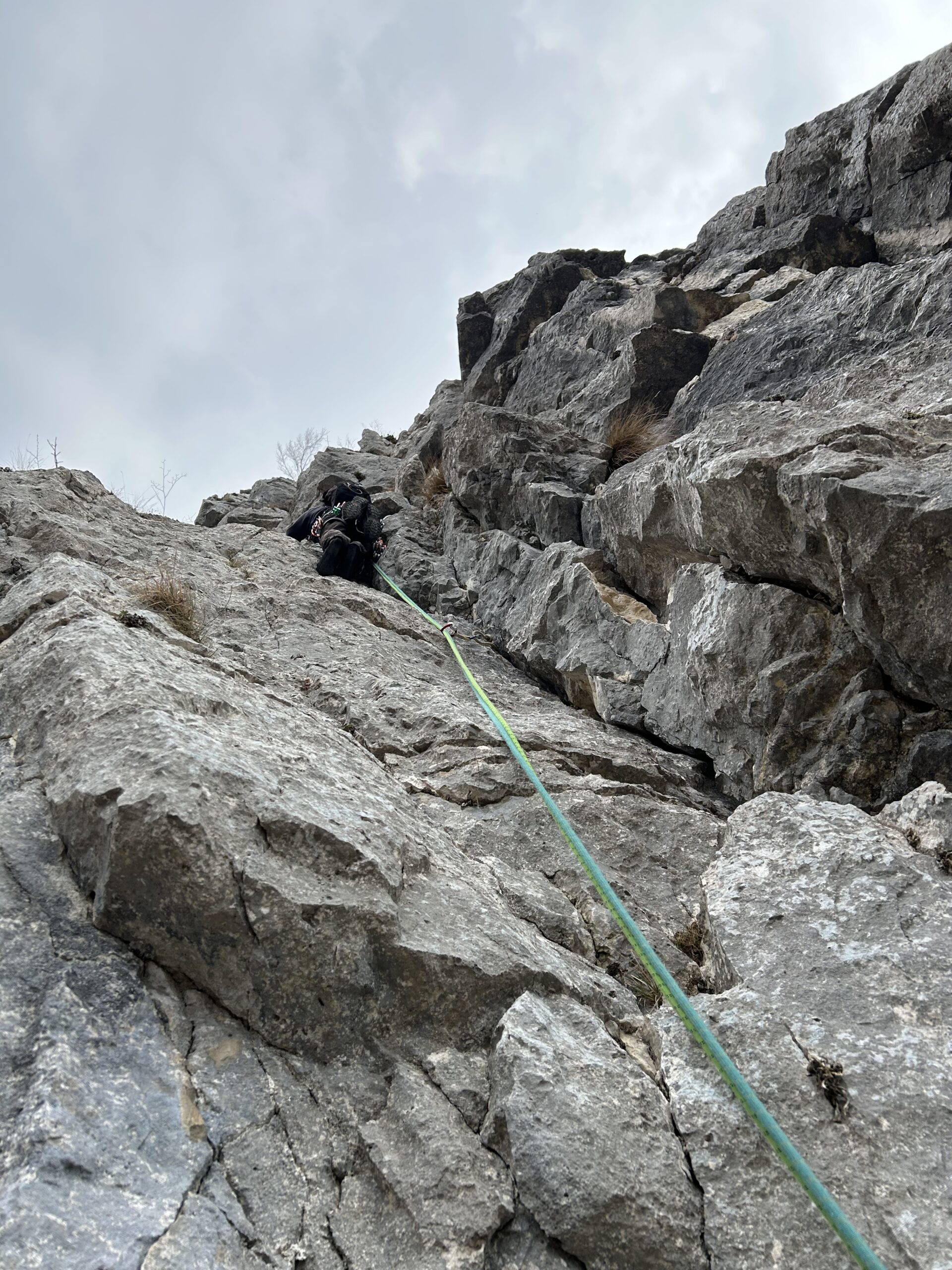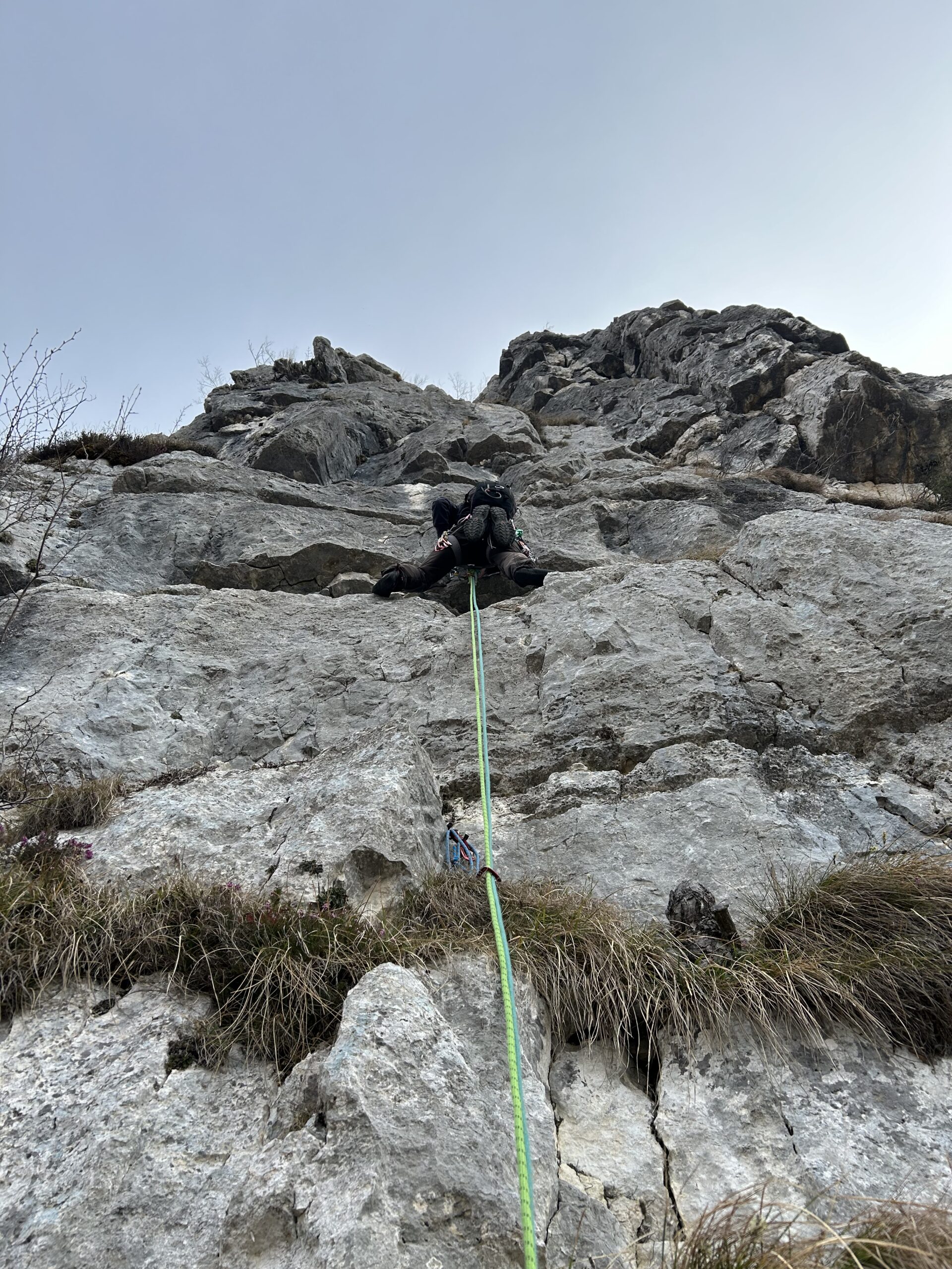 L1: Dal chiodo sulla cengia erbosa ai piedi della parete salire le compatte placche fino all’evidente prima sosta alla base di un diedrino fessurato (5 chiodi oltre a quelli di sosta, un cuneo di legno, sosta su 2chiodi, 30m, IV+)