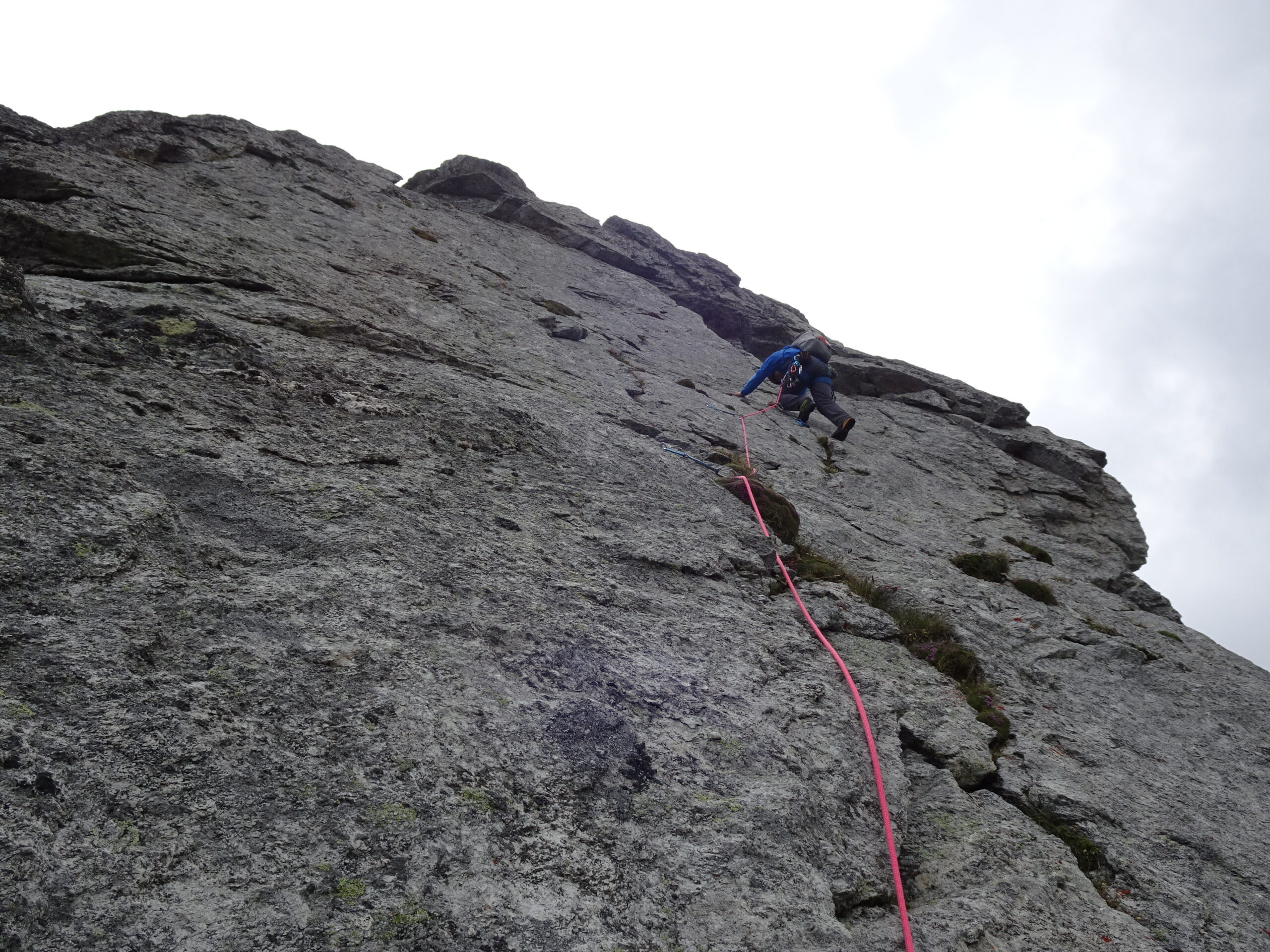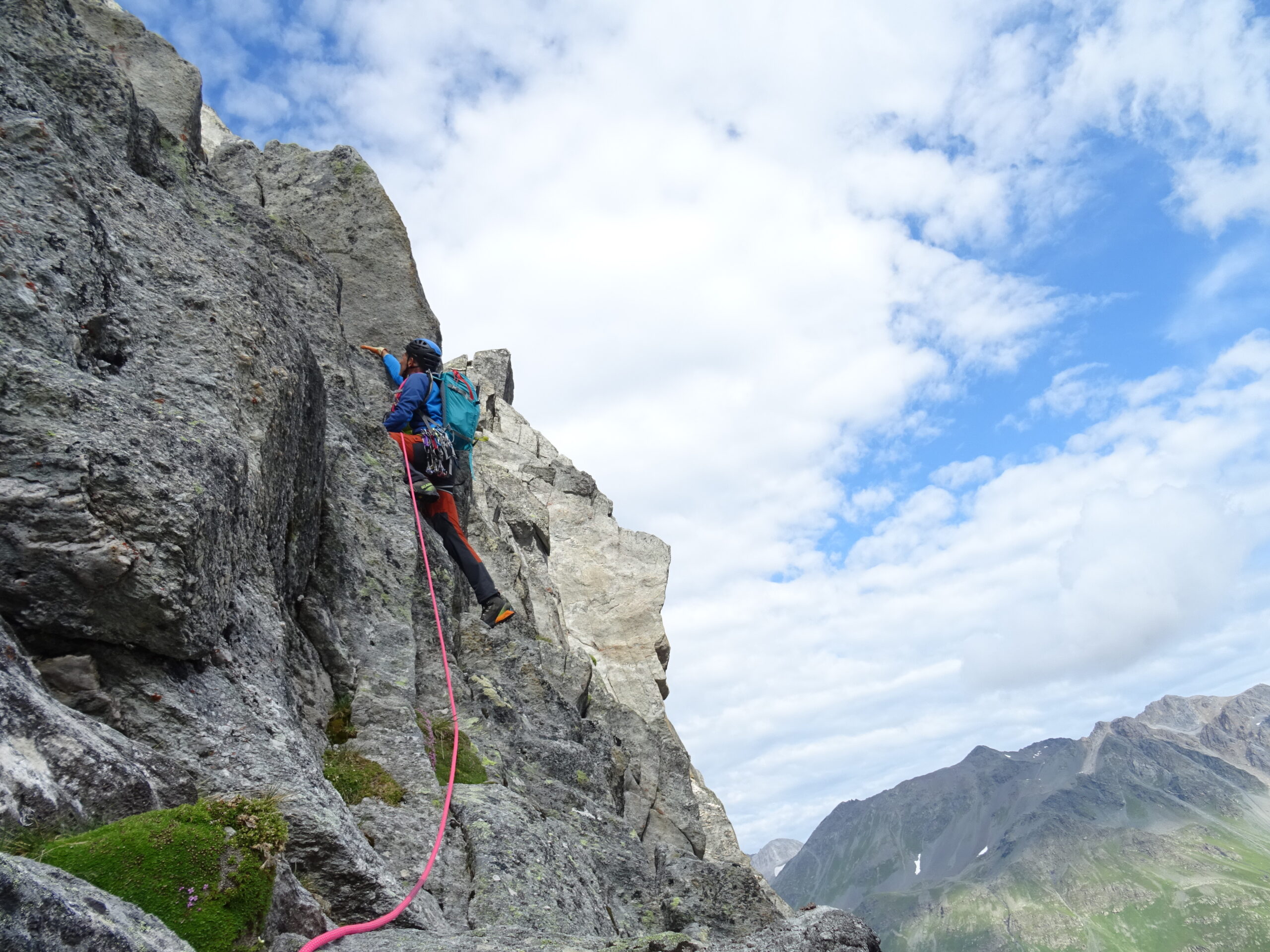 Gradoni articolati (passi di III) in diagonale prima verso sx e poi verso dx (3 soste a fix) permettono di raggiungere il filo di cresta vero e proprio. Seguire la cresta con bei passaggi generalmente in placca (da III a IV, qualche fix). Quando possibile piegare sul fianco sx della cresta, fino ad arrivare, dopo una breve disarrampicata, ad un passo chiave, un placca di V sostenuto (15m, 3 fix e 1 ch). Superato questo tratto, si prosegue di nuovo sul filo della cresta, con passi spesso di III-IV su roccia bellissima (alcune soste e fix). Si arriva così ad una seconda forcella, che richiede una discesa un po’ delicata (fix di assicurazione con cordone sulla dx), quindi si giunge alla base della paretina finale (40m, IV+), che sbuca in cima.