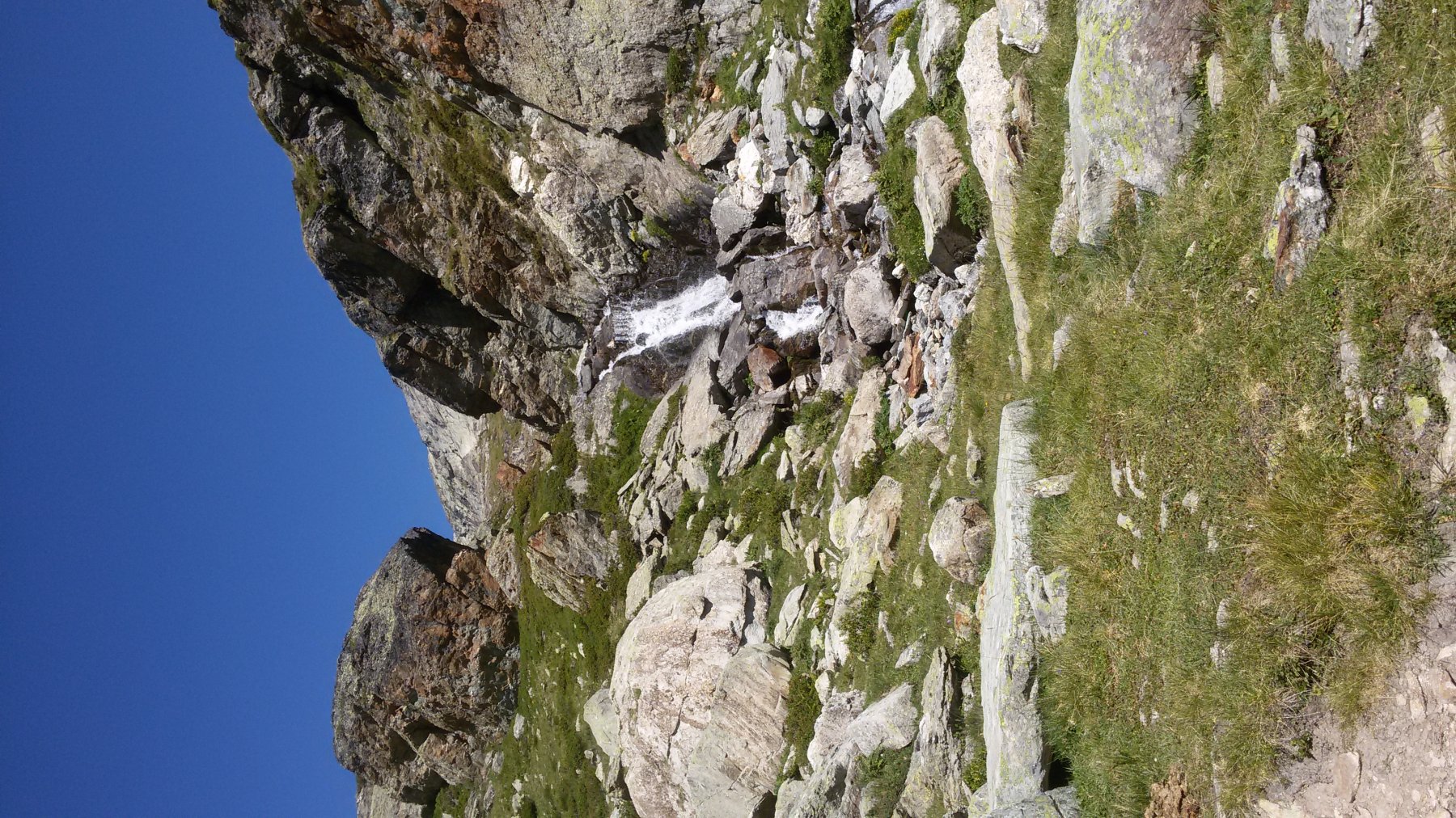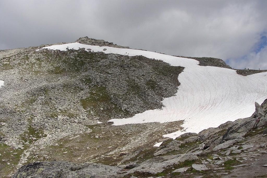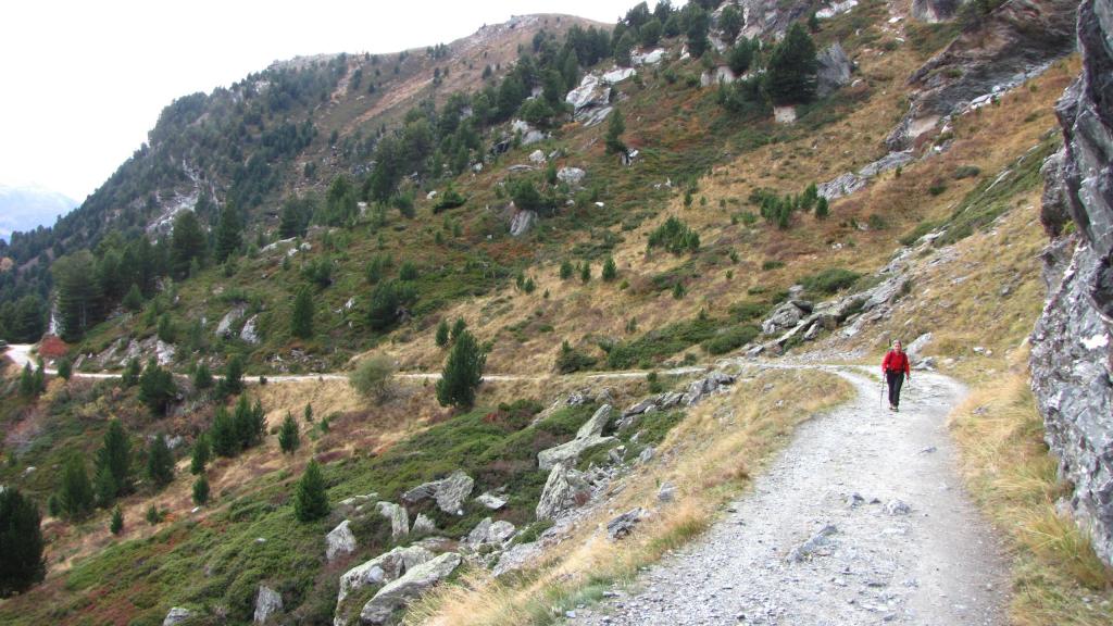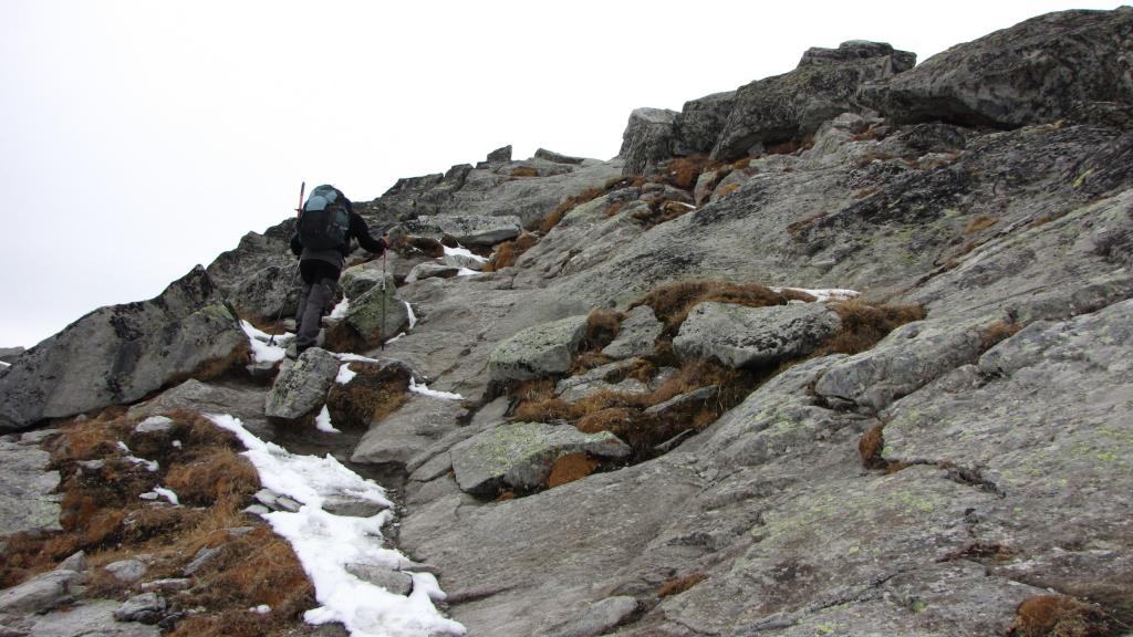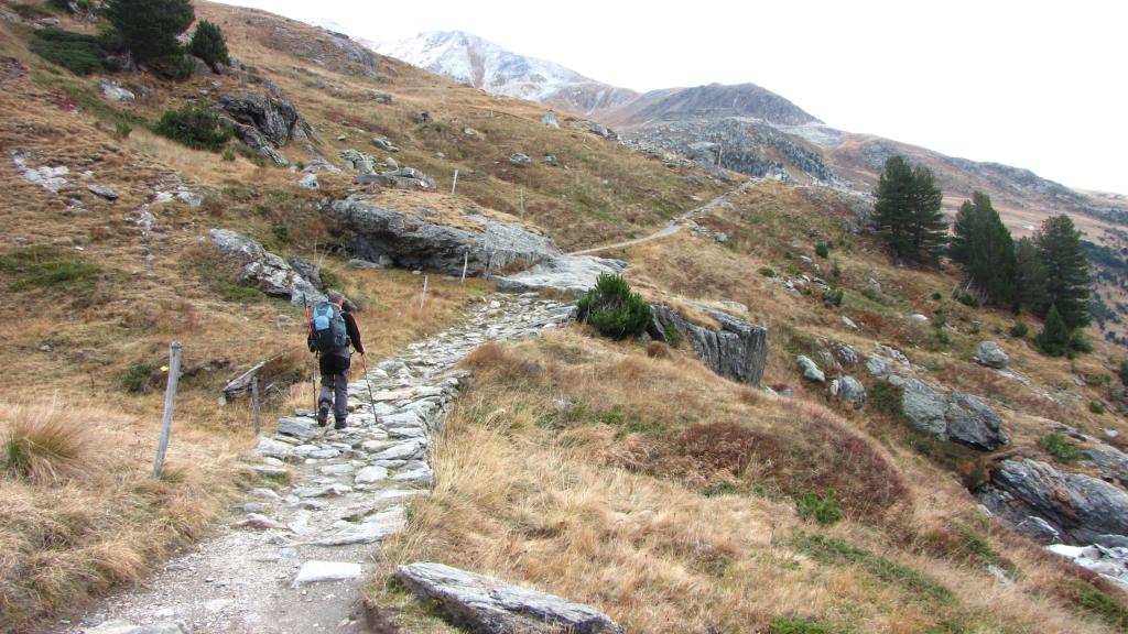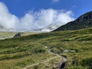 Piegando a destra, il sentiero risale una ripido pendio detritico e di rocce montonate, guadagnando quota rapidamente, poi si incunea in un valloncello di pietroni e lastronate, con alcune diagonali prima a destra e poi a sinistra in direzione di una grande croce di legno (utile riferimento per la salita in caso di scarsa visibilità).