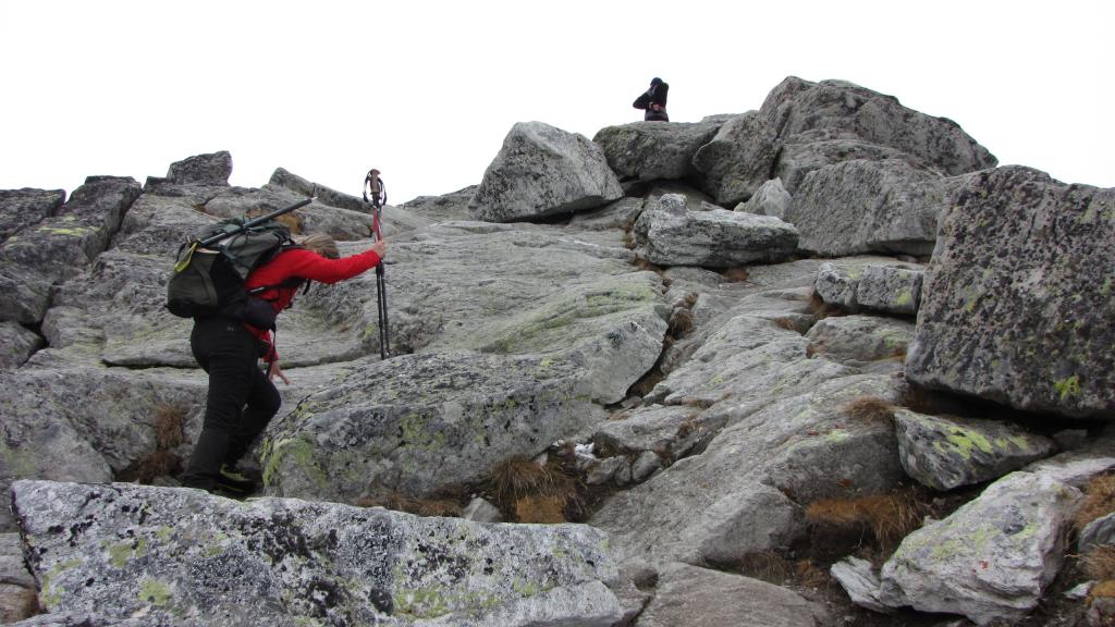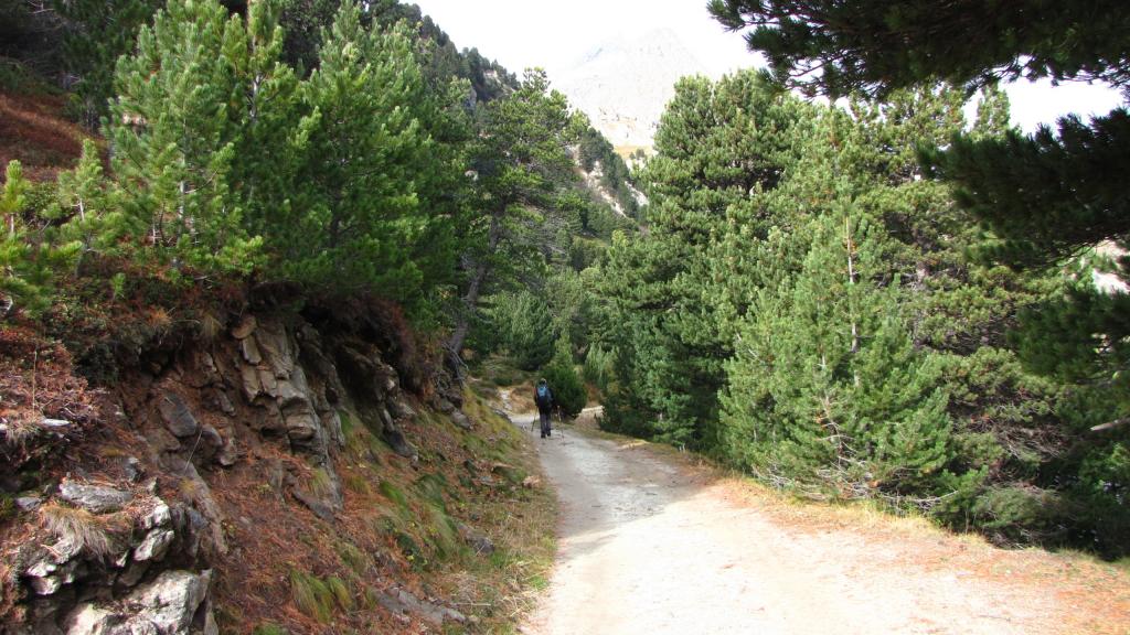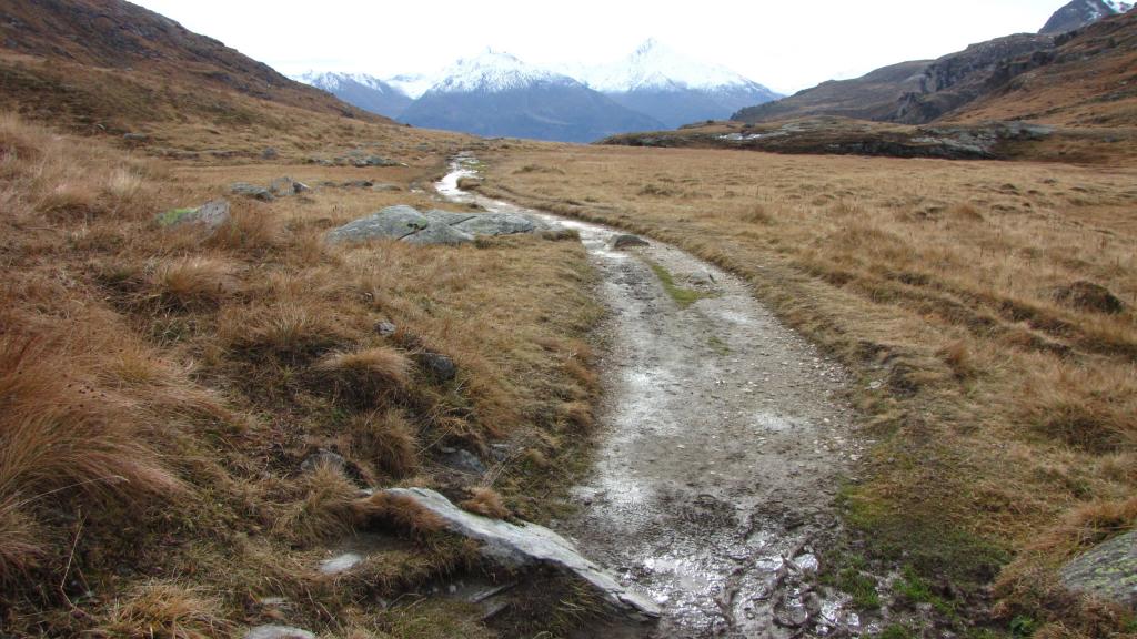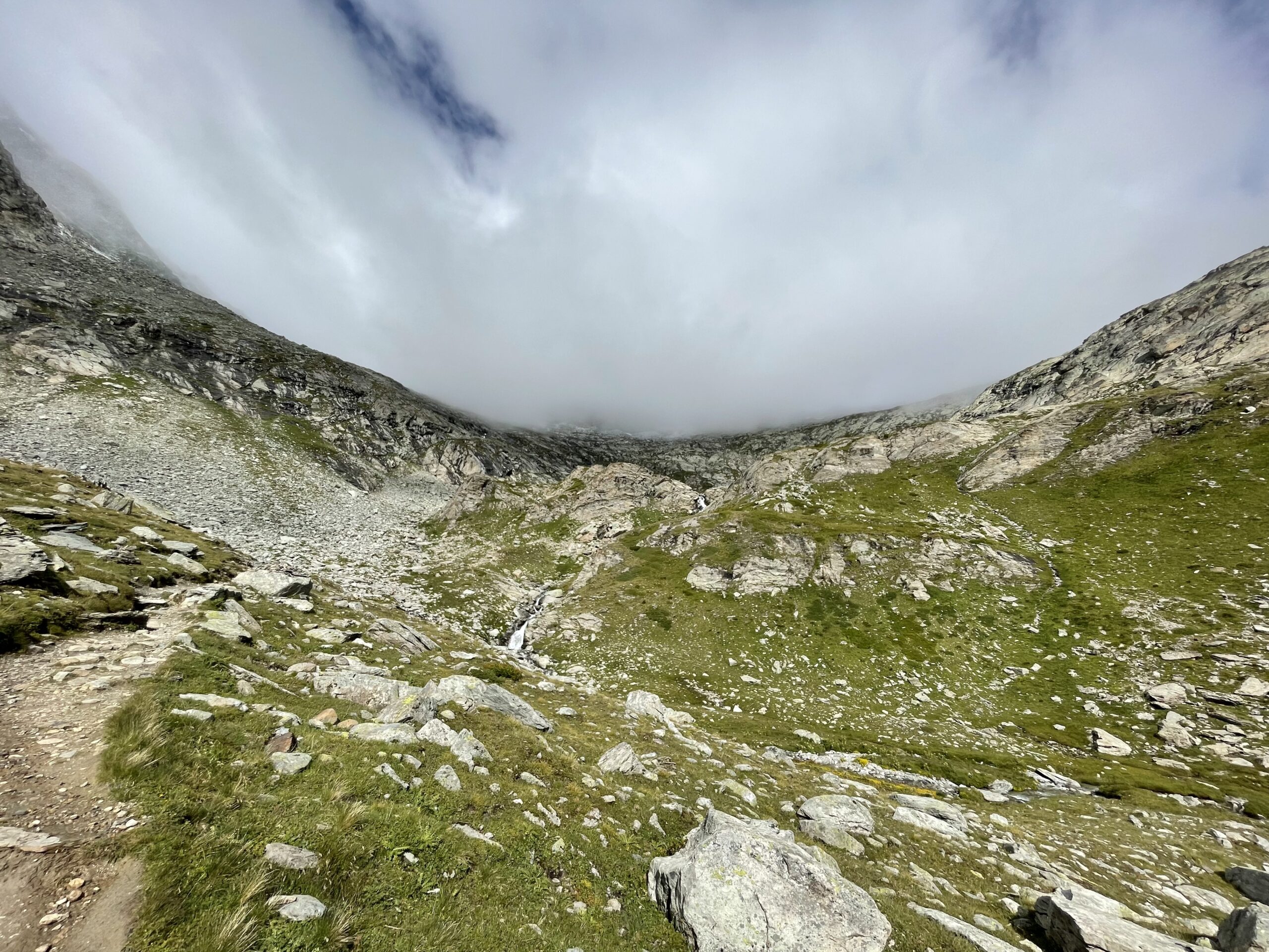 Piegando a destra, il sentiero risale una ripido pendio detritico e di rocce montonate, guadagnando quota rapidamente, poi si incunea in un valloncello di pietroni e lastronate, con alcune diagonali prima a destra e poi a sinistra in direzione di una grande croce di legno (utile riferimento per la salita in caso di scarsa visibilità).