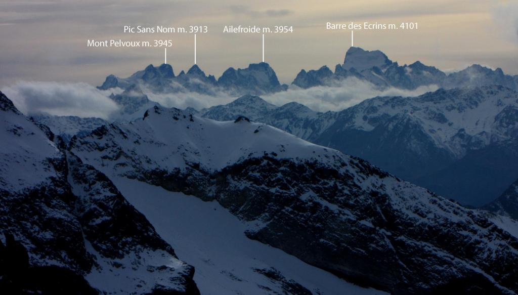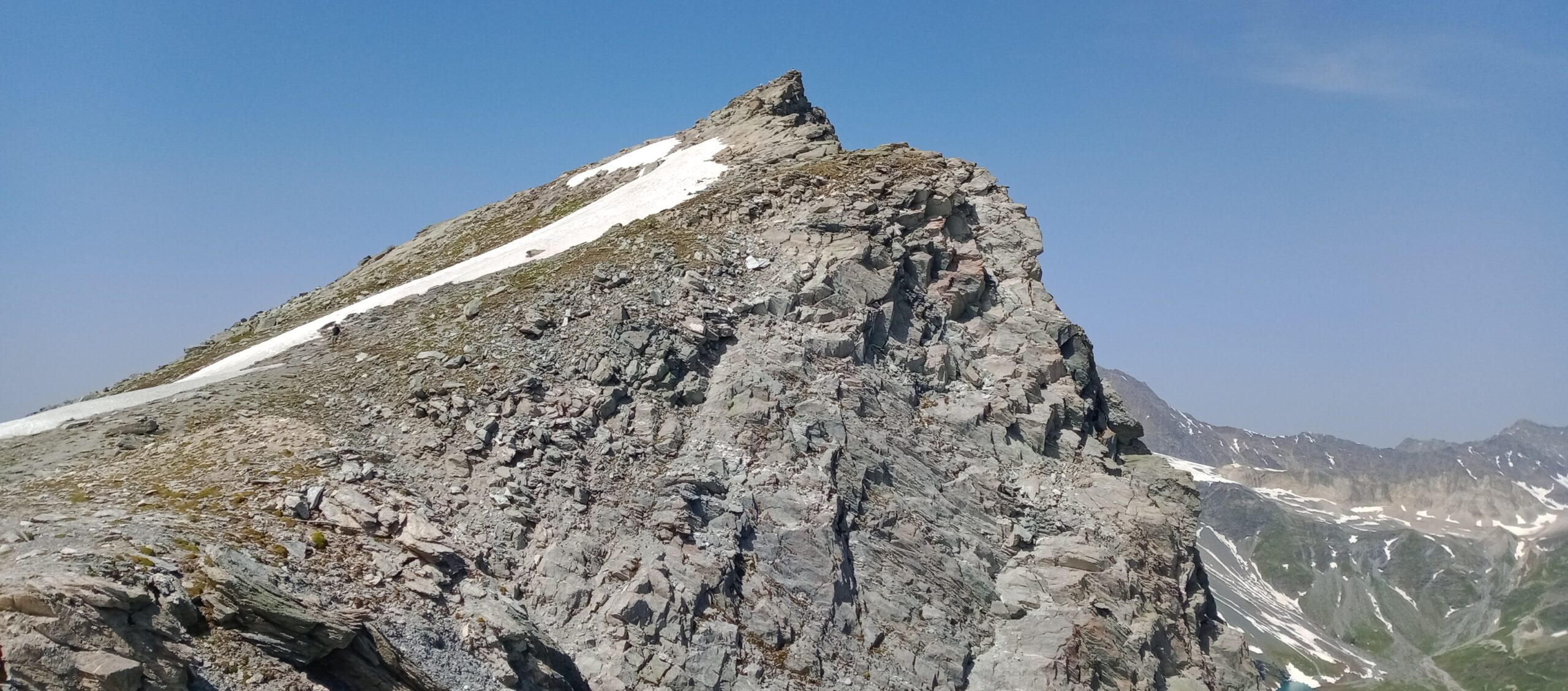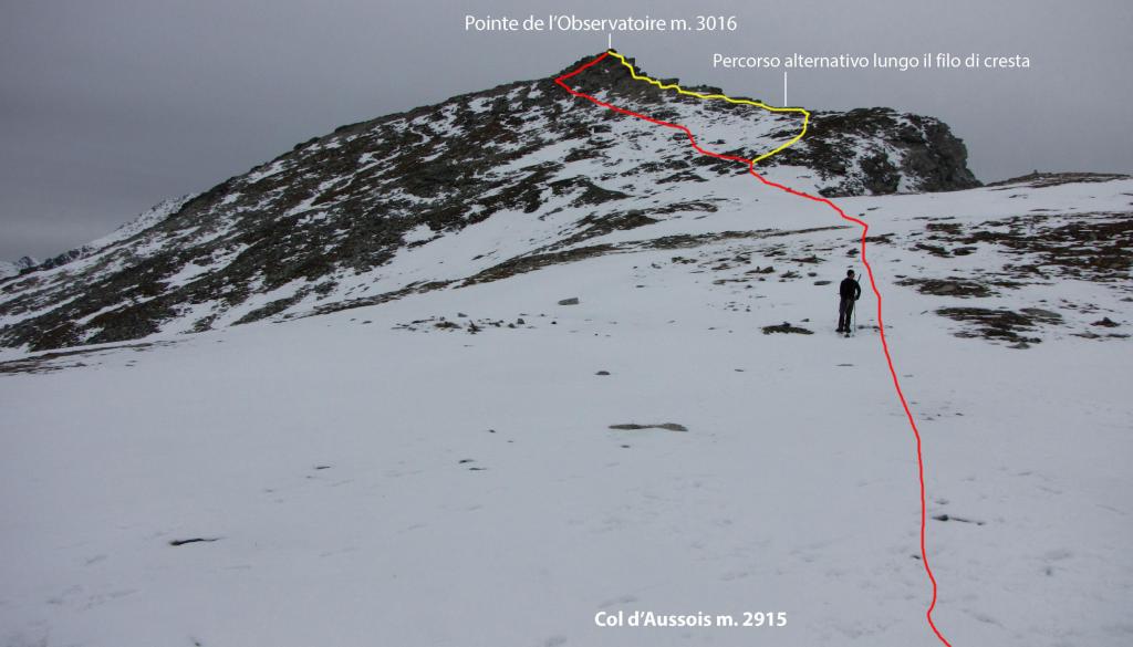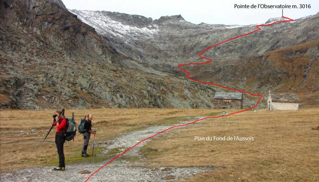 Passando un poco a monte della croce in legno, si raggiunge un dosso roccioso dove sono ben visibili sia il Col d’Aussois, piegando a destra, guidati dai segni gialli e numerosi ometti si raggiunge l’ampia spianata del Col d’Aussois m. 2915 (ometto di pietre e cartello indicatore). Dal colle si segue una traccia di sentiero che sale pochi metri sotto il filo della cresta Sud, salendo per sfasciumi e facili roccette, arrivati sotto la cima, si traversa leggermente verso destra per una breve placca, poi alcune rocce a gradoni portano sull’aerea cima della Pointe de l’Observatoire, costituita da due grossi roccioni sospesi verso il Vallon de Polset.