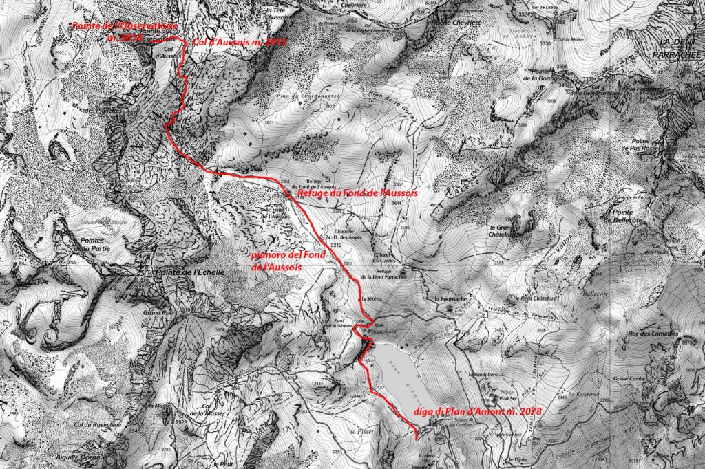 Trascurando il ramo di destra che sale verso i Rifugi di Plan Sec, de la Fournache e Dent Parrachée) si volge a sinistra (cartello indicatore per il Refuge du Fond d’Aussois e il Col d’Aussois) dove il sentiero prima in leggera salita e poi con percorso pianeggiante raggiunge l’ampio e grande pianoro del Fond d’Aussois a quota 2300 m.