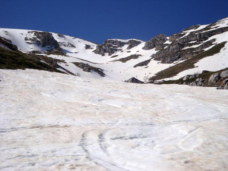 dall’abbeveratoio procedere lungo la diramazione dx della strada ed iniziare a salire in obliquo verso la montagna.Proseguire scavalcando alcuni dossi e giungere al macereto ai piedi della Fossa Grande.Risalire lo scivolo iniziale ripido,fin quando si raggiunge una conca più pianeggiante (la Fossa Grande).Proseguire verso uno sperone roccioso al fondo della conca.nei pressi dello sperone,volgere a sx e rimontare un gradino più ripido che sfocia in una valletta.Percorrere tutta la valletta e ,al suo termine (in vista della Fossetta),volgere decisamente verso dx per rimontare un ampio pendio che termina sulla cresta pianeggiante,lungo la quale,in direzione Sud-Est si arriva subito in vetta.