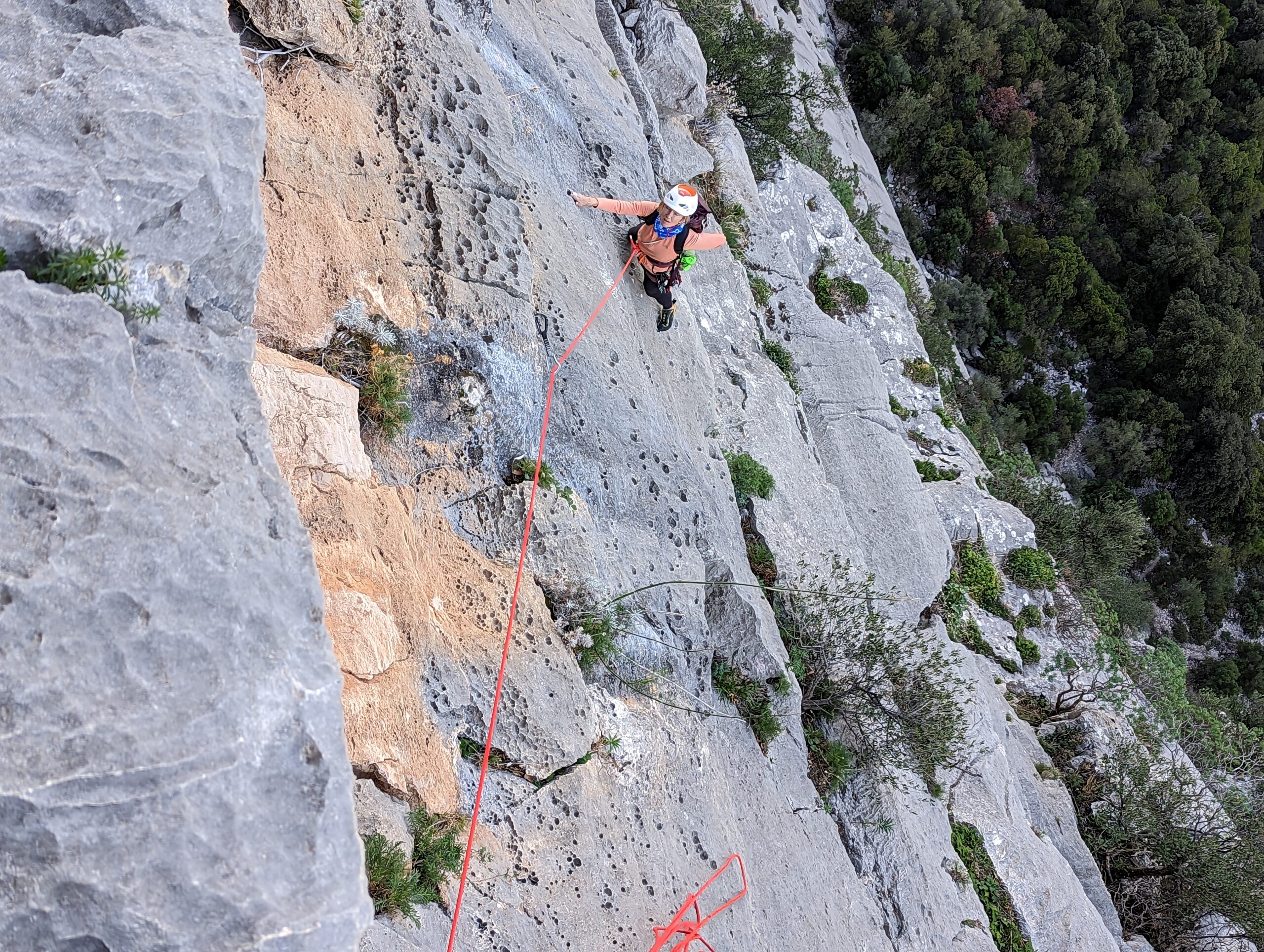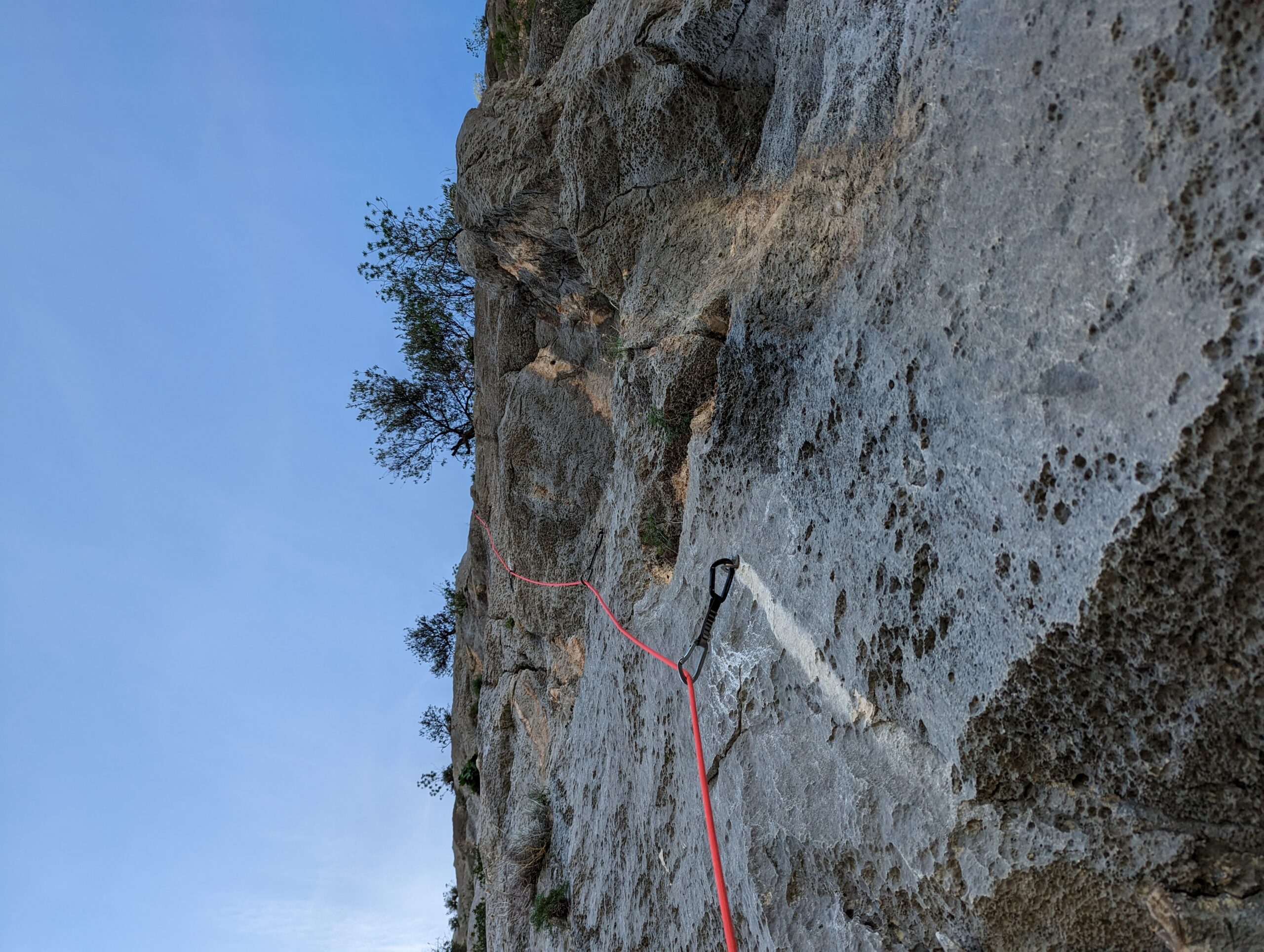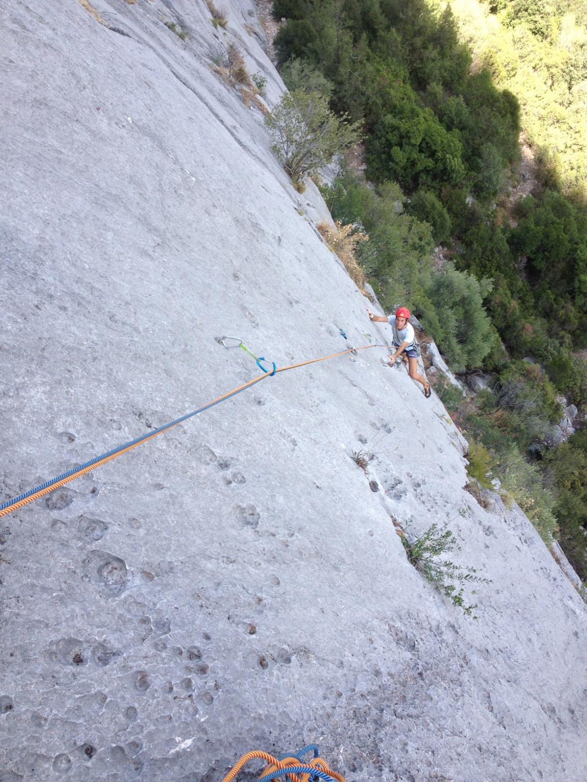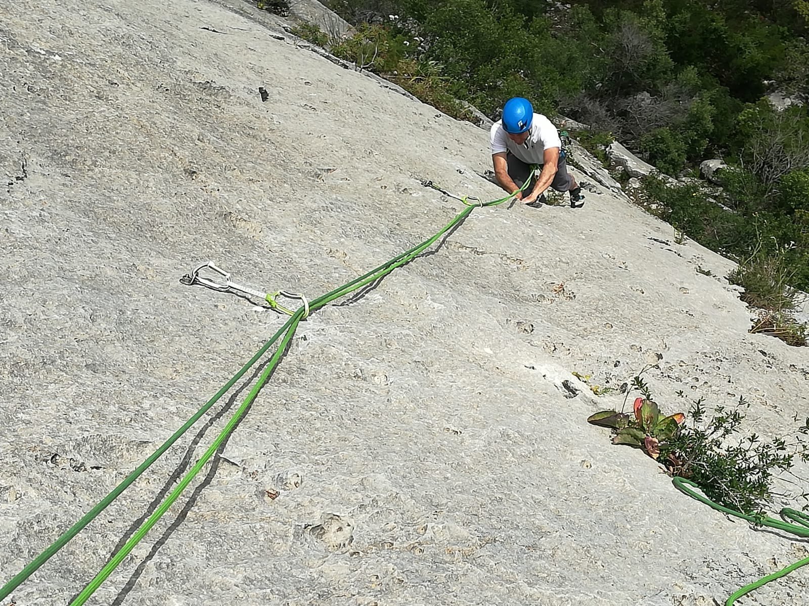 Superare un bombè e continuare per una serie di piccoli strapiombi con arrampicata atletica e continua oltre i quali si sosta sulla destra (meglio allungare qualche protezione per evitare l’attrito delle corde).
