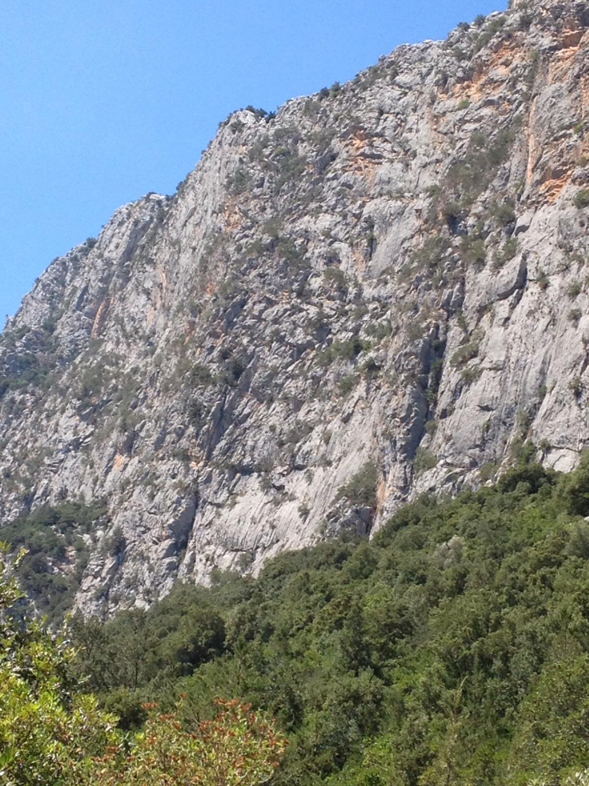 Proseguire ora a piedi in direzione opposta all'indicazione per le Gole di Gorropu seguendo la recinzione al termine della quale parte un sentiero che segue la base della parete che si segue fino alla gran placca dove corrono la nostra africa, la nostra Sardegna, alla sinistra di quest'ultima l'attacco sotto un leccio