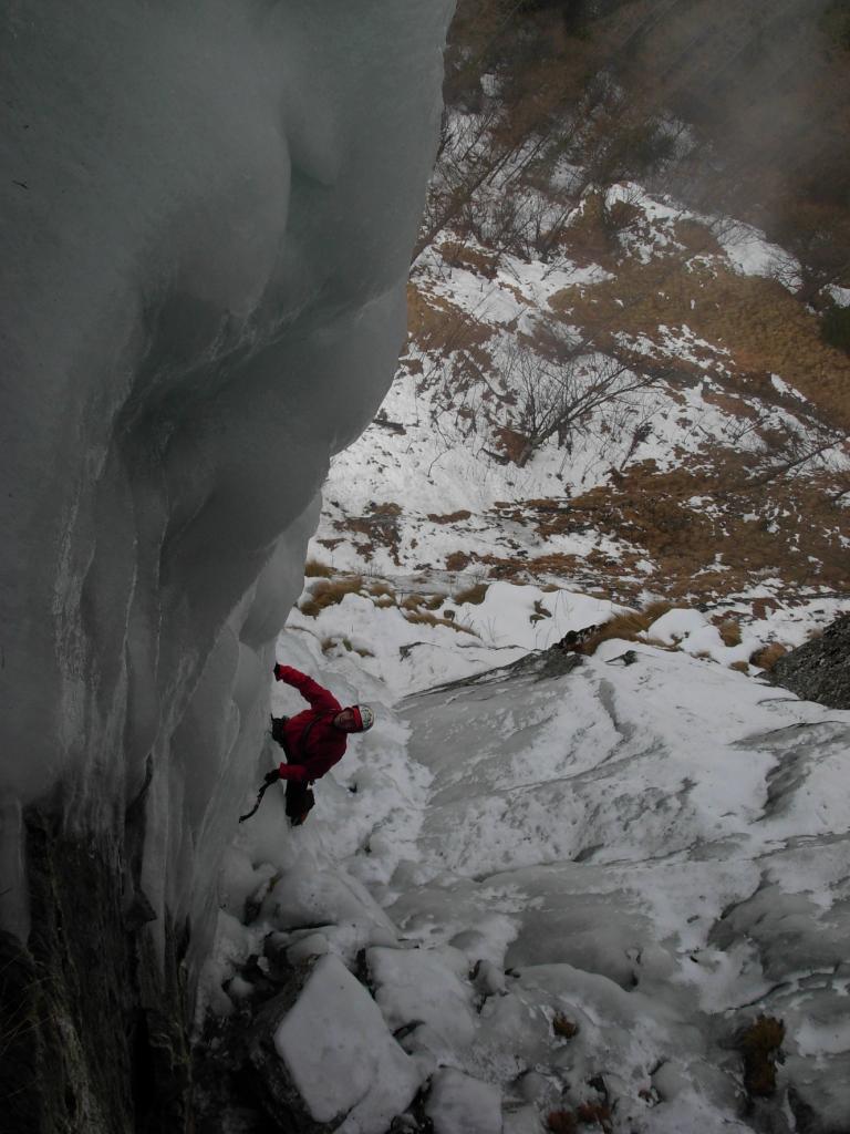 L3: free-standing seguito da parte appoggiata, sosta su ghiaccio e spuntoni su una cengia a sx;