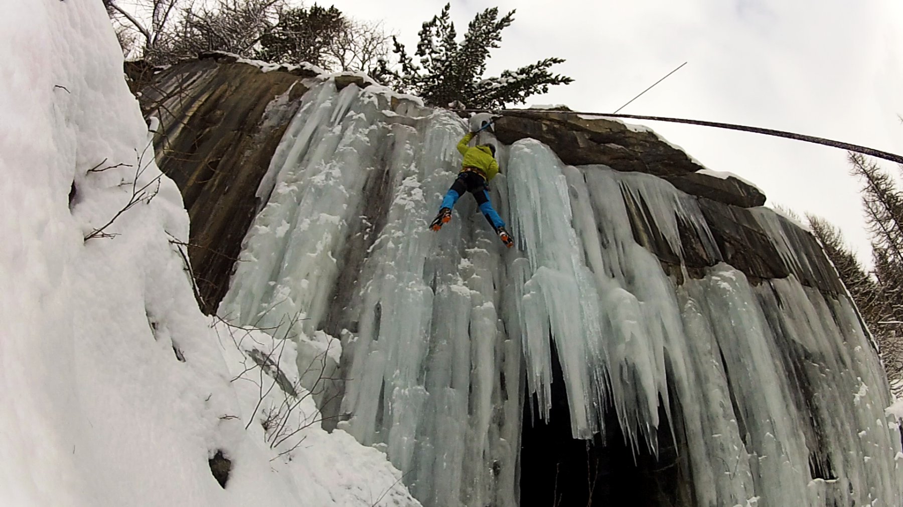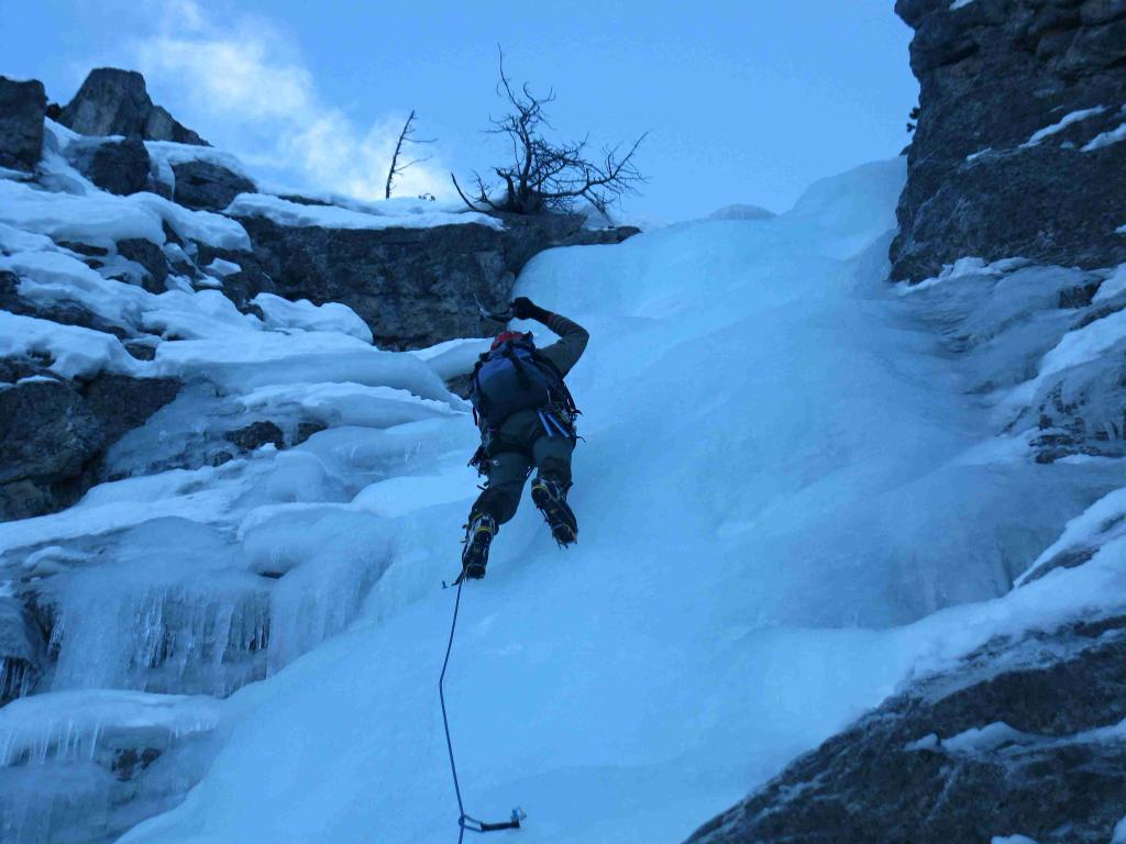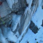 Itinerario: Il primo salto si presenta sotto forma di una stretta e facile rampa a 70°. Percorrerlo per giungere dopo 15 metri su un ripiano nevoso alla base del secondo salto, che si presenta sotto forma di colonnato stalattitico per 15 metri interrotto a metà solamente da un piccolo pulpito verticale largo 20 centimetri. Scalarlo dove la struttura è più solida (90°), uscendo su ghiaccio esilissimo su un pendio di erba mista a ghiaccio inclinato a 80°. Sosta su pino a destra