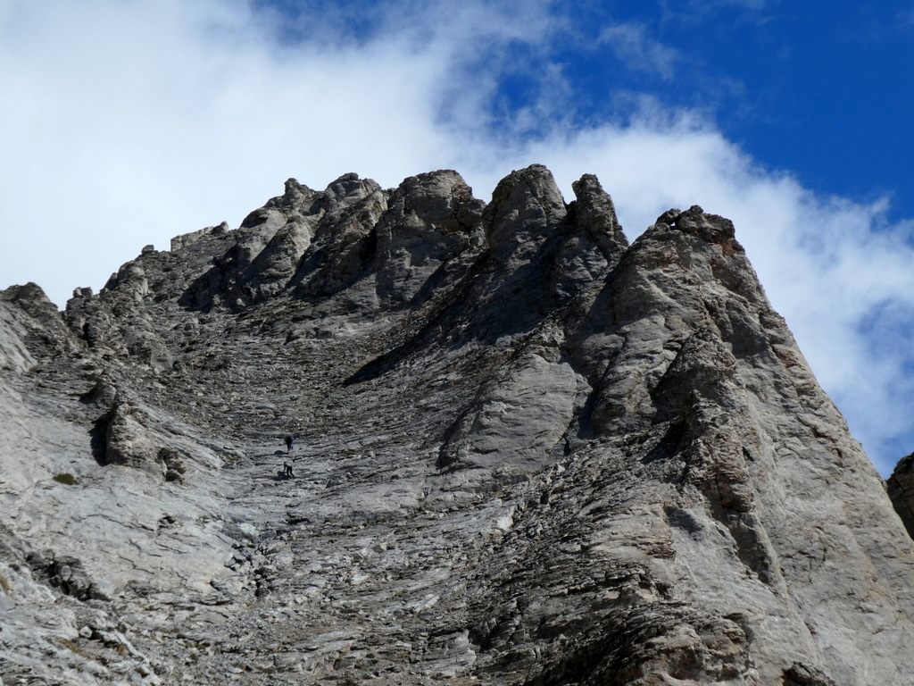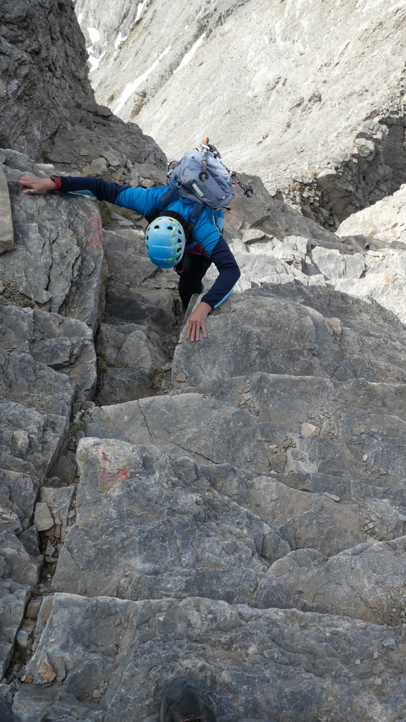 Questa cresta (chiamata Kakoskala) è la parte più impegnativa (passi di II). La si segue abbastanza fedelmente (seguire i bolli gialli) fino a trovarsi sotto la parte finale, una parete che porta in vetta.