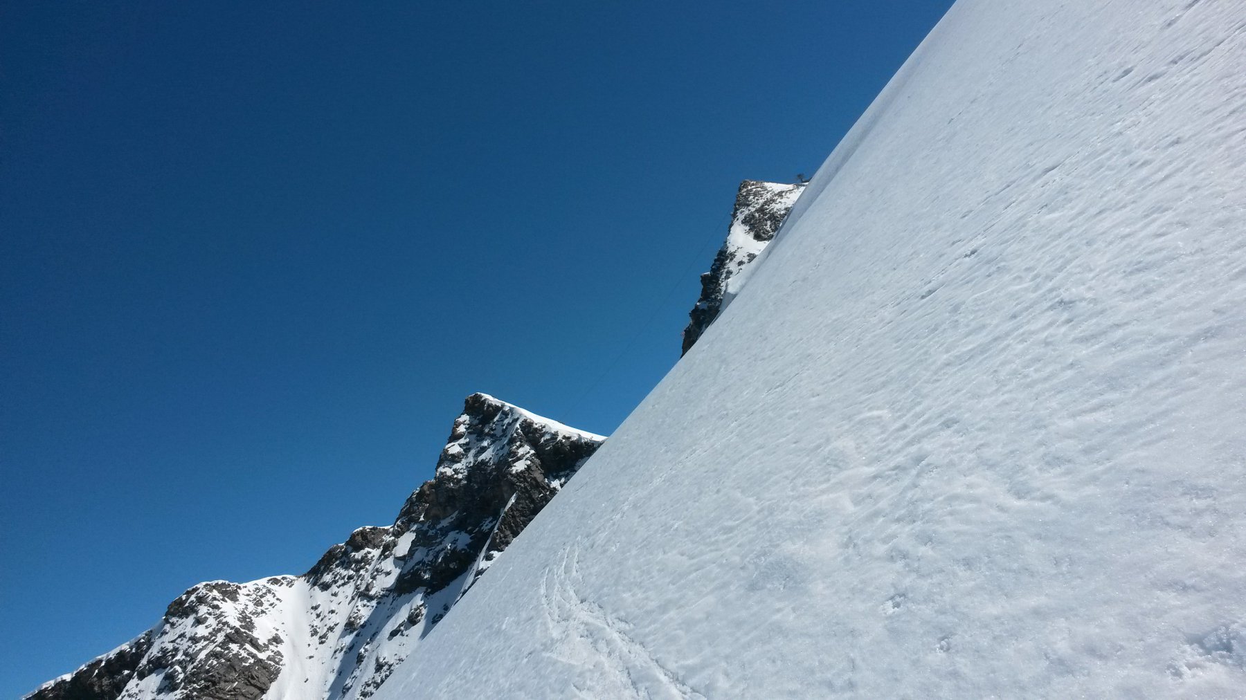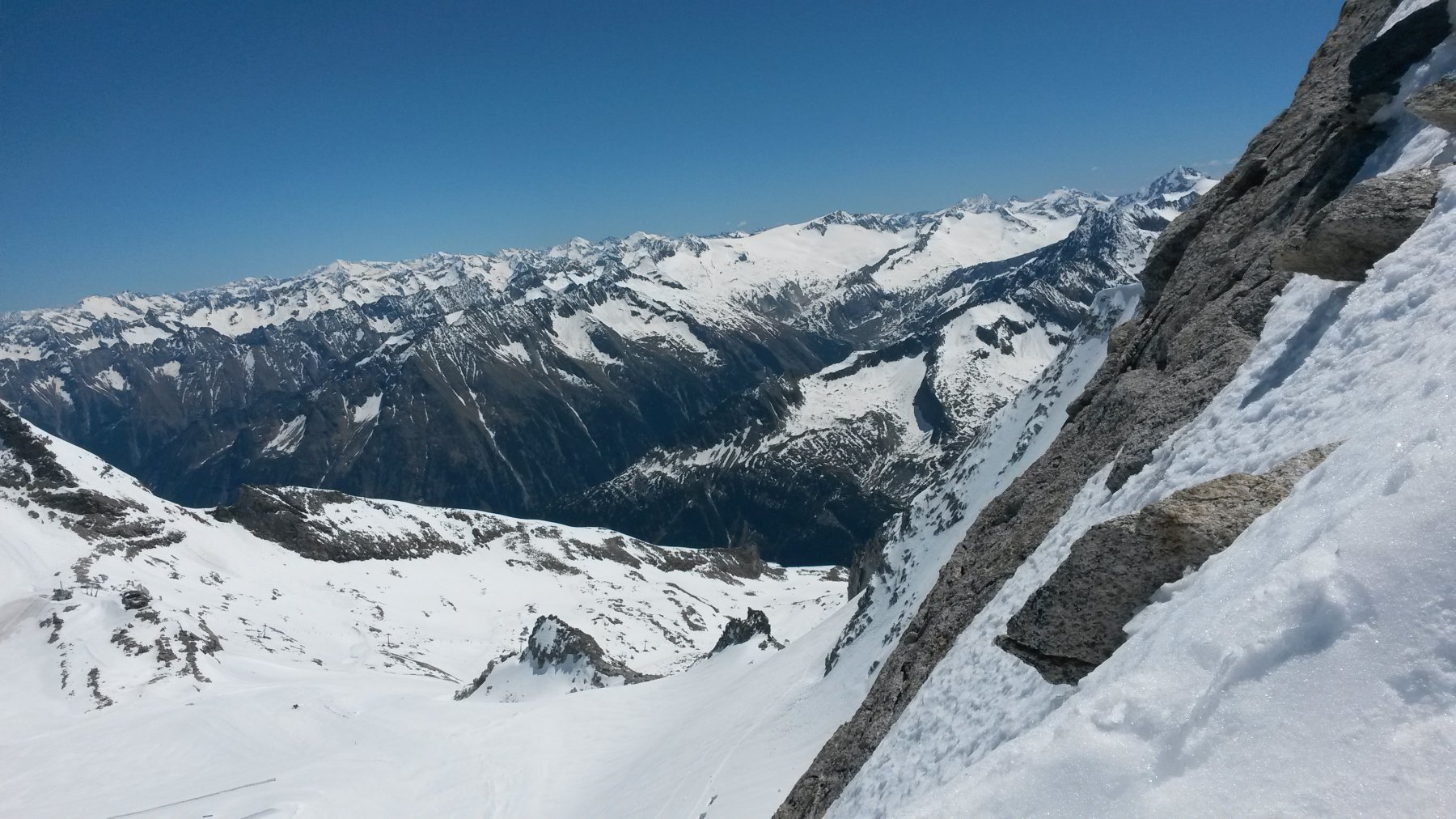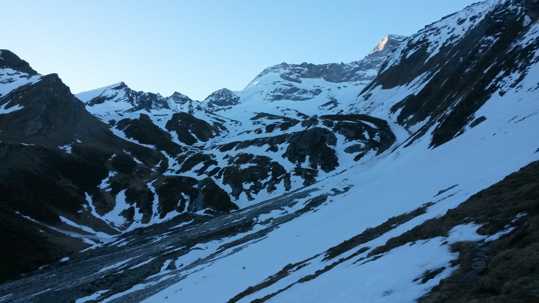 Dalla Issalm, dove finisce la strada forestale, attraversare in quota i pendii della sinistra orografica seguendo la traccia estiva (Wildlahnerweg, sentiero 525 per la Gerarer Hutte – cartelli gialli) fino a raggiungere l’ampio pianoro di quota 2089m con l’Olperer di fronte. Le balze rocciose che chiudono ad anfiteatro la vista si superano sulla destra (sinistra orografica) per l’evidente greto innevato del torrente, solitamente ricoperto da impressionanti resti di valanga (come ci ricorda Iacopelli nel suo libro, “Wildlahnertal” in Tedesco significa “valle della slavina selvaggia”). Con pendenza costante si sale più o meno in linea retta fino ad arrivare nei pressi di una piccola elevazione chiamata Wetterkreuz e contrassegnata appunto da una croce (quota 2500 circa). Ora lo scenario si apre in un immenso pianoro con le seraccate dell’Olpererferner sullo sfondo. Piegando a sinistra si raggiungerebbero la Hollenscharte ed il Klenier Kaserer, mentre volgendo progressivamente a destra si prosegue per l’Olperer ricongiungendosi con l’itinerario dalla Valsertal (salita alternativa). Seguendo le ondulazioni della vasta piana, è possibile aggirare sulla destra la Wildlahnergrat (la modesta cresta che, scendendo da sinistra a destra rispetto alla direzione di marcia, delimita il ghiacciaio pensile dell’Olperer che abbiamo sopra di noi) e mettere piede sul ghiacciaio dopo un ultimo strappo un po’ più ripido (quota 2700m circa). A questo punto è necessaria la massima attenzione nella scelta della traccia, dato che il ghiacciaio, per quanto piccolino, è pieno di crepacci nella sua zona centrale. La traccia più sicura si limita a stare più a sinistra possibile costeggiando le roccette della cresta. I primi 300 metri sono una specie di ripido pendio-canale, poi, da quota 3000 in su, la pendenza si abbatte (ma in compenso aumenta l’esposizione, dato che, alla nostra sinistra, il ghiacciaio precipita in suggestivi seracchi sul pianoro da cui lo guardavamo prima). Gli ultimi 200 metri di dislivello prima della Wildlahnerscharte sono un non ripido ma spettacolare traverso sotto i grandi seracchi che scendono dalla cima. Qualche blocco di ghiaccio staccatosi qua e là consiglia di non attardarsi in questa zona. Appena usciti da questa naturale balconata si giunge (purtroppo) nei pressi di uno skilift (quota 3220m) che sale dal Tuxerferner (impianti di sci estivo). Scegliere se lasciare qui le ciaspole (con il rischio che qualche bambino se le pigli) o se portarle un po’ più in alto. In caso di buon innevamento, è infatti possibile risalire il pendio che costeggia la cresta nord (alla nostra destra) per ulteriori 100-150m di dislivello, fino al deposito sci su cui si cala in doppia chi scende dalla vetta. Comunque necessari da qui ramponi e picozza con neve dura. Arrivati a quota 3300m circa, con 15m di dislivello alla nostra sinistra (roccette elementari o, in caso di buon innevamento, breve traverso innevato di solito tracciatissimo) raggiungere il filo di cresta proprio in corrispondenza dell’inizio delle difficoltà alpinistiche (segnalate dalla presenza di maniglioni di ferro per far sicura e progredire nei punti più esposti o strapiombanti).