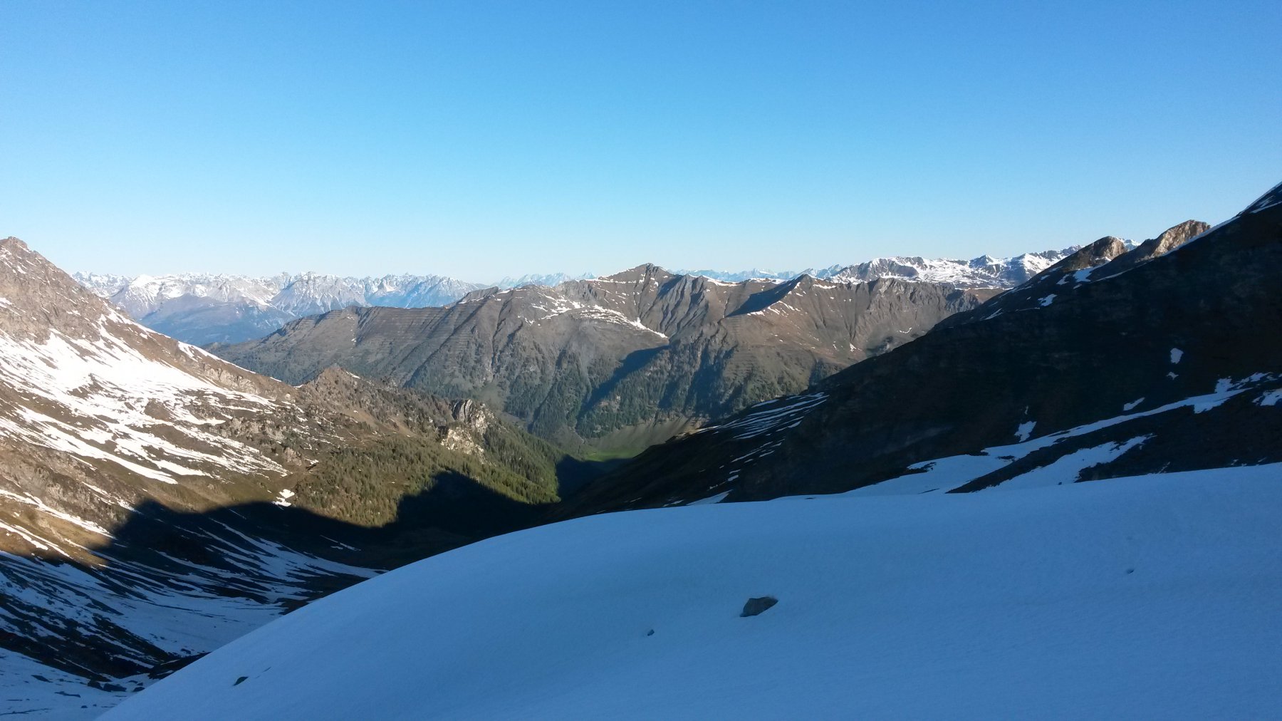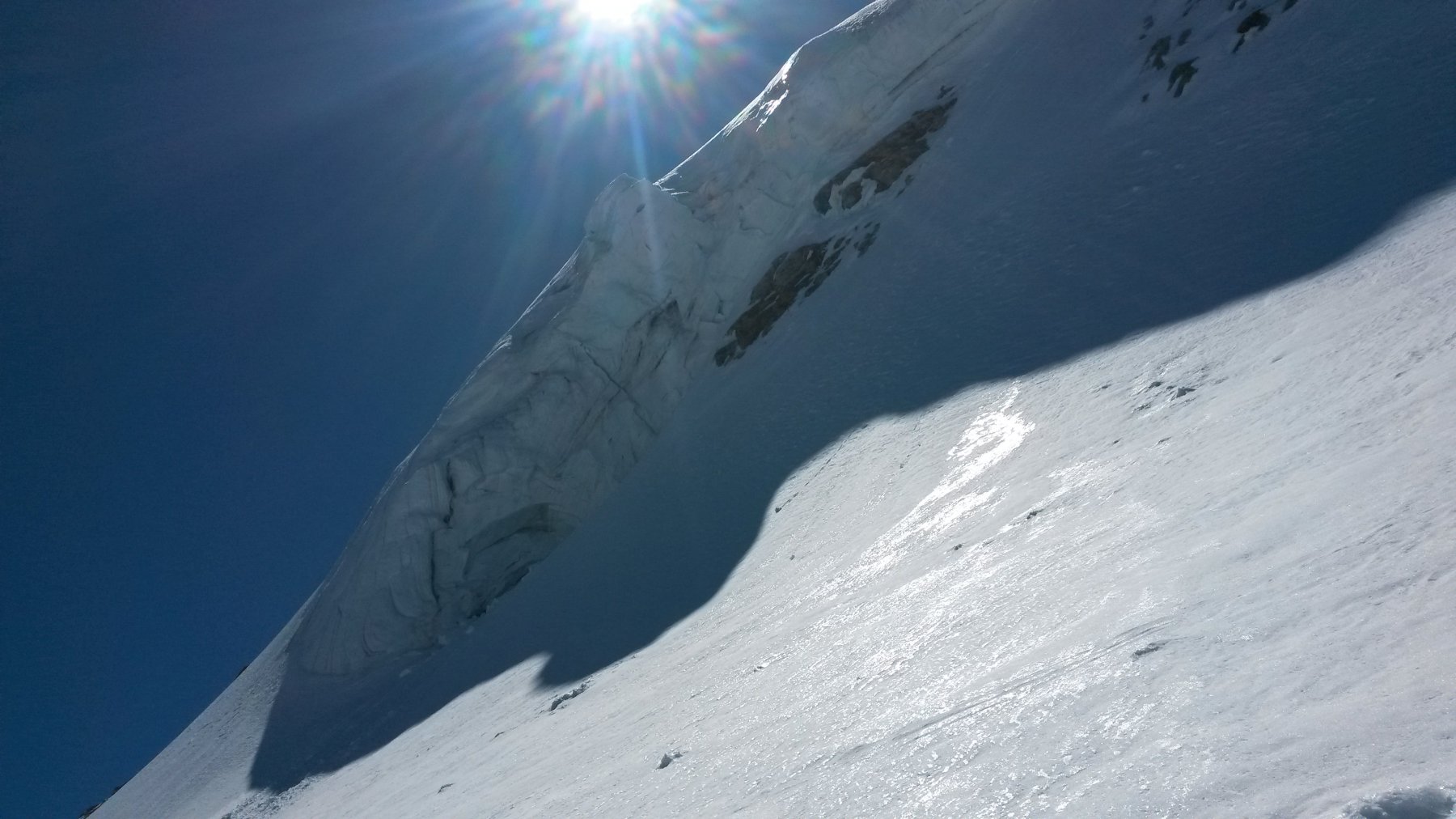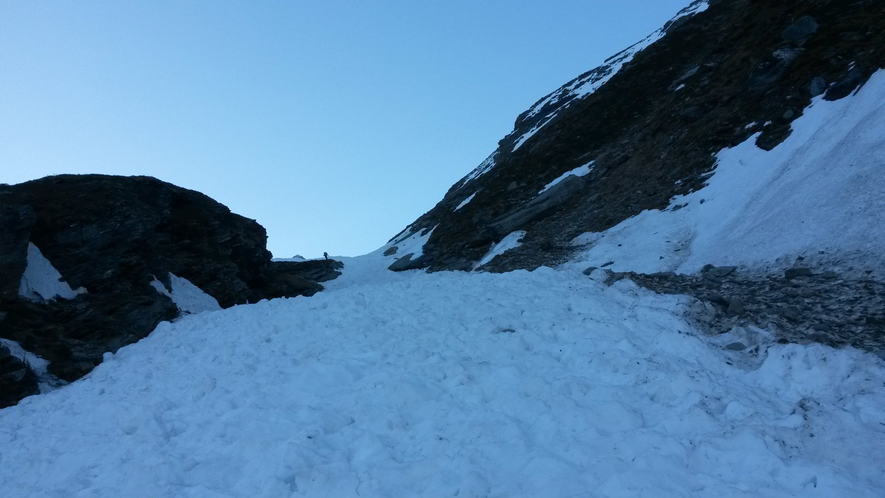 Dalla Issalm, dove finisce la strada forestale, attraversare in quota i pendii della sinistra orografica seguendo la traccia estiva (Wildlahnerweg, sentiero 525 per la Gerarer Hutte – cartelli gialli) fino a raggiungere l’ampio pianoro di quota 2089m con l’Olperer di fronte. Le balze rocciose che chiudono ad anfiteatro la vista si superano sulla destra (sinistra orografica) per l’evidente greto innevato del torrente, solitamente ricoperto da impressionanti resti di valanga (come ci ricorda Iacopelli nel suo libro, “Wildlahnertal” in Tedesco significa “valle della slavina selvaggia”). Con pendenza costante si sale più o meno in linea retta fino ad arrivare nei pressi di una piccola elevazione chiamata Wetterkreuz e contrassegnata appunto da una croce (quota 2500 circa). Ora lo scenario si apre in un immenso pianoro con le seraccate dell’Olpererferner sullo sfondo. Piegando a sinistra si raggiungerebbero la Hollenscharte ed il Klenier Kaserer, mentre volgendo progressivamente a destra si prosegue per l’Olperer ricongiungendosi con l’itinerario dalla Valsertal (salita alternativa). Seguendo le ondulazioni della vasta piana, è possibile aggirare sulla destra la Wildlahnergrat (la modesta cresta che, scendendo da sinistra a destra rispetto alla direzione di marcia, delimita il ghiacciaio pensile dell’Olperer che abbiamo sopra di noi) e mettere piede sul ghiacciaio dopo un ultimo strappo un po’ più ripido (quota 2700m circa). A questo punto è necessaria la massima attenzione nella scelta della traccia, dato che il ghiacciaio, per quanto piccolino, è pieno di crepacci nella sua zona centrale. La traccia più sicura si limita a stare più a sinistra possibile costeggiando le roccette della cresta. I primi 300 metri sono una specie di ripido pendio-canale, poi, da quota 3000 in su, la pendenza si abbatte (ma in compenso aumenta l’esposizione, dato che, alla nostra sinistra, il ghiacciaio precipita in suggestivi seracchi sul pianoro da cui lo guardavamo prima). Gli ultimi 200 metri di dislivello prima della Wildlahnerscharte sono un non ripido ma spettacolare traverso sotto i grandi seracchi che scendono dalla cima. Qualche blocco di ghiaccio staccatosi qua e là consiglia di non attardarsi in questa zona. Appena usciti da questa naturale balconata si giunge (purtroppo) nei pressi di uno skilift (quota 3220m) che sale dal Tuxerferner (impianti di sci estivo). Scegliere se lasciare qui le ciaspole (con il rischio che qualche bambino se le pigli) o se portarle un po’ più in alto. In caso di buon innevamento, è infatti possibile risalire il pendio che costeggia la cresta nord (alla nostra destra) per ulteriori 100-150m di dislivello, fino al deposito sci su cui si cala in doppia chi scende dalla vetta. Comunque necessari da qui ramponi e picozza con neve dura. Arrivati a quota 3300m circa, con 15m di dislivello alla nostra sinistra (roccette elementari o, in caso di buon innevamento, breve traverso innevato di solito tracciatissimo) raggiungere il filo di cresta proprio in corrispondenza dell’inizio delle difficoltà alpinistiche (segnalate dalla presenza di maniglioni di ferro per far sicura e progredire nei punti più esposti o strapiombanti).