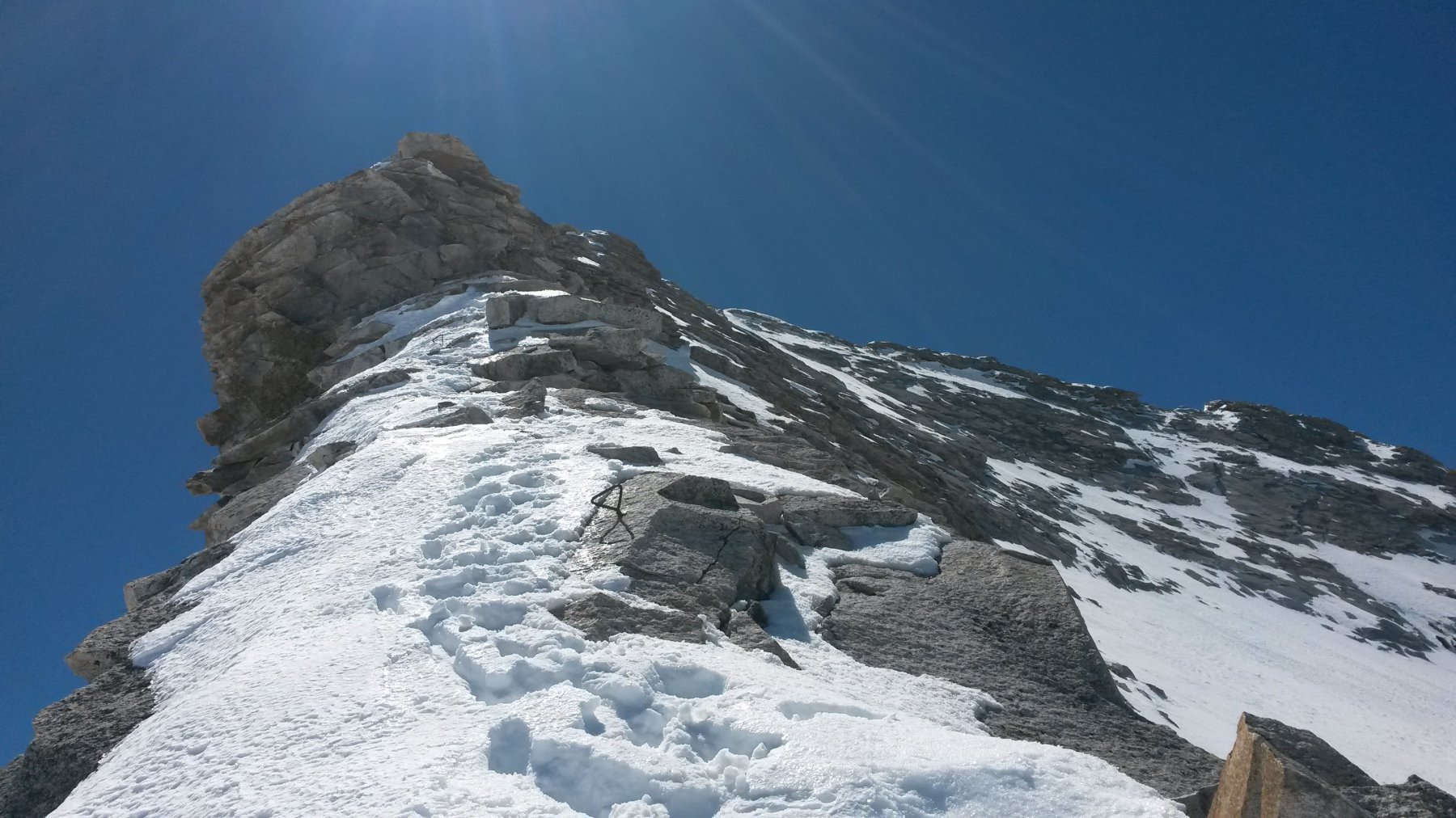 Si attacca ora la cresta N, con passaggi di II/III su roccia (fittoni metallici per assicurarsi) e seguirla fino alla croce di vetta. Difficoltà variabile a seconda delle condizioni.
