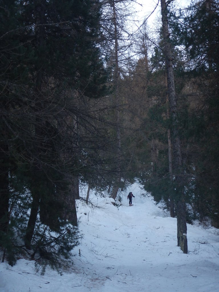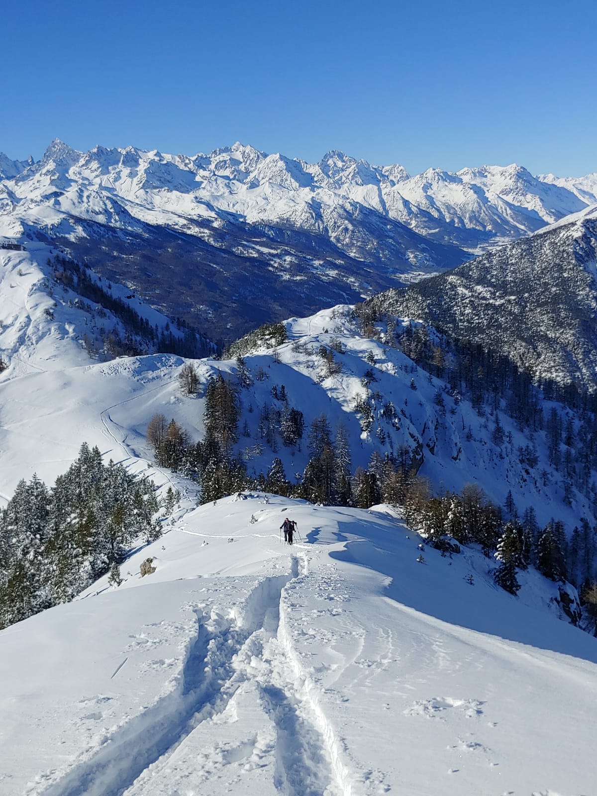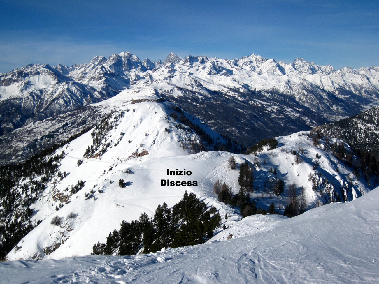 La discesa si effettua traversando la cima direzione E poi subito nel bosco per pendii ripidi lungo canalone naturale. Su pendii meno ripidi si arriva ai Ch. du Vallon e per stradina con varianti nel bosco si giunge al luogo di partenza.