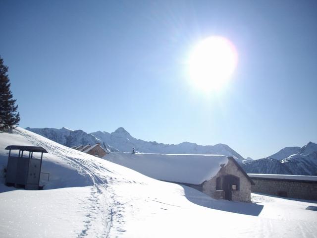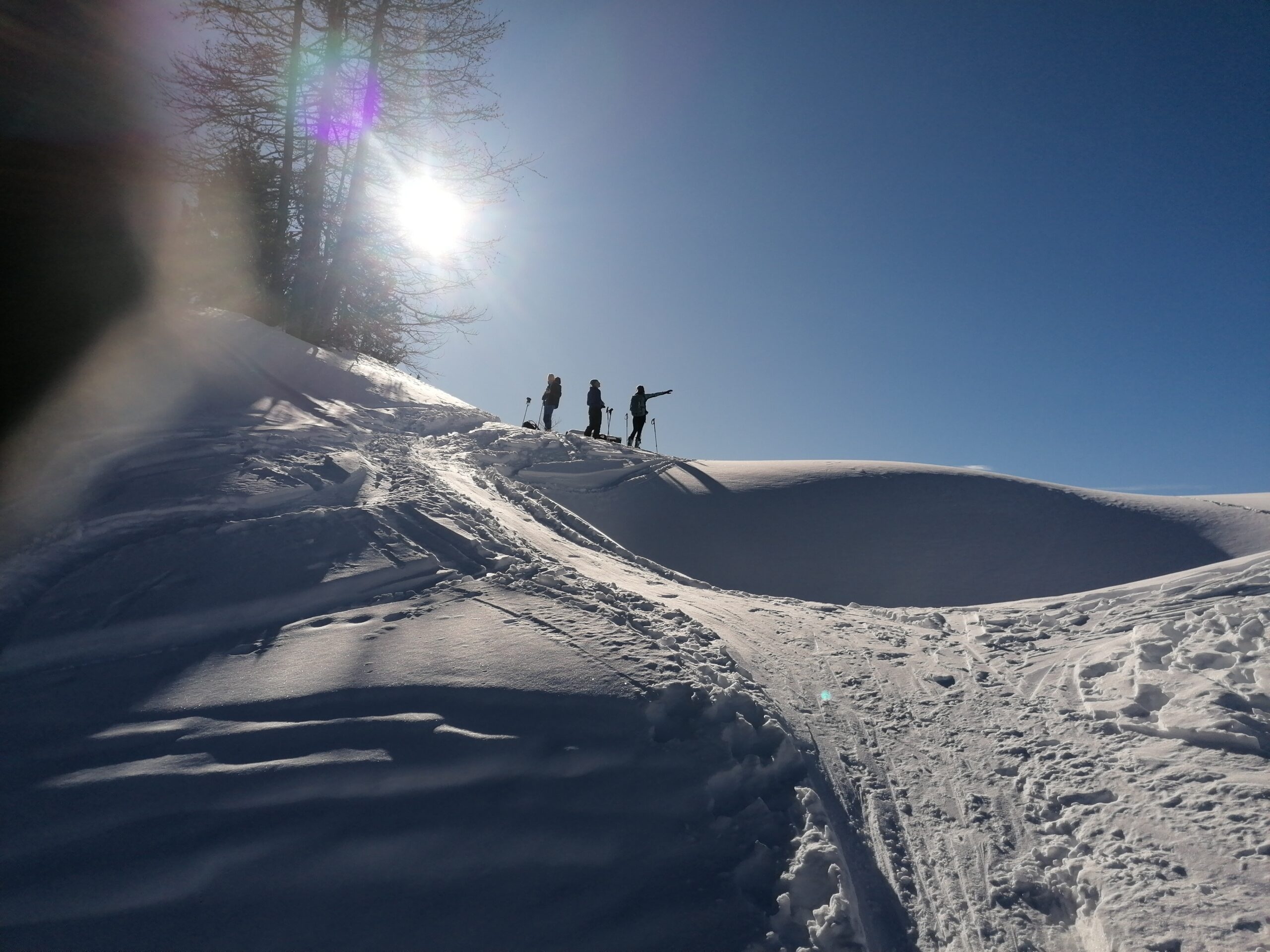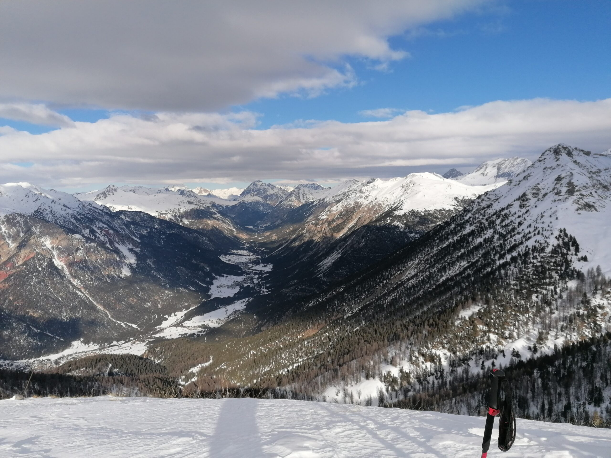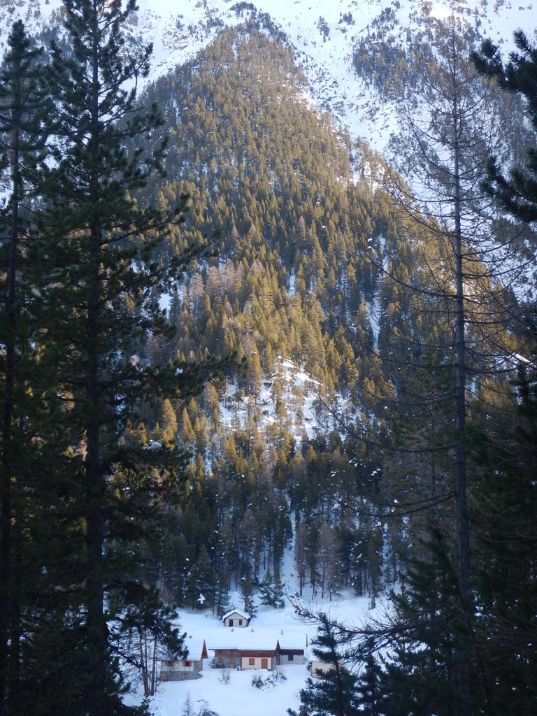 La discesa si effettua traversando la cima direzione E poi subito nel bosco per pendii ripidi lungo canalone naturale. Su pendii meno ripidi si arriva ai Ch. du Vallon e per stradina con varianti nel bosco si giunge al luogo di partenza.