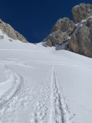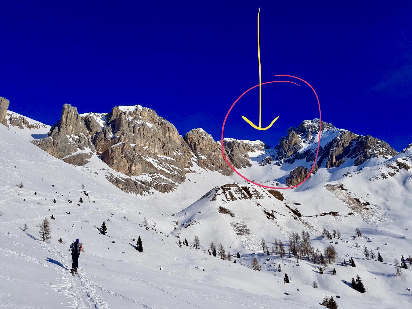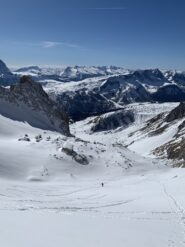Si scarta decisamente sulla destra e dopo un lungo traverso in leggera salita si imbocca il vallone che conduce all’evidente forcella del Bachet (quota 2836). Dalla forcella si prosegue a piedi a sinistra lungo il pendio finale che conduce alla Cima Ombrettola, che si supera evitando a sinistra alcune roccette.